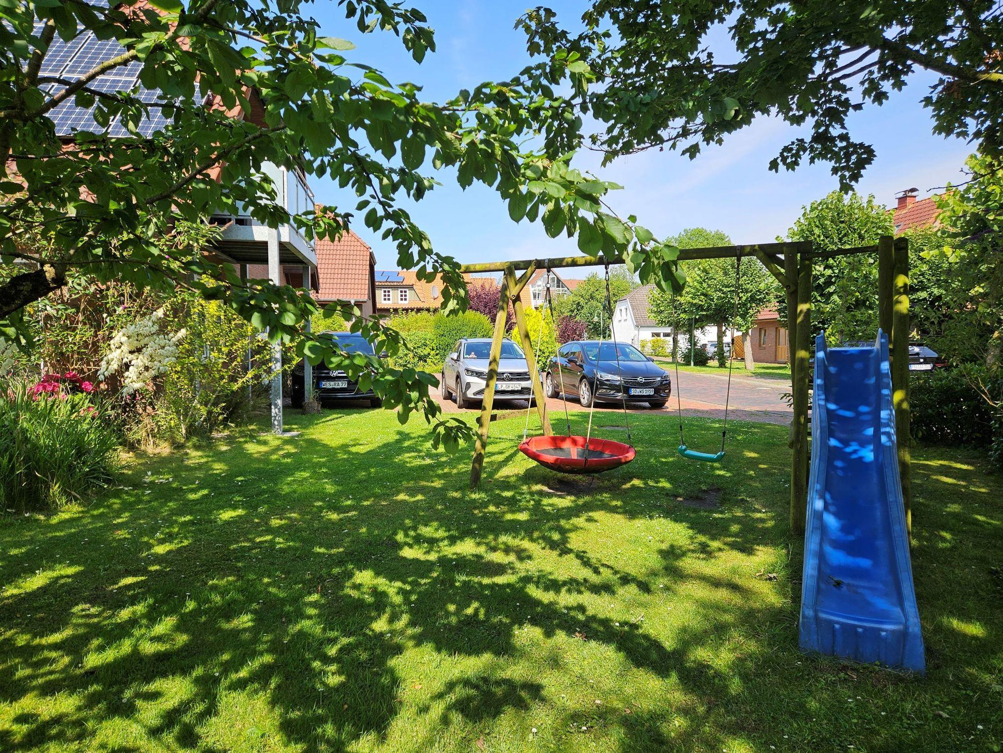 Zum Haus gehört ein Garten, in dem Sitz- und Liegemöglichkeiten, eine Tischtennisplatte sowie verschiedene Spielgeräte für Kinder, wie z. B. ein Trampolin bereit stehen.