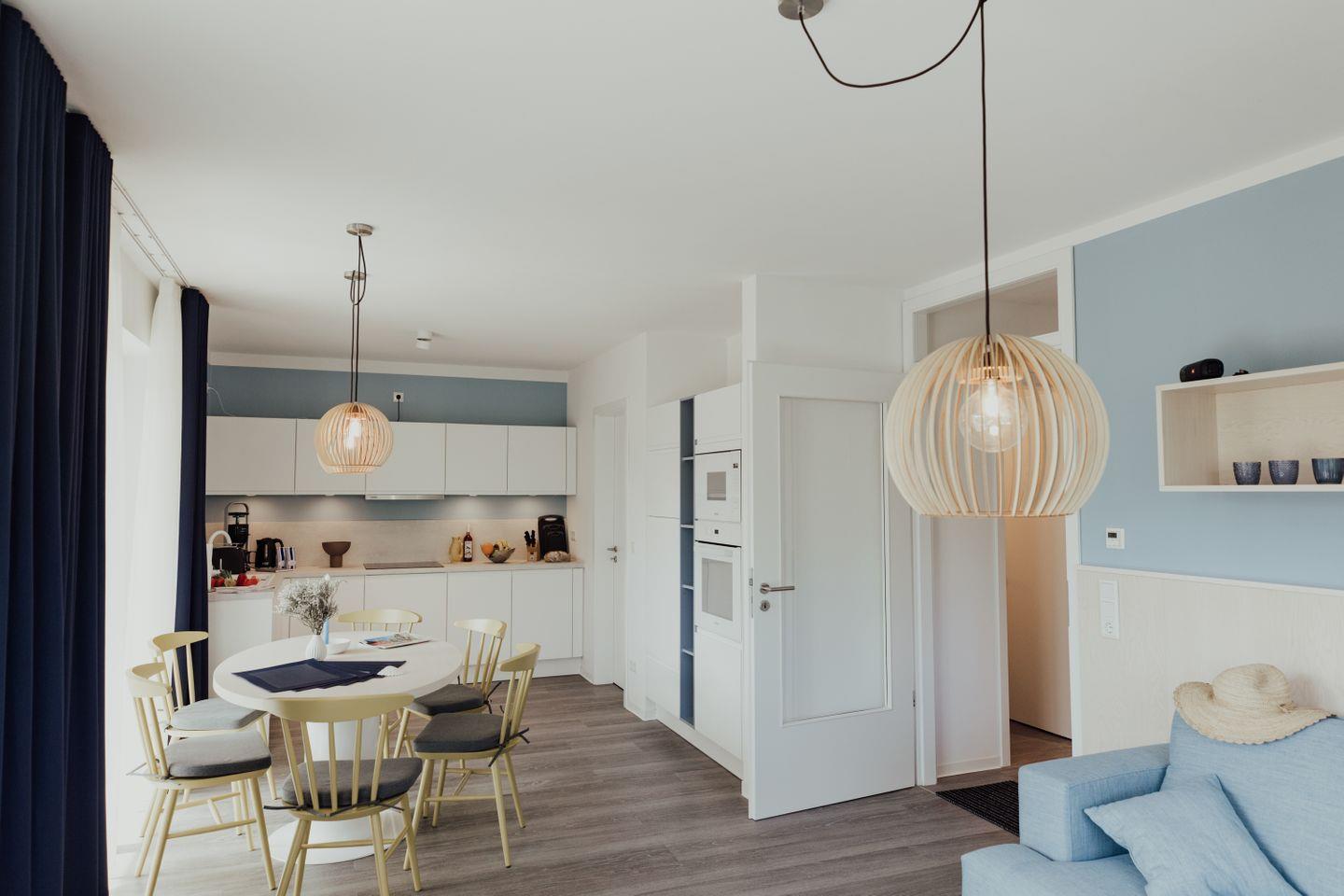 Die exklusive Ausstattung der Ferienwohnung in Küstennähe lässt dabei keine Wünsche offen und garantiert einen komfortablen Aufenthalt. In der hochwertigen Küche lassen sich leckere Speisen schnell und einfach zubereiten. Ein großer Smart-TV sowie diverse Gesellschaftsspiele für die ganze Familie stehen für gemeinsame Abende im großzügigen Wohn- und Essbereich zur Verfügung. Zwei separate Bäder mit modernen Extras bieten genügend Platz für bis zu 6 Personen. Ein besonderes Highlight der Wohnung ist die Infrarot-Wärmekabine im Flur, die für Wellnessmomente in privater Atmosphäre sorgt.