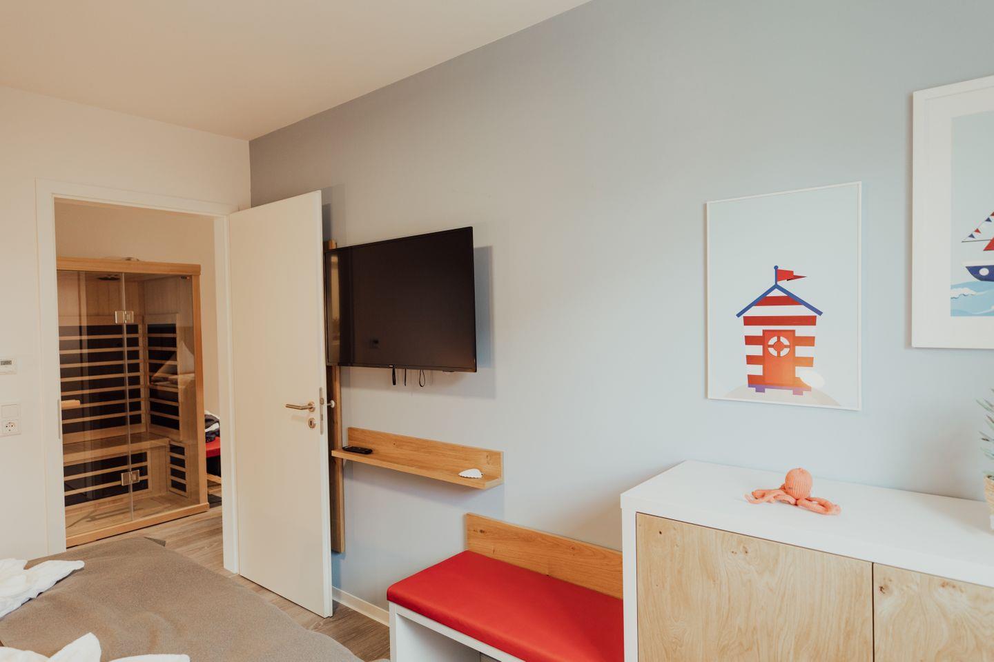 Die großzügigen Schlafzimmer, der gemütliche Wohn- und Essbereich sowie das hochwertig eingerichtete Badezimmer tragen zu einem besonderen Urlaubserlebnis bei. Die exklusive Ausstattung der Ferienwohnung bietet zahlreiche Annehmlichkeiten. Genießen Sie beispielsweise Wellnessmomente in der Infrarot-Wärmekabine, entspannen Sie in bequemen Boxspringbetten oder nutzen Sie die Sonnenstunden im eigenen Strandkorb. Die hochwertig ausgestattete Küche begeistert Hobbyköche und Genießer gleichermaßen.
