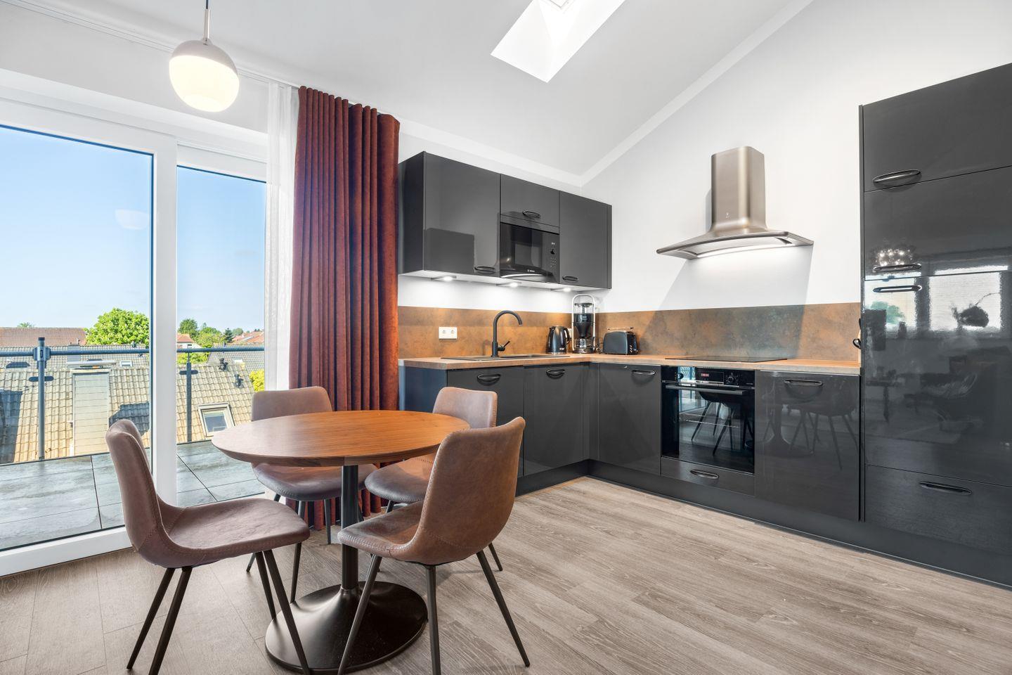 Das exklusive Penthouse "Haubentaucher" mit 18 m² Dachterrasse mit einem Abstellraum und Strandkorb lädt zu Sonnenbädern ein. Das 73 m² Apartment bietet zwei geräumige Schlafzimmer, einen offenen Wohn- und Essbereich, eine voll ausgestattete Küche und ein hochwertiges Badezimmer. Die moderne Ausstattung umfasst eine Küche mit zahlreichen Extras, eine geschmackvolle Einrichtung und eine Infrarot-Wärmekabine für Wellnessmomente.