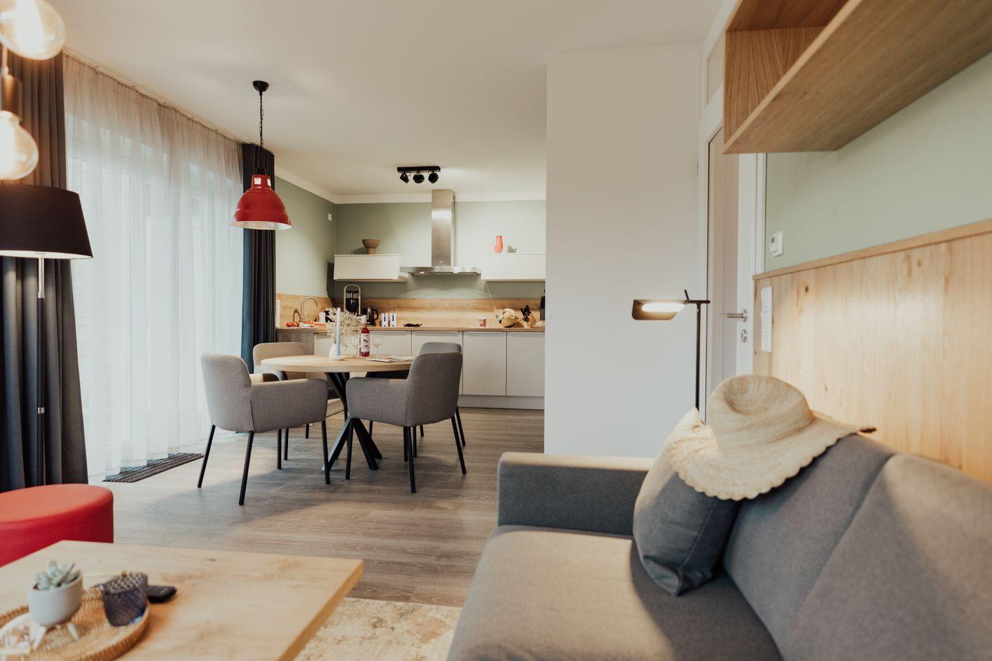 Der geräumige Wohn- und Essbereich lädt zum gemeinsamen Entspannen oder geselligen Spieleabenden ein, während die hochwertige Küche über viele Extras für leckere Speisen verfügt. Das Besondere: Die Ferienwohnung bietet eine exklusive Wellness-Ausstattung mit integrierter Infrarot-Wärmekabine und modernem Badezimmer. Ein eigener Strandkorb, ein sicherer Zimmersafe sowie ein abschließbarer Fahrradraum mit 220 Volt Ladeanschluss für E-Bikes sind weitere Ausstattungshighlights.