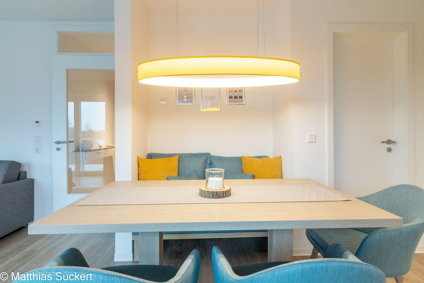 Das stilvoll eingerichtete Wohnzimmer ist der zentrale Treffpunkt der Unterkunft. Hier können Sie auf der bequemen Sofaecke entspannen oder sich bei einem Filmabend vor einem der drei vorhandenen Fernseher unterhalten. Für gesellige Abende mit der Familie steht ein Esstisch zur Verfügung, der Platz für alle Gäste bietet. Der Blick aus dem Wohnzimmer auf den Garten sorgt für eine angenehme Atmosphäre und lädt zu entspannten Stunden ein.