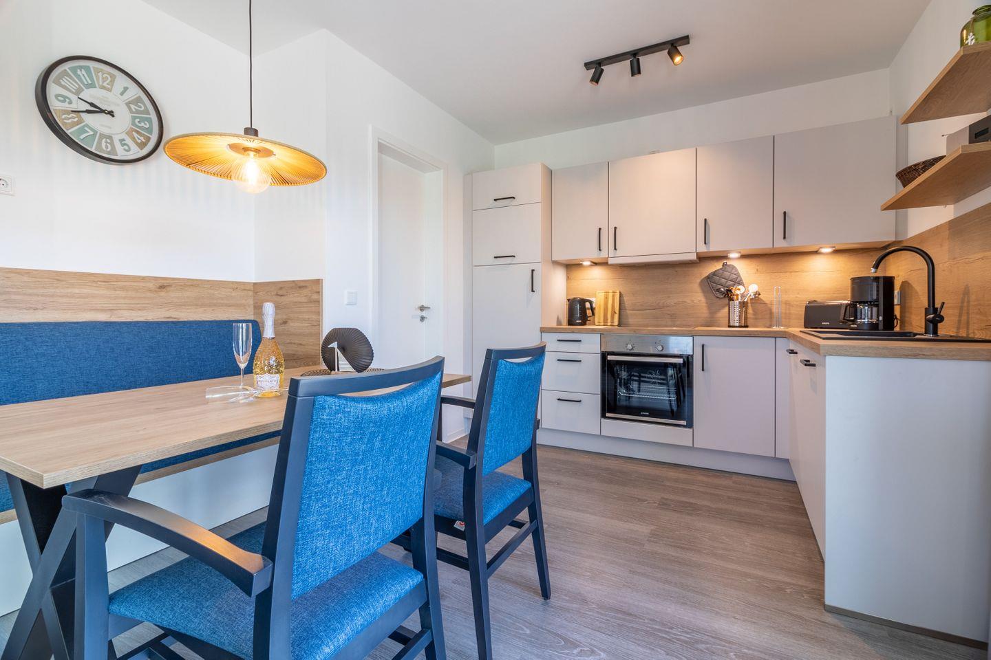 Die Wohnung bietet eine gehobene Ausstattung und lässt keine Wünsche offen. Entspannen Sie sich in der exklusiven Wellness-Oase mit integrierter Infrarotwärmekabine und stimmungsvoller Ambiente Beleuchtung, ideal nach einer Wanderung an kalten Tagen. Die Küche ist komplett ausgestattet und lädt mit einer gemütlichen Sitznische und einem großen Ecksofa zum Verweilen ein. Zur Ausstattung gehören auch eine Mikrowelle, ein Geschirrspüler, eine Kaffee-Filtermaschine und andere praktische Helfer. Ein Internet-Radio sorgt für Unterhaltung, während der große Smart-TV im Wohnbereich und in beiden Schlafzimmern multimediale Erlebnisse verspricht.