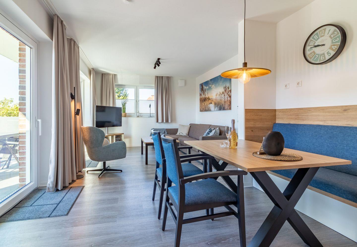 Herzlich willkommen in unserer im Jahr 2022 fertiggestellten Ferienwohnung Lee im Haus Borkum. Diese barrierearme, 82 m² große Wohnung im 1. Obergeschoss ist bequem mit dem Fahrstuhl zu erreichen.