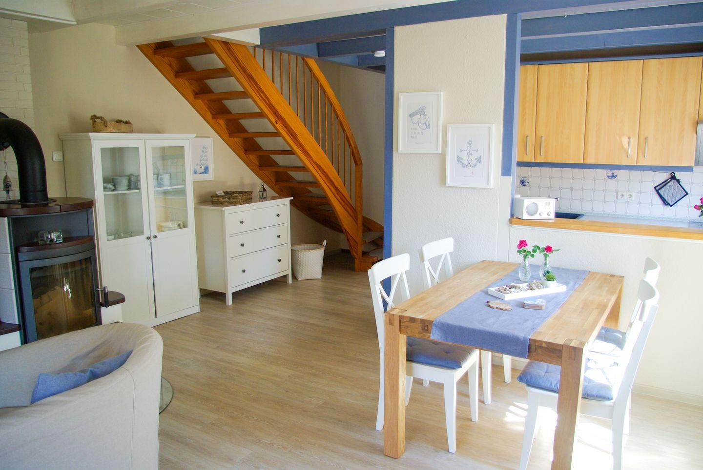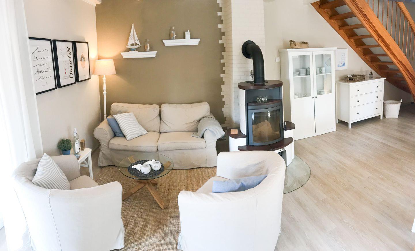 Ein weiteres Highlight ist die komfortable Wohnstube mit Kamin, die an kühleren Abenden für eine gemütliche Atmosphäre sorgt. Hier steht Ihnen auch ein TV zur Verfügung, sodass Sie sich nach einem Tag voller Aktivitäten entspannen und einen Filmabend genießen können. Die WLAN-Verbindung sorgt dafür, dass Sie auch während Ihres Urlaubs stets online bleiben können.