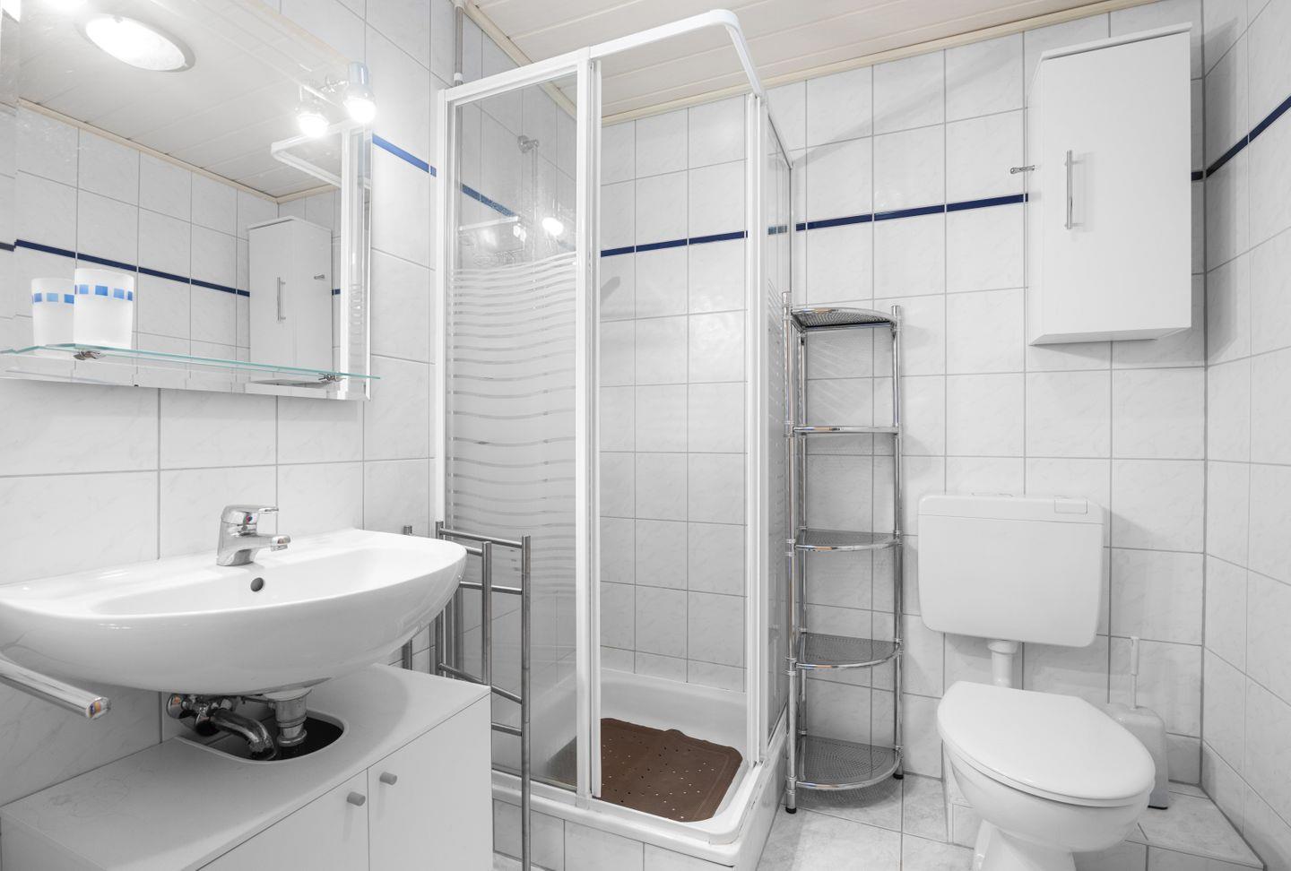 Im Erdgeschoss befindet sich ein Gäste-WC, während im Obergeschoss ein modernes Badezimmer mit Dusche auf Sie wartet. Eine Waschmaschine steht Ihnen ebenfalls zur Verfügung, sodass Sie auch während Ihres Aufenthalts immer frische Kleidung haben. Die großzügige Terrasse ist mit bequemen Stühlen, einer Liege und einem Sonnenschirm ausgestattet – perfekt für entspannte Stunden im Freien.