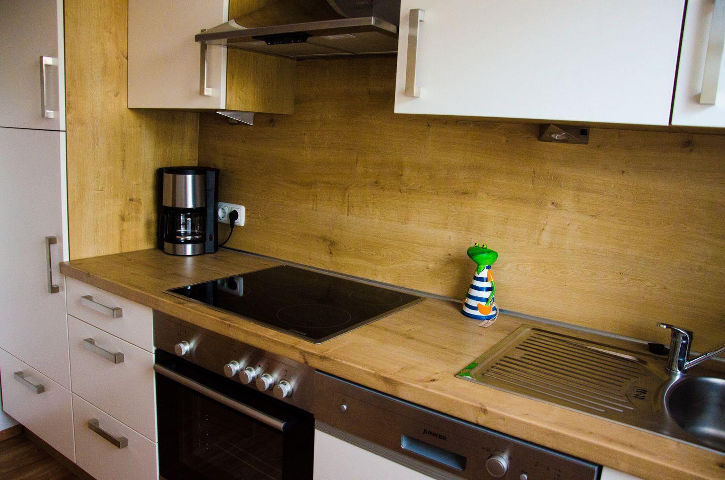 Im Erdgeschoss erwartet Sie ein modernes Duschbad sowie eine voll ausgestattete Küche mit Backofen, Herd, Kühlschrank mit Gefrierkombination und Geschirrspüler. Das Wohnzimmer mit separatem Essbereich ist mit einem Fernseher, DVD-Player und Radio ausgestattet und bietet zudem direkten Zugang zur Terrasse.
