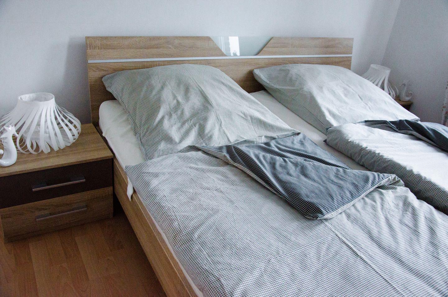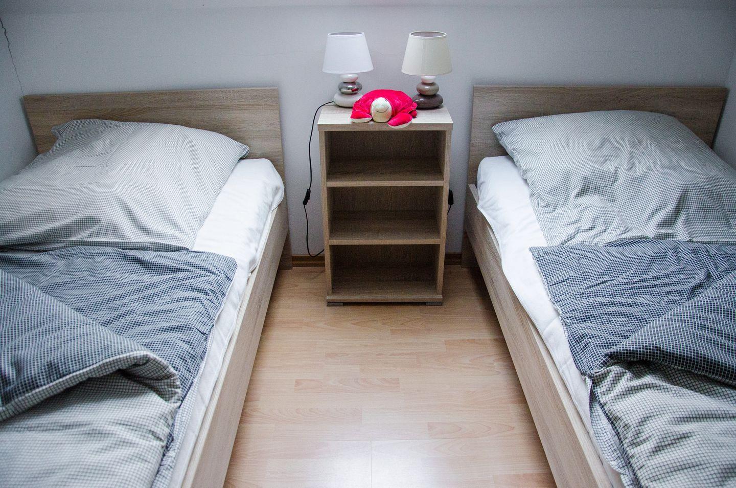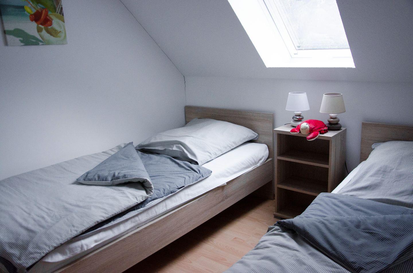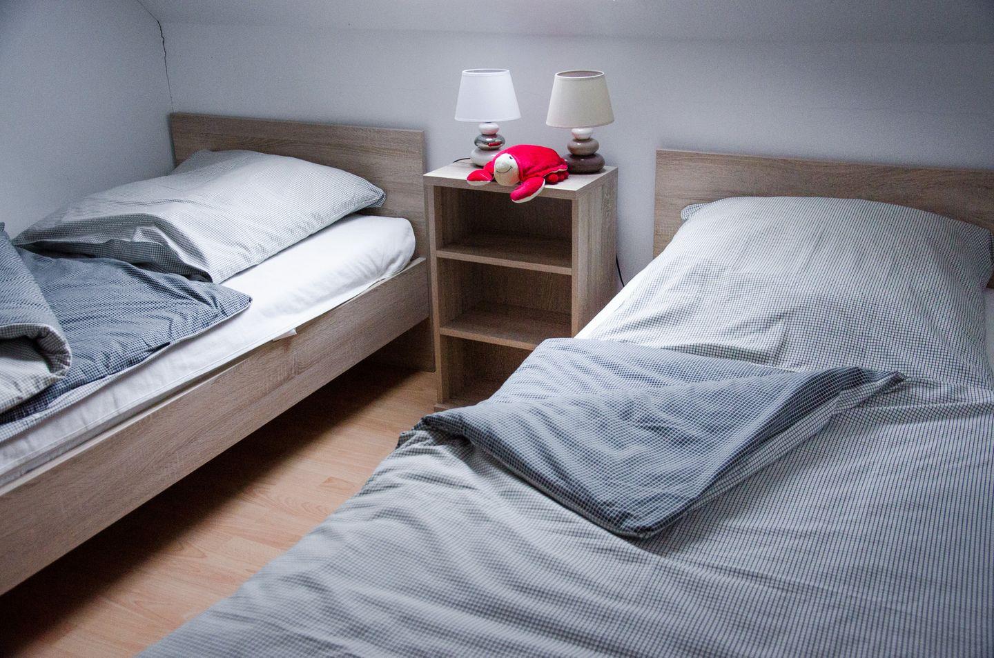 Im ersten Obergeschoss finden Sie zwei gemütliche Schlafzimmer – eines mit einem komfortablen Doppelbett und das andere mit zwei Einzelbetten – sowie ein großzügiges Duschbad. Ein weiterer Schlafbereich, mit einem 140 cm breiten Doppelbett mit durchgehender Matratze,