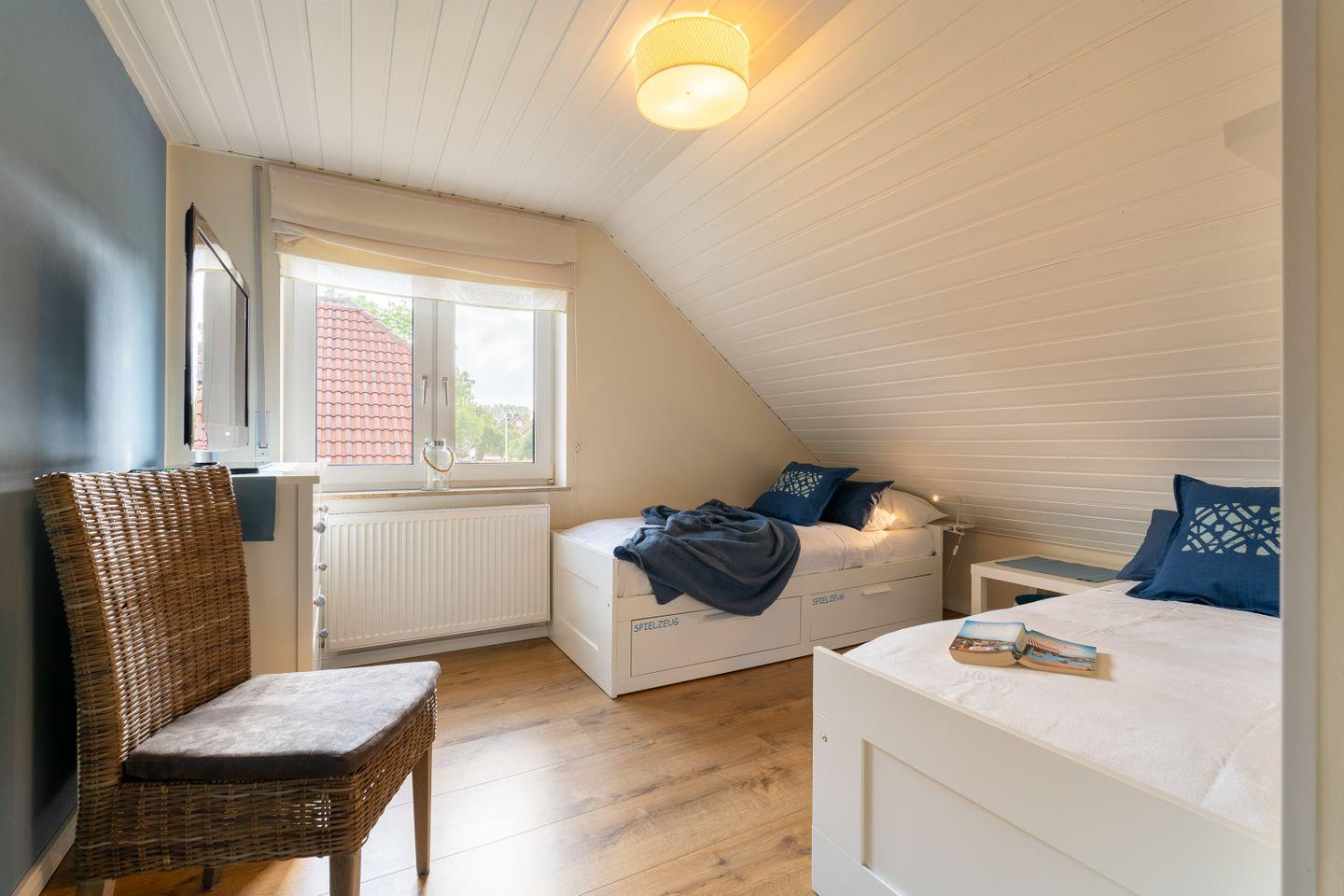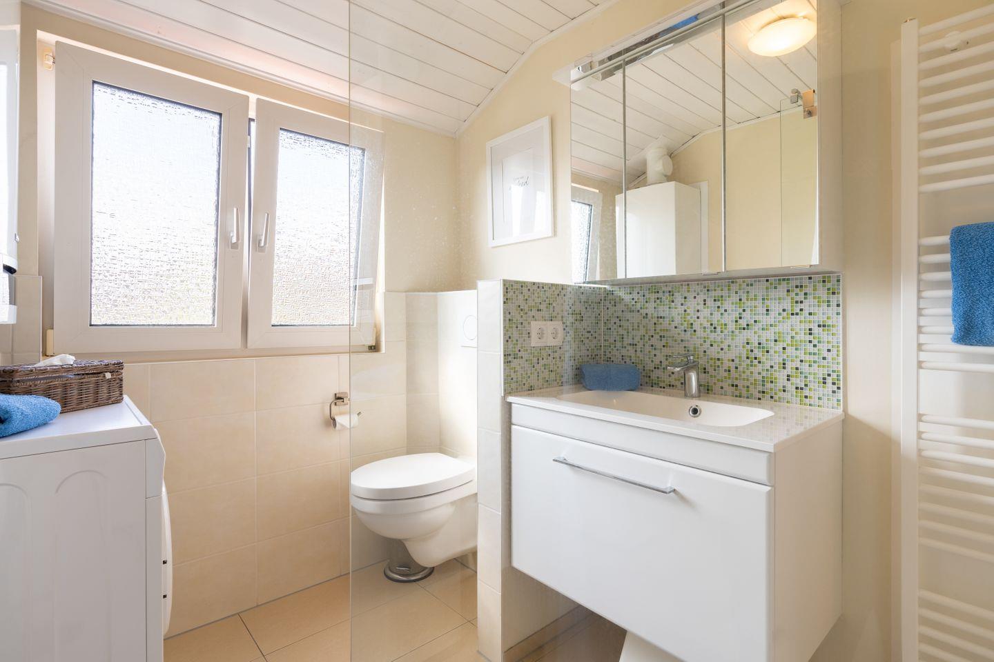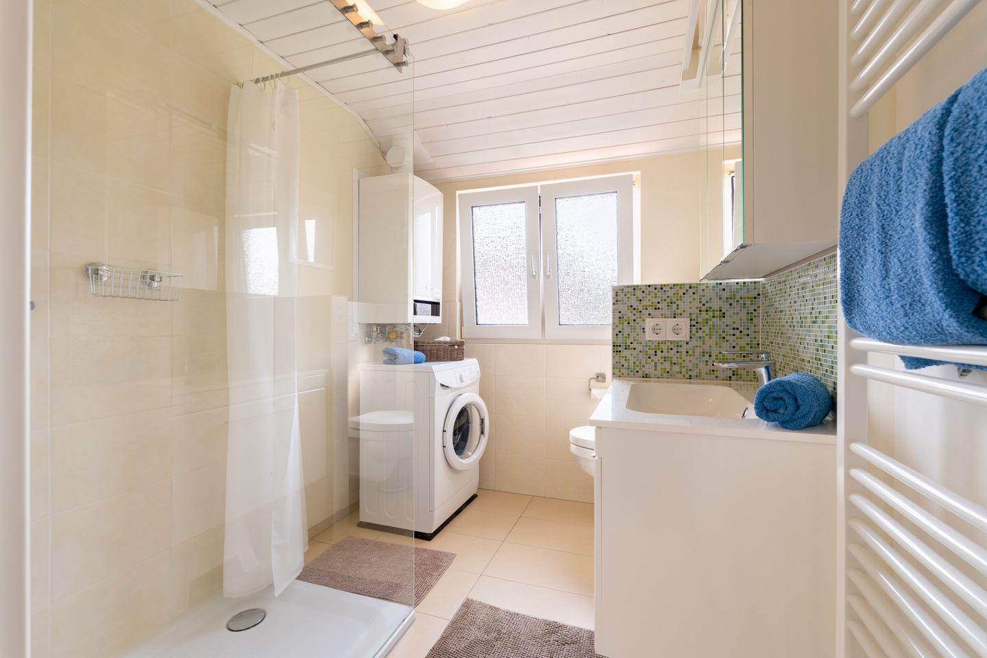 In der oberen Etage befinden sich die beiden Schlafzimmer, beide mit Jalousien und Fliegengitter ausgestattet. Das größere Schlafzimmer verfügt über ein Doppelbett (180x200) in Komforthöhe, eine Kommode und einen großen Kleiderschrank. Hier kann bei Bedarf ein Kinderreisebett zugestellt werden. Ein 40-Zoll-Smart TV steht ebenfalls zur Verfügung. Das zweite Schlafzimmer bietet zwei Einzelbetten, die bei Bedarf zu einem Doppelbett umgewandelt werden können. Hier finden Sie auch eine Kommode und einen weiteren 40-Zoll-Flatscreen-Fernseher. Im Obergeschoss befindet sich auch das moderne Badezimmer mit einer großen, ebenerdigen Dusche, Waschtisch, WC und Handtuchtrockner. Eine Waschmaschine ist ebenfalls vorhanden.