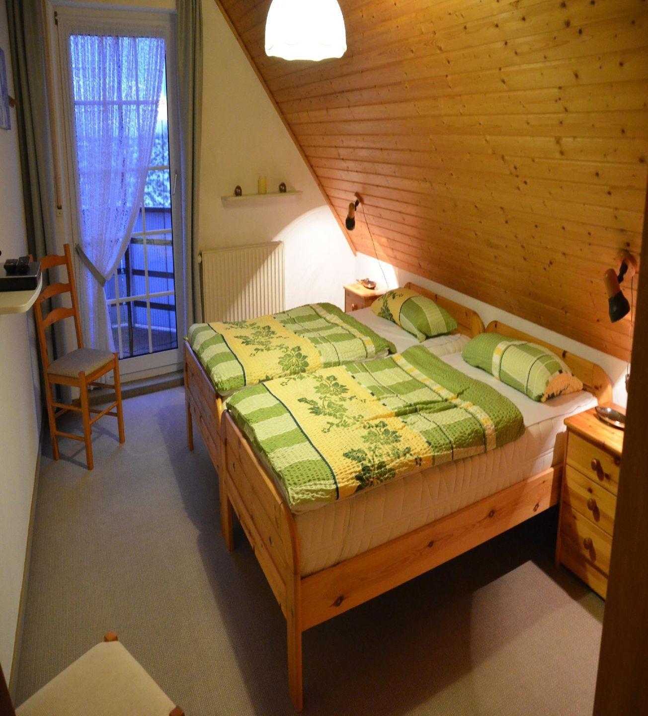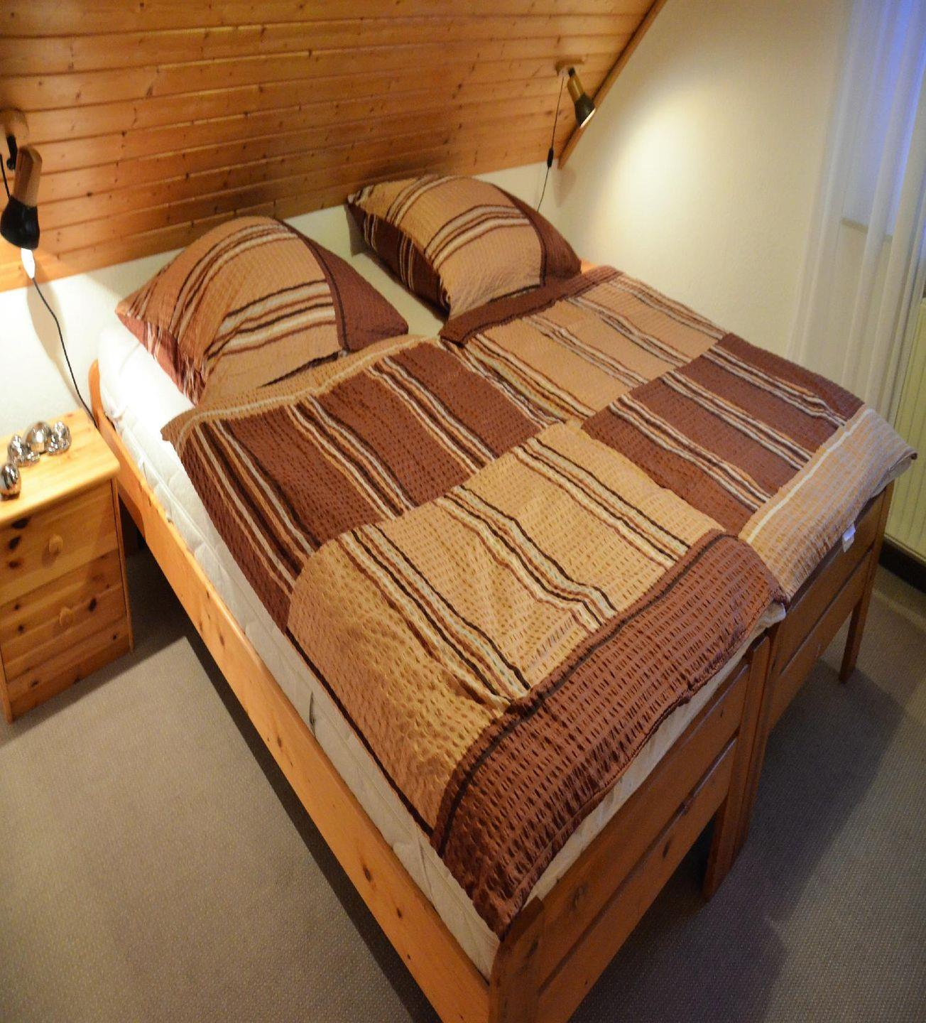 Die drei Schlafzimmer befinden sich im Obergeschoss und sind jeweils mit einem Doppelbett ausgestattet. In einem der Schlafzimmer befindet sich auch ein Kinderbett sowie ein Fernseher. Das Badezimmer verfügt über eine Dusche und eine Waschmaschine.