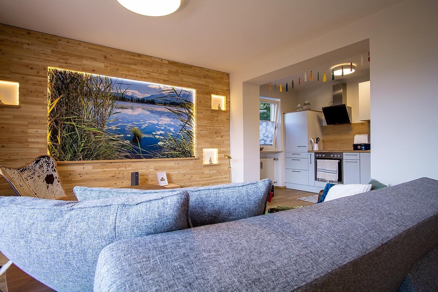 Die moderne komplett renovierte und gemütliche Ferienwohnung befindet sich in sehr ruhiger Lage oberhalb vom Hopfensee.