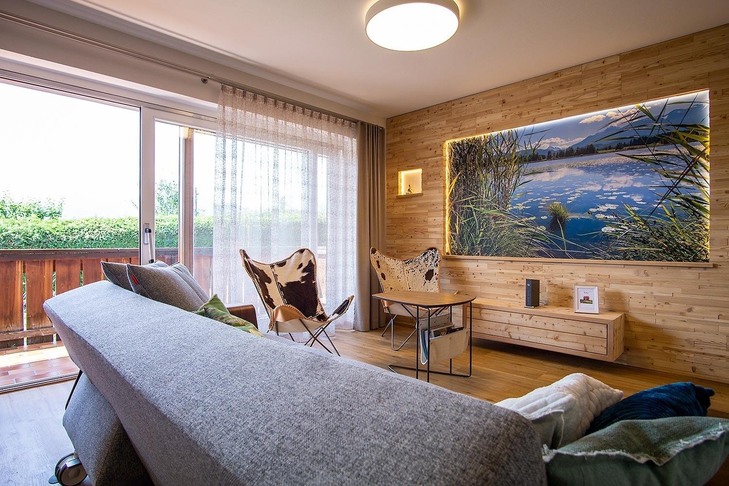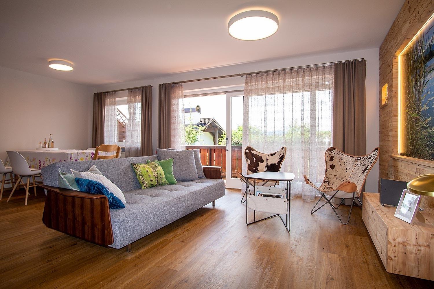 Sie verfügt über ein separates Schlafzimmer, ein freundliches Tageslicht Bad mit begehbarer Dusche, einer Handtuchheizung und einem großem Waschbecken. Zusätzlich gibt es ein separates WC, eine voll ausgestattete Küche mit Spülmaschine, Ceran Kochfeld, Backofen, Dunstabzug und Kühlschrank mit Gefrierfach. Im Wohn-Essbereich befindet sich ein großzügiges Schlafsofa für ein bis zwei Personen, Kabel TV, WLAN, und der Zugang zum Südbalkon mit herrlicher Bergsicht. Neben dem Haus ist eine Garage als Abstellplatz für zum Beispiel Fahrräder oder einen Kinderwagen, zusätzlich ist hier die Mülltonne und ein Mülltrennungssystem für umweltbewusstes Wohnen. Eine Waschmaschine im Keller kann mitbenutzt werden.