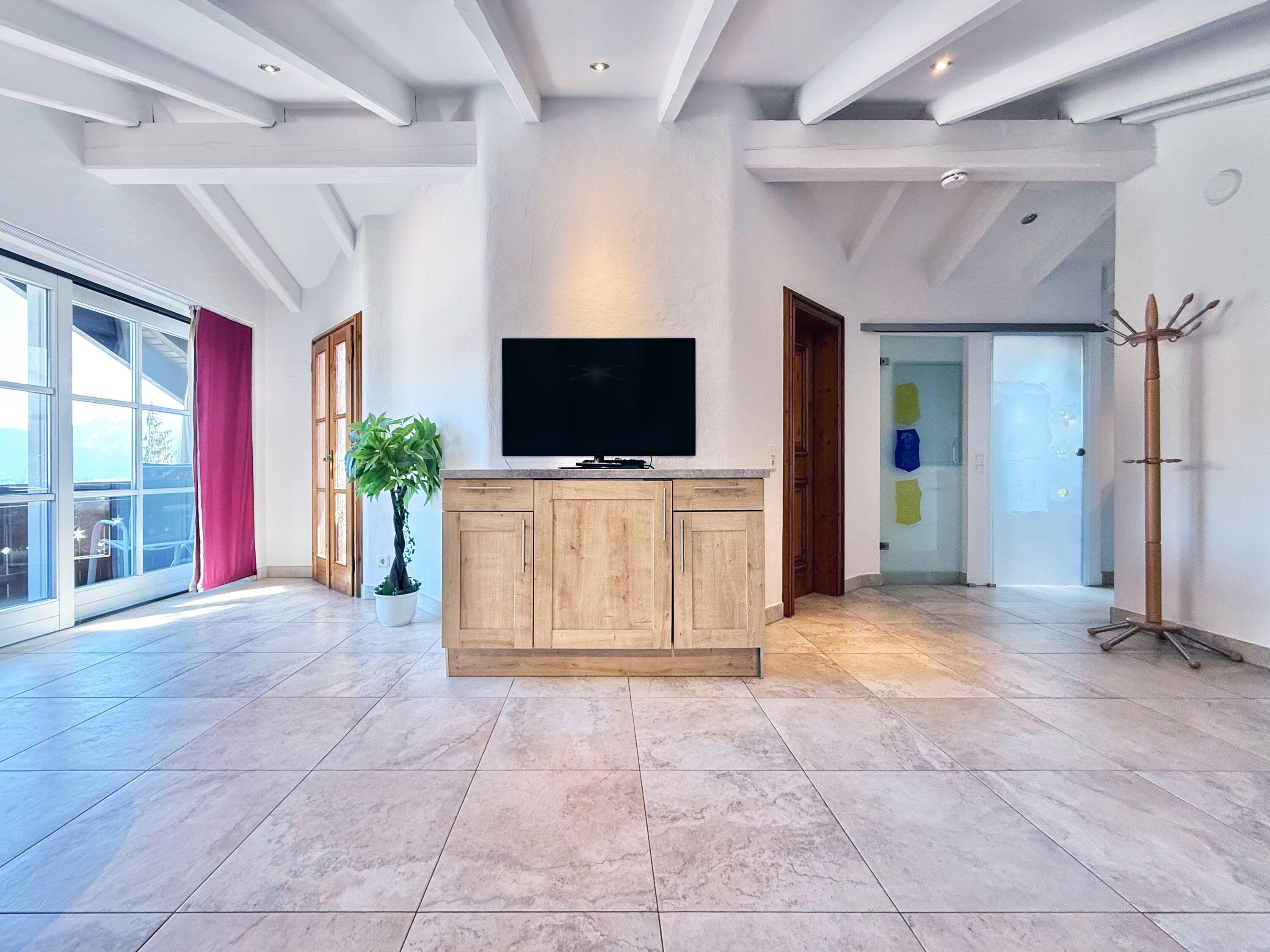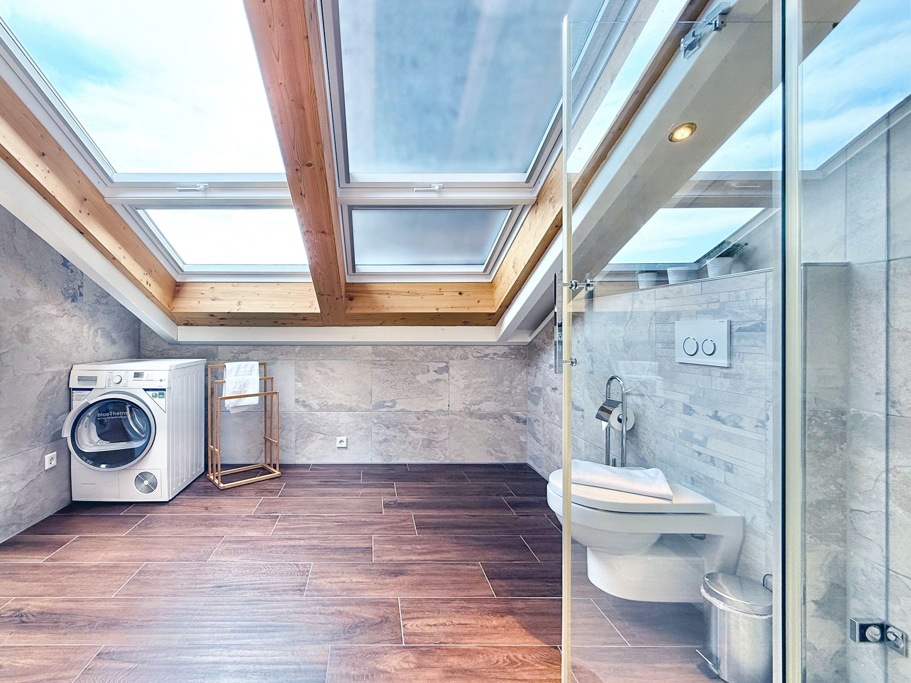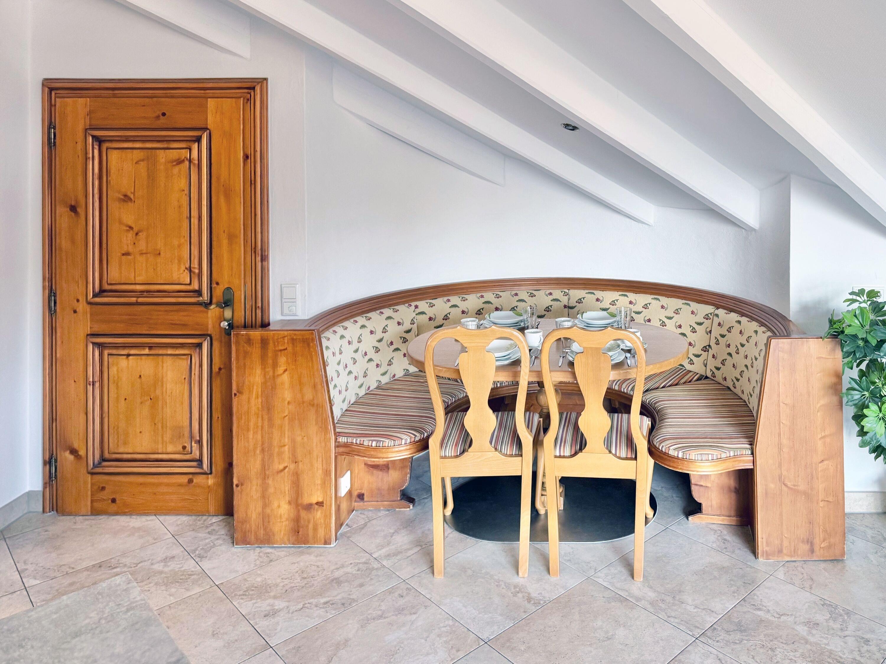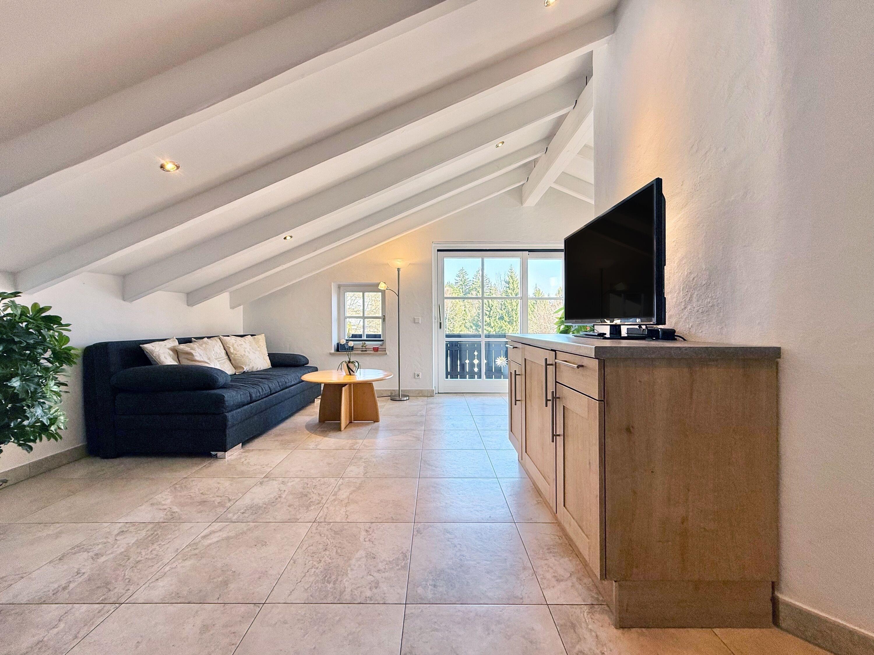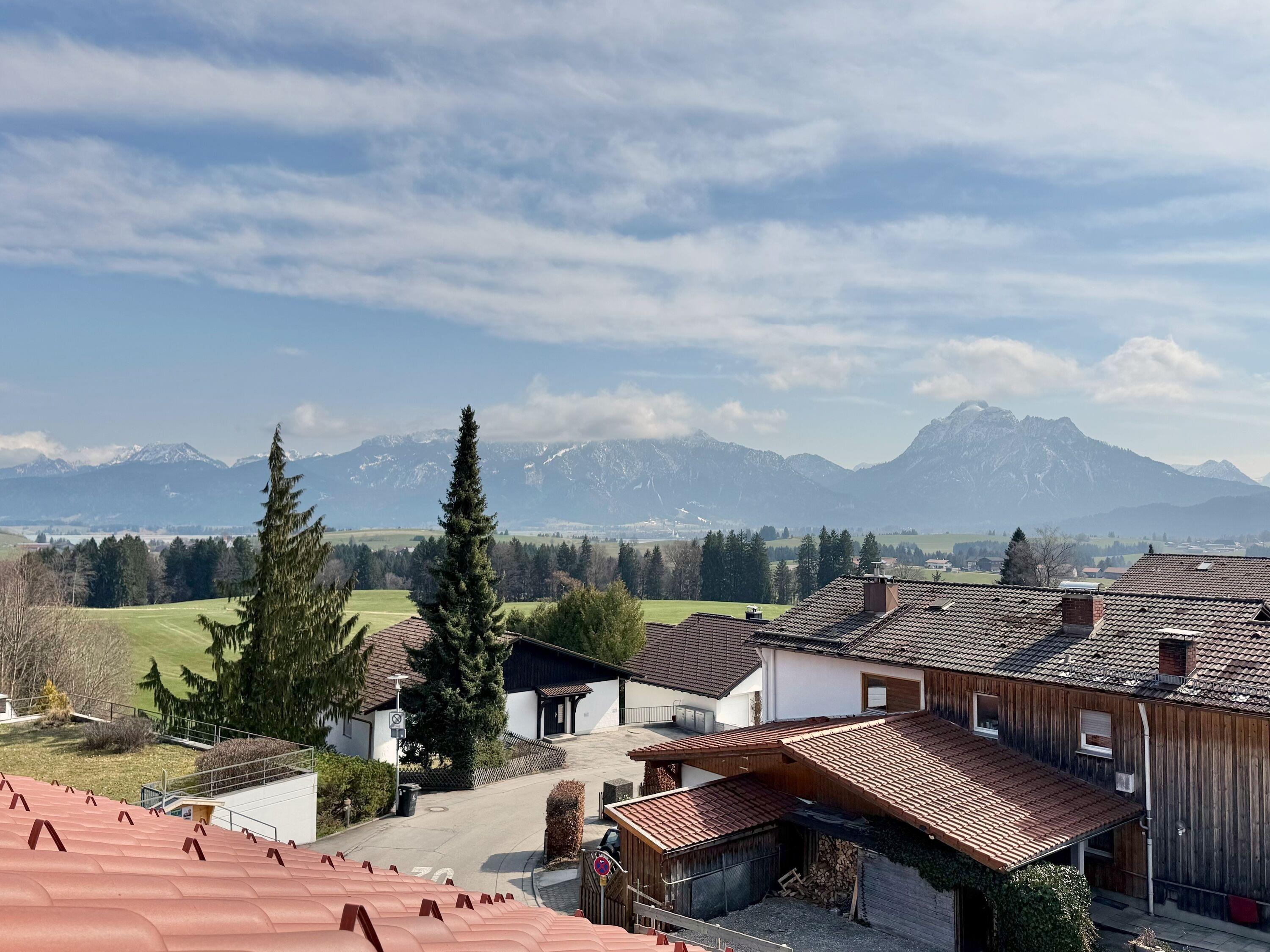 Die Ferienwohnung befindet sich im Dachgeschoss mit einem durch die offene Dachkonstruktion besonderen Ambiente und verfügt über einen einladenden Wohn- und Essbereich, ein gemütliches Schlafzimmer sowie ein großes und modernes Badezimmer. Ein komfortables Doppelbett und ein Schlafsofa sorgen für angenehmen Schlafkomfort. Der große Balkon mit Morgensonne lädt dazu ein, den Tag entspannt zu beginnen und die frische Allgäuer Luft zu genießen. Ein besonderes Highlight ist der Berg- und Seeblick vom Balkon und Wohnzimmer als auch aus den Panorama-Dachfenstern im Schlafzimmer und Bad. Ebenfalls ist das Märchenschloss Neuschwanstein zu sehen.