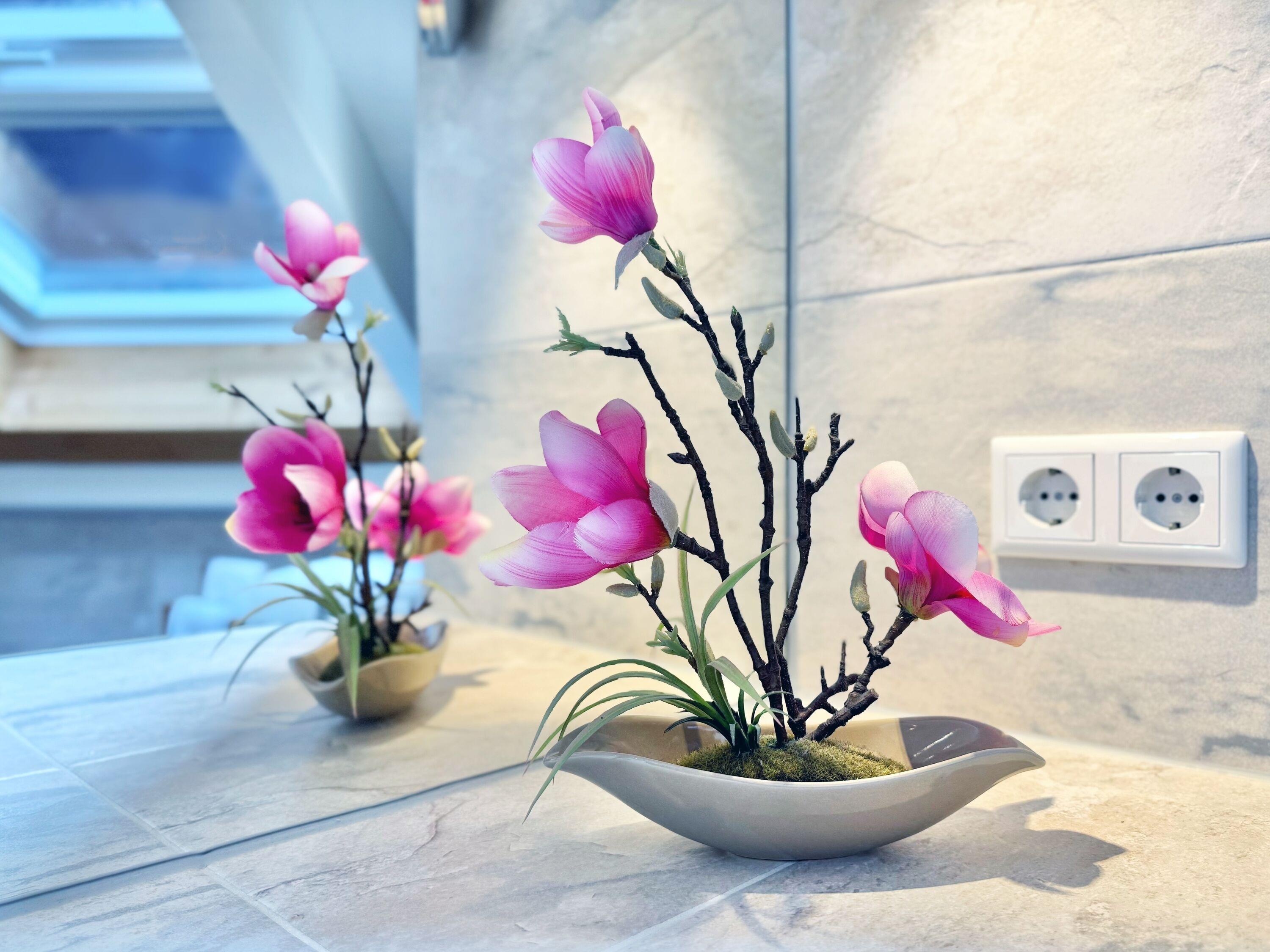 Zur Ausstattung gehören WLAN, ein TV-Flachbildschirm, eine Fußbodenheizung in der kompletten Ferienwohnung sowie eine moderne Küche mit Geschirrspülmaschine. Die Waschmaschine und der Trockner befinden sich im Badezimmer und sorgen für zusätzlichen Komfort während Ihres Aufenthalts. Für Kaffeeliebhaber stehen sowohl eine Nespresso Maschine als auch eine klassische Filter Kaffeemaschine zur Verfügung. Bettwäsche und Handtücher sind im Preis inkludiert. Ein PKW-Stellplatz in einer Einzelgarage sowie ein Stellplatz direkt davor stehen zur Verfügung. Fahrräder können sicher in der abschließbaren Garage untergebracht werden. Auf Wunsch kann ein Brötchenservice genutzt werden.