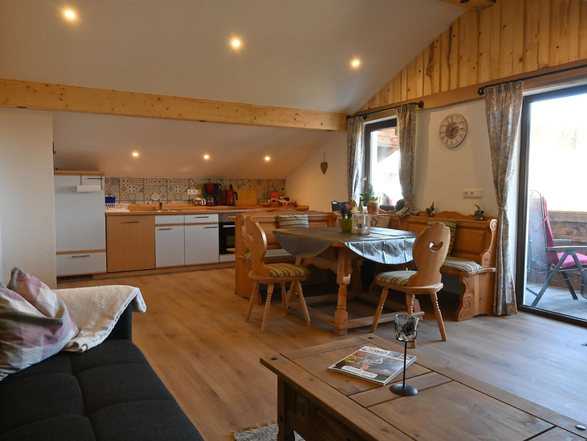 Unsere großzügige Ferienwohnung im Dachgeschoss unseres Landhauses mit über 70 m² Wohnfläche bietet Platz für bis zu 5 Personen. Das gemütliche Wohnzimmer mit Sat-TV, Radio/CD-Player und einer ausziehbaren Doppelbettcouch lädt zum Verweilen ein. Die komplett ausgestattete Küche lässt keine Wünsche offen. Die Ferienwohnung verfügt über zwei separate Schlafzimmer. Das geräumige Badezimmer mit Dusche und WC rundet das Gesamtbild ab. Vor allem im Sommer können Sie entspannte Abende auf unserem Balkon mit Blick auf die Allgäuer Bergkette und das Schloss Neuschwanstein verbringen. Das WLAN und den Parkplatz vor dem Haus können Sie gerne kostenfrei nutzen. Wir freuen uns darauf, Sie in unserer Wohnung begrüßen zu dürfen!