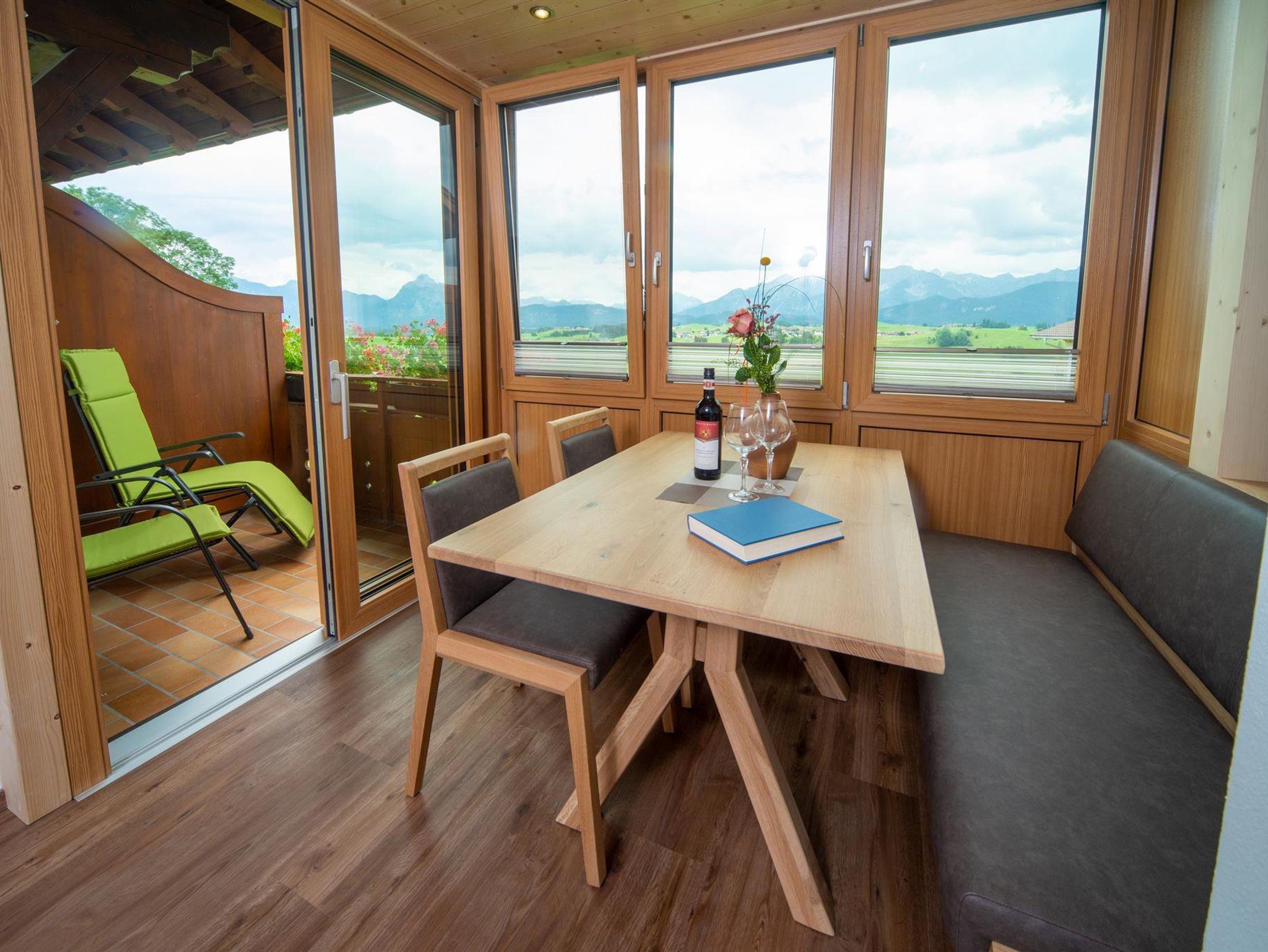Die Ferienwohnung Meisennest verfügt über einen Wintergarten auf dem Süd-Balkon (Essbereich), der eine traumhafte Aussicht auf die Berge, das Schloß und den Hopfensee bietet. Die Fewo setzt sich aus einem Wohn-Schlafraum, 1 separaten Schlafzimmer, Badezimmer mit Dusche und einem separaten WC zusammen. Die Wohnung ist kombinierbar mit den Doppelzimmer Fuchsbau und bietet somit Platz für max. 4 Pers. Die Ferienunterkunft bietet eine höherwertige Gesamtausstattung mit gehobenem Komfort.