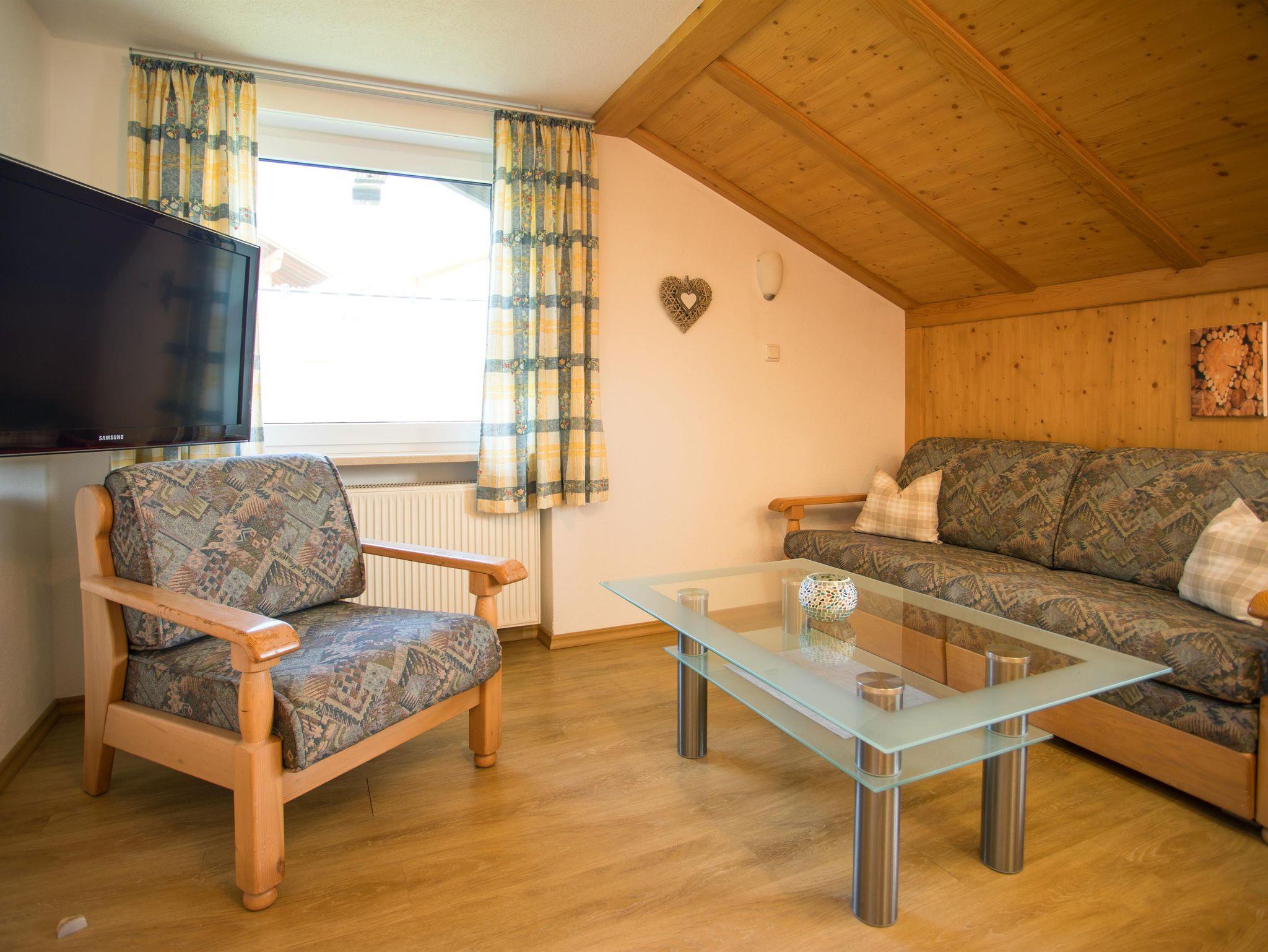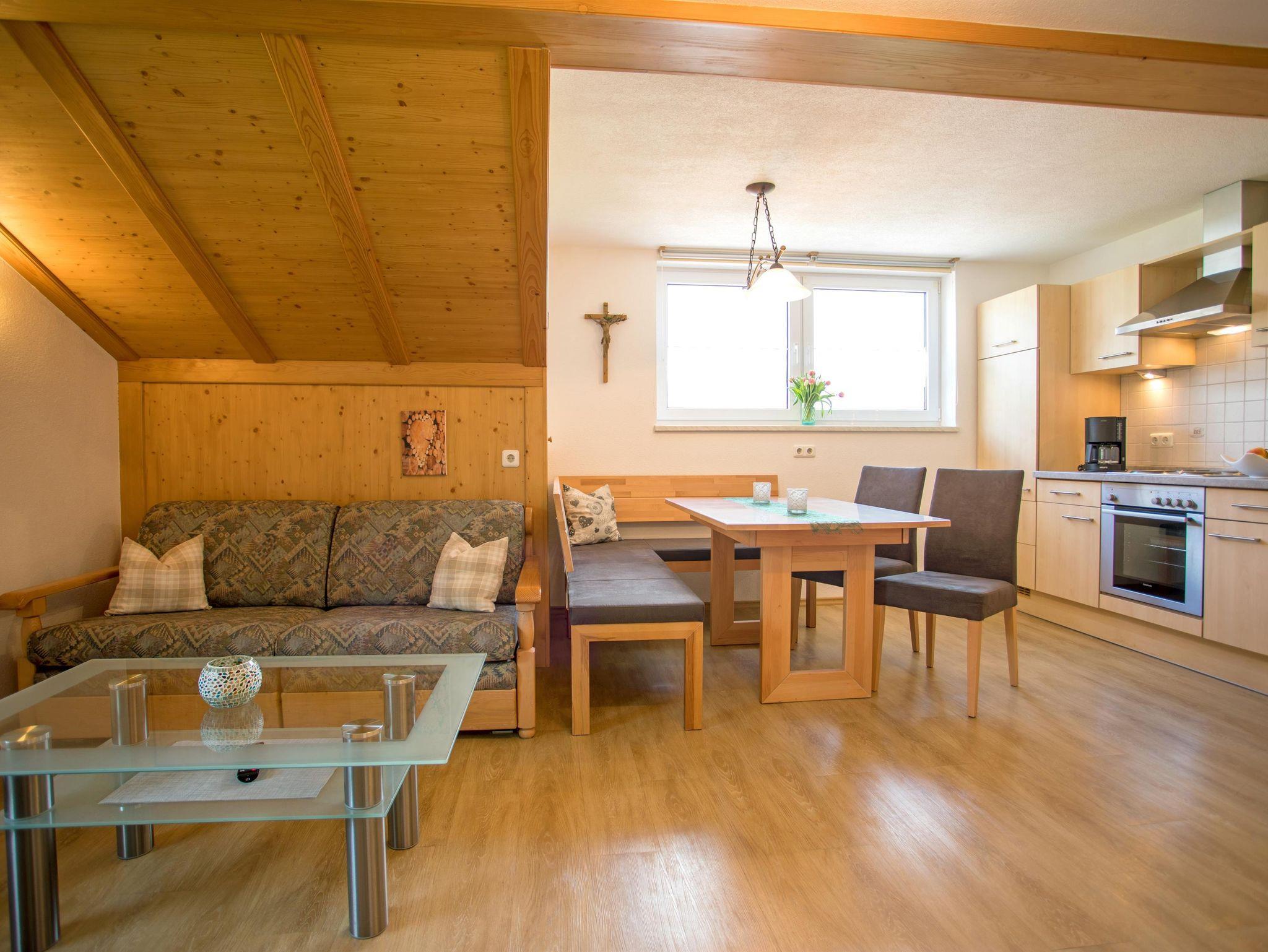 Verbringen Sie Ihren Urlaub in unserer 55 m² großen Ferienwohnung (Dachgeschoß), bestehend aus einer Wohnküche (Küchenzeile mit Essecke, Wohn- und Schlafouch mit TV-Ecke), einem Schlafzimmer (mit zusätzlicher Schlafcouch), Dusche/ WC und Südbalkon (mit Blick über die Allgäuer Alpen bis hin zu Schloß Neuschwanstein). WLAN gratis. Bettwäsche, Dusch- und Handtücher vorhanden. Parkplatz am Haus, Abstellmöglichkeit für Fahrrad und Ski/Schlitten in Garage möglich. Im Garten Sitz- und Liegemöglichkeit, Schaukel, Trampolin unt Tischtennis - Rodelhang am Haus.