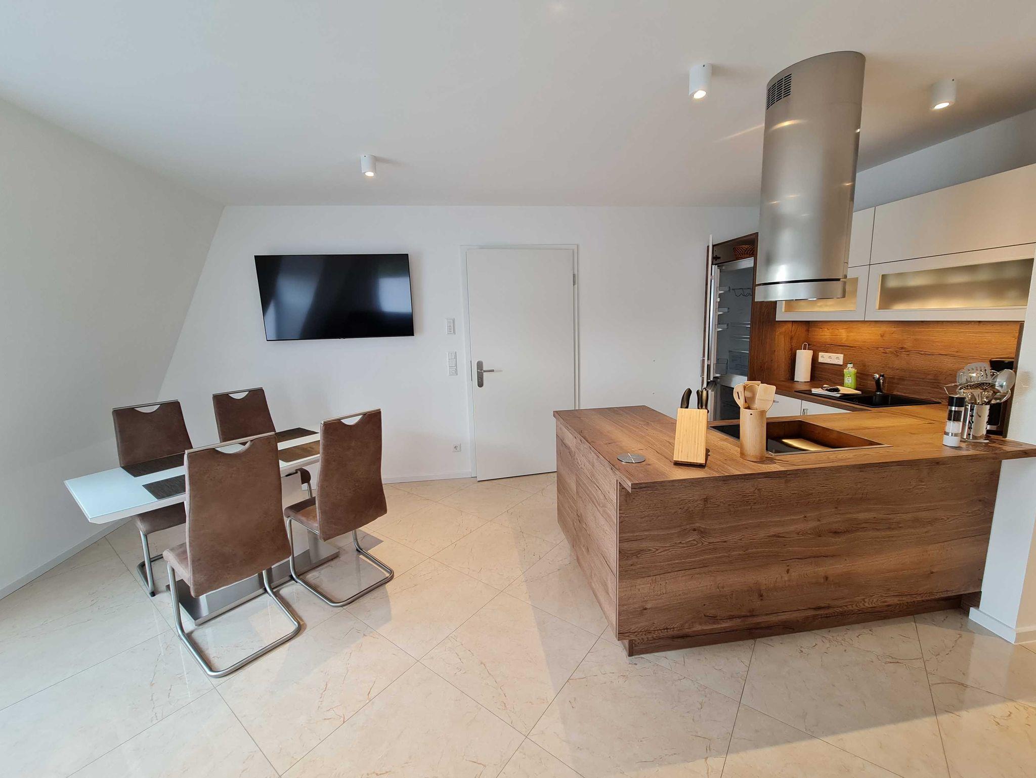 Die 3-Zimmer Wohnung ist im 1. OG des Hauses gelegen und ca. 70 qm groß. Balkon, ebenerdige Dusche, Waschmaschine, hochwertige Einbauküche mit Geschirrspüler, Backofen und vollständiger Ausstattung, LAN und W-LAN sind nur einige High-Lights. Ein höhenverstellbarer Schreibtisch und in jedem Zimmer ein Q-LED Sat TV, Abstellraum, Fussbodenheizung und elektrische Rolläden sprechen für einen überdurchschnittlichen Standard. Eine große gemütliche Couch im Wohnzimmer. eine comfortable Schlafcouch im Arbeitszimmer und ein bequemes Doppel-Boxspringbett versprechen gemütliche Abende und traumreiche Nächte. Der Garten mit Grillmöglichkeit kann gern mit benutzt werden.