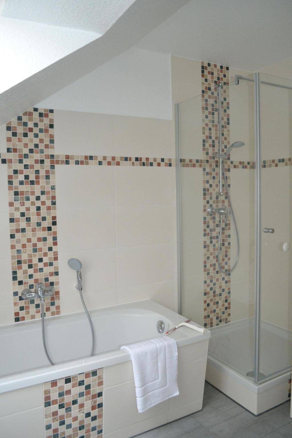 The flat is located on the top floor, can accommodate up to five people and has a living space of approx. 85m². It is particularly characterised by the abundance of natural light that enters through the numerous windows. Brightly painted walls and wooden floors provide additional comfort. In the first bedroom there is a double bed (1.80m x 2.00m) and in the second room you sleep in a French bed (1.60m x 2.00m). A single bed (0.90m x 2.00m) can be placed in one of the rooms as required. The open-plan kitchen area, fully equipped with all important electrical appliances, nestles elegantly into the living area. The latter is further divided into a dining area with a dining table and a seating area with two sofas, armchairs and, of course, a TV. The spacious bathroom with a large shower completes the offer.