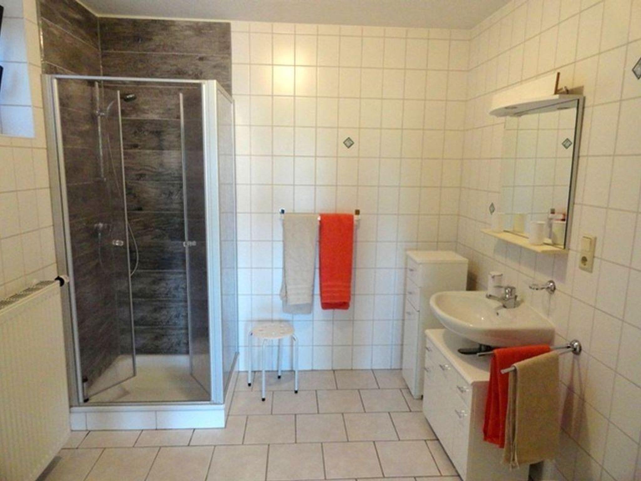 Bad mit Dusche, WC, Fön und Waschbecken