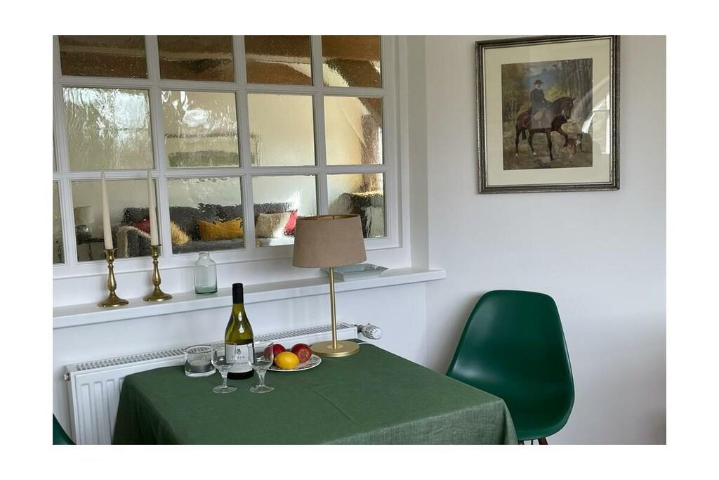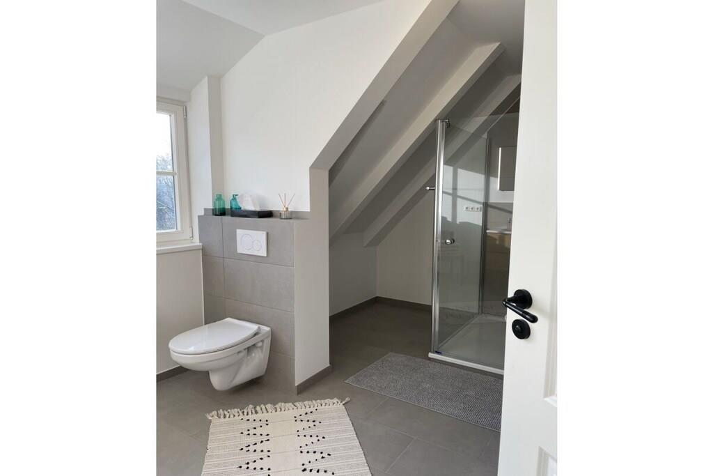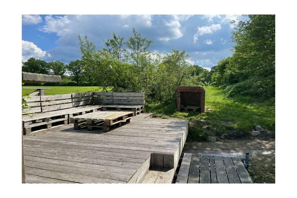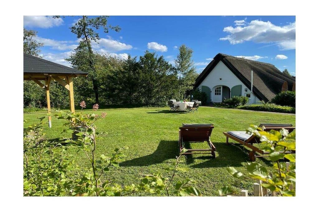 Denne romslige eiendommen ligger i et avsidesliggende område i Holstein Sveits og Mittlerer Stocksee naturreservat, i gangavstand fra innsjøen. Den har et stråtak, innredet som en romslig ferieleilighet (ca. 90 m²) for 2-4 naturelskere. Nyrenovert og innredet i landlig stil, har den blitt tilbudt som et feriehus for første gang siden 2023. Soverommet er svært innbydende og koselig med et stort vindu. På motsatt side er walk-in-garderoben med god oppbevaringsplass. Den store stuen i loftstil har en sovesofa og et spisebord for 4 personer. Det store kjøkkenet er fullt utstyrt; det er også et bord for minst 2 personer. Det nye badet har en stor dusj og er også utstyrt med vaskemaskin. Foran huset ligger hagen med en herlig, solrik sittegruppe. Gården vår har et lite privat ridesenter.