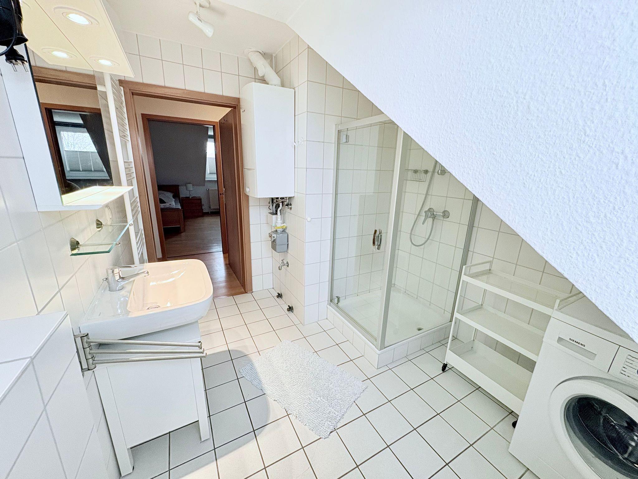 • Voll ausgestattetes Badezimmer mit Dusche, WC, Waschbecken und Waschmaschine im Obergeschoss