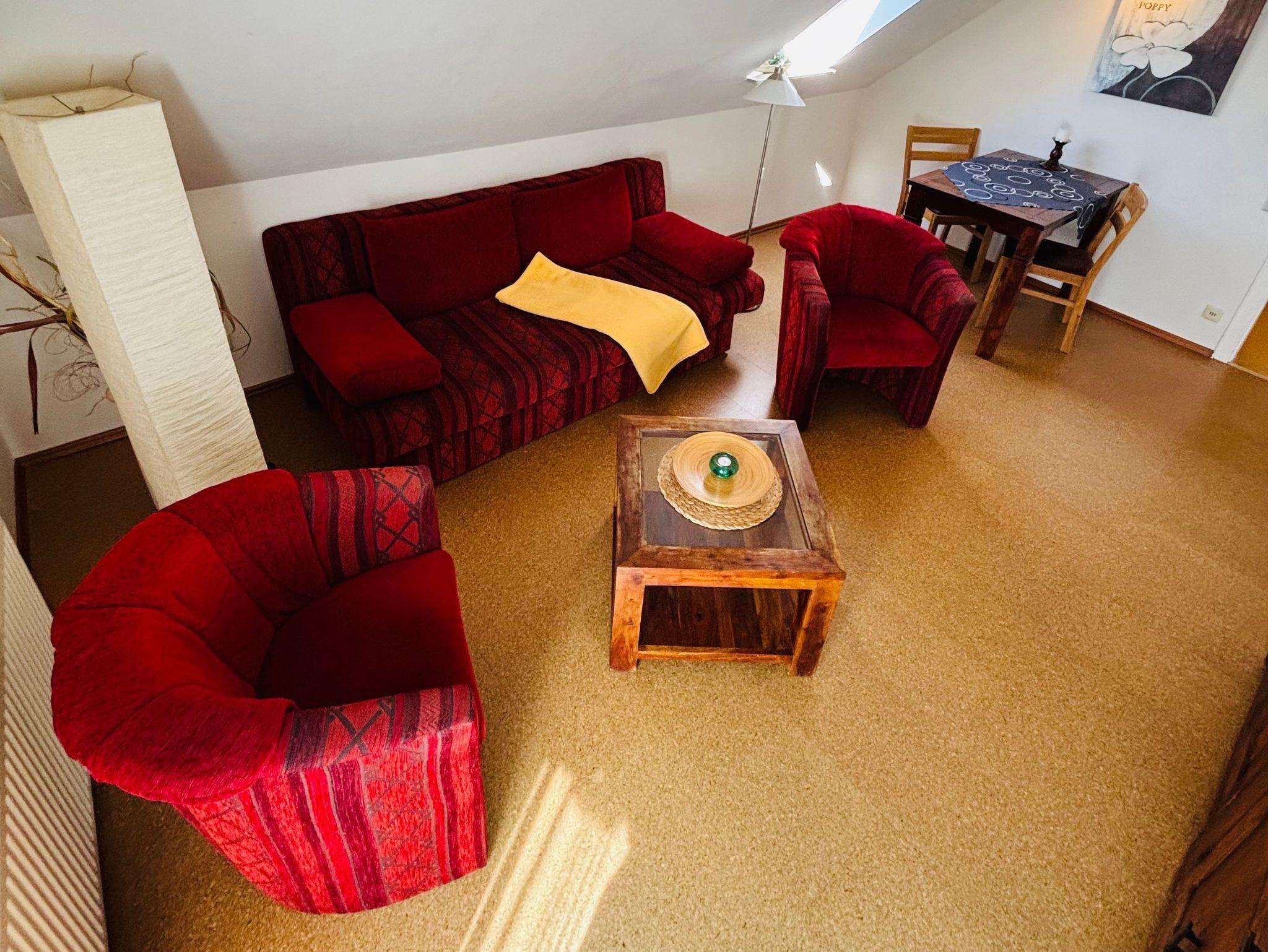 Herzlich willkommen in unserer einladenden Ferienwohnung im 1. Stock! Diese charmante 49m² große Wohnung bietet den idealen Rückzugsort für 2 Personen. Genießen Sie die geschmackvoll gestaltete Atmosphäre, während Sie auf den stilvollen Korkböden im Wohnzimmer (mit Schlafsofa) und im Schlafzimmer Ihre Zeit verbringen.