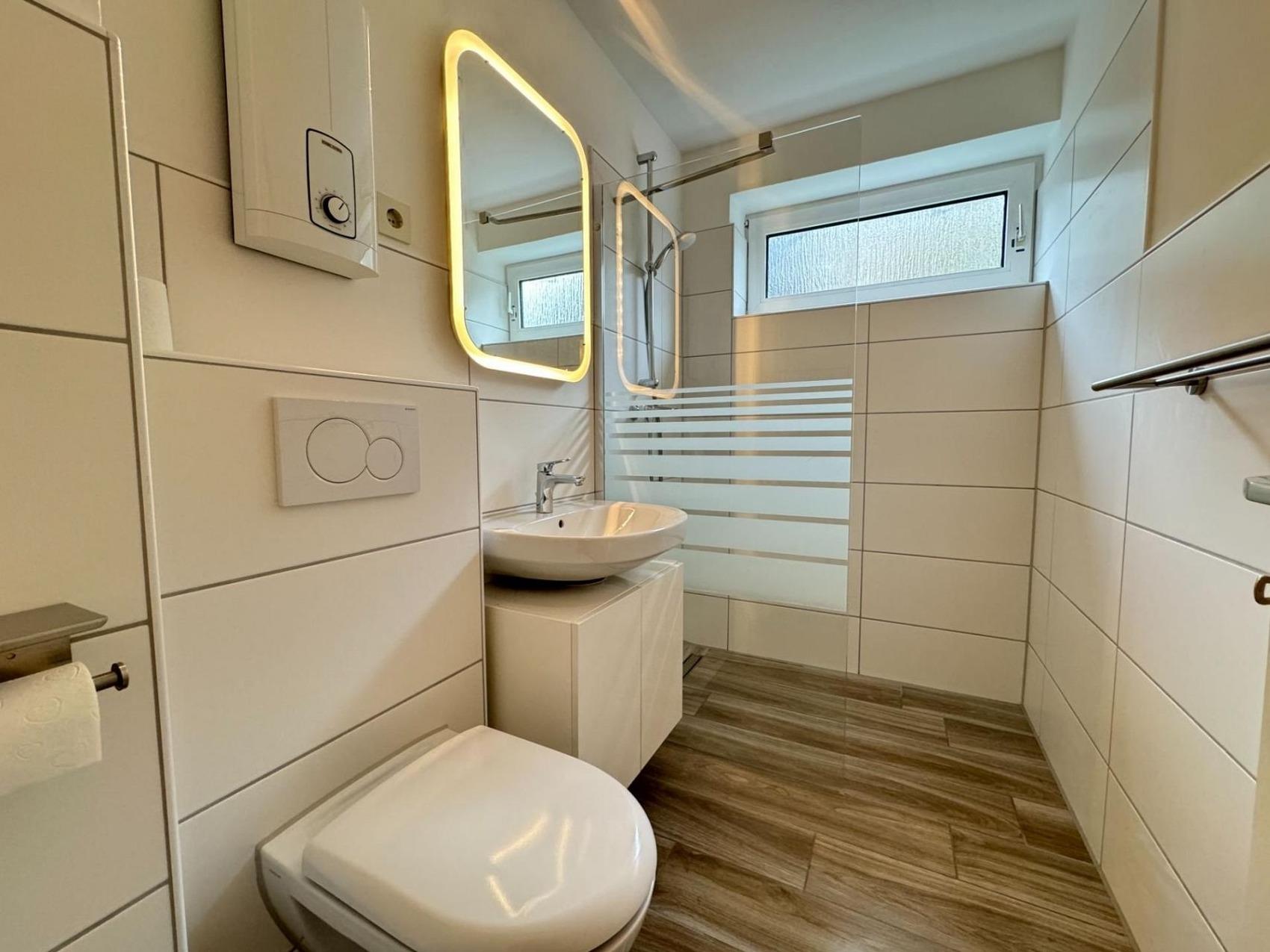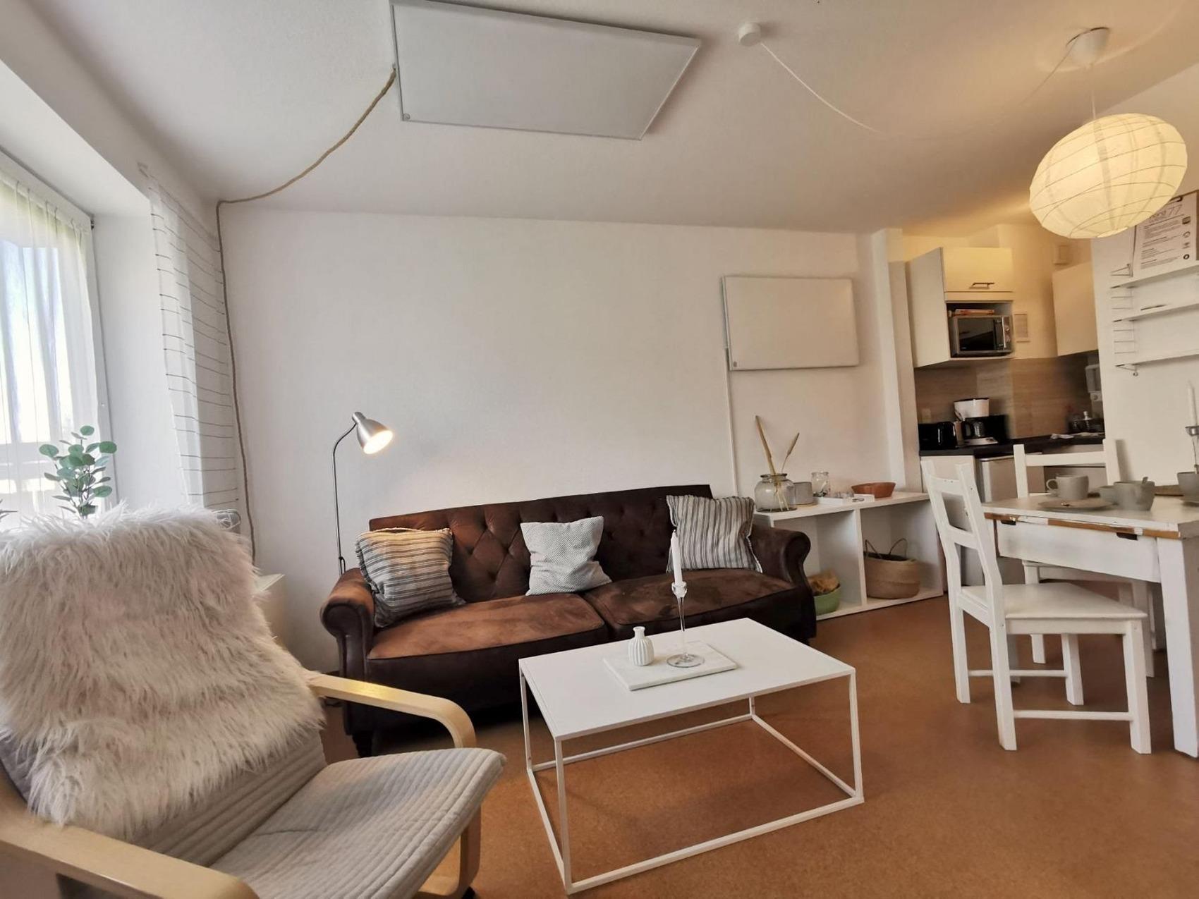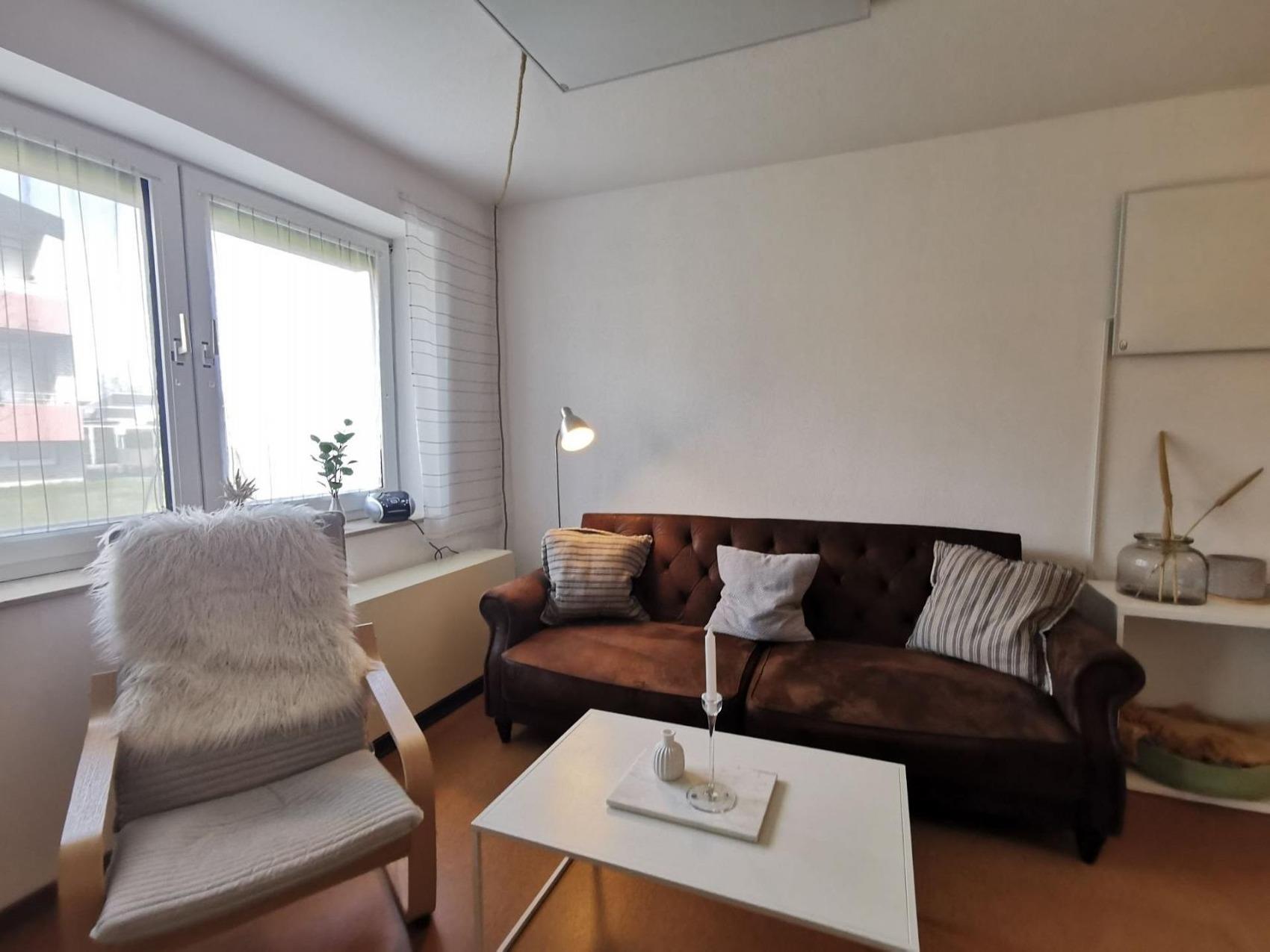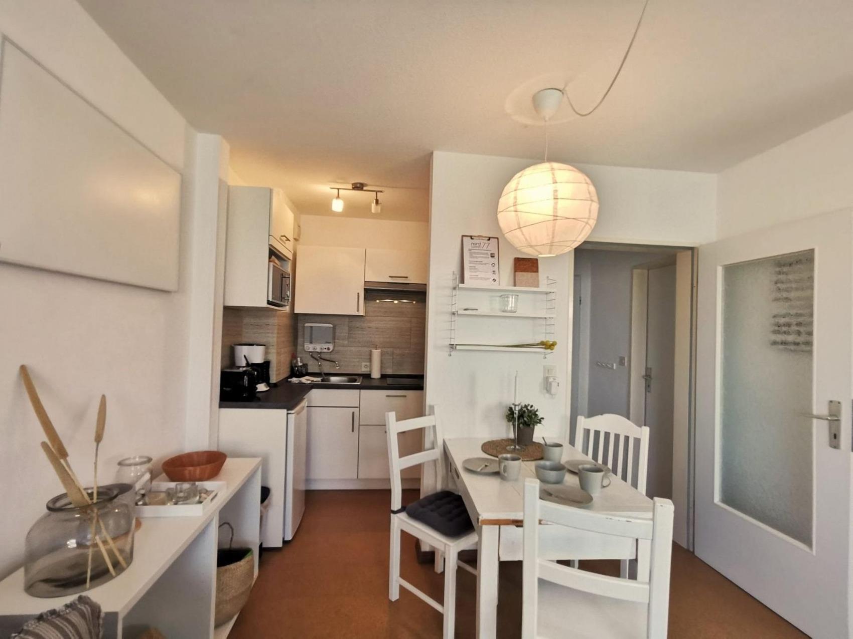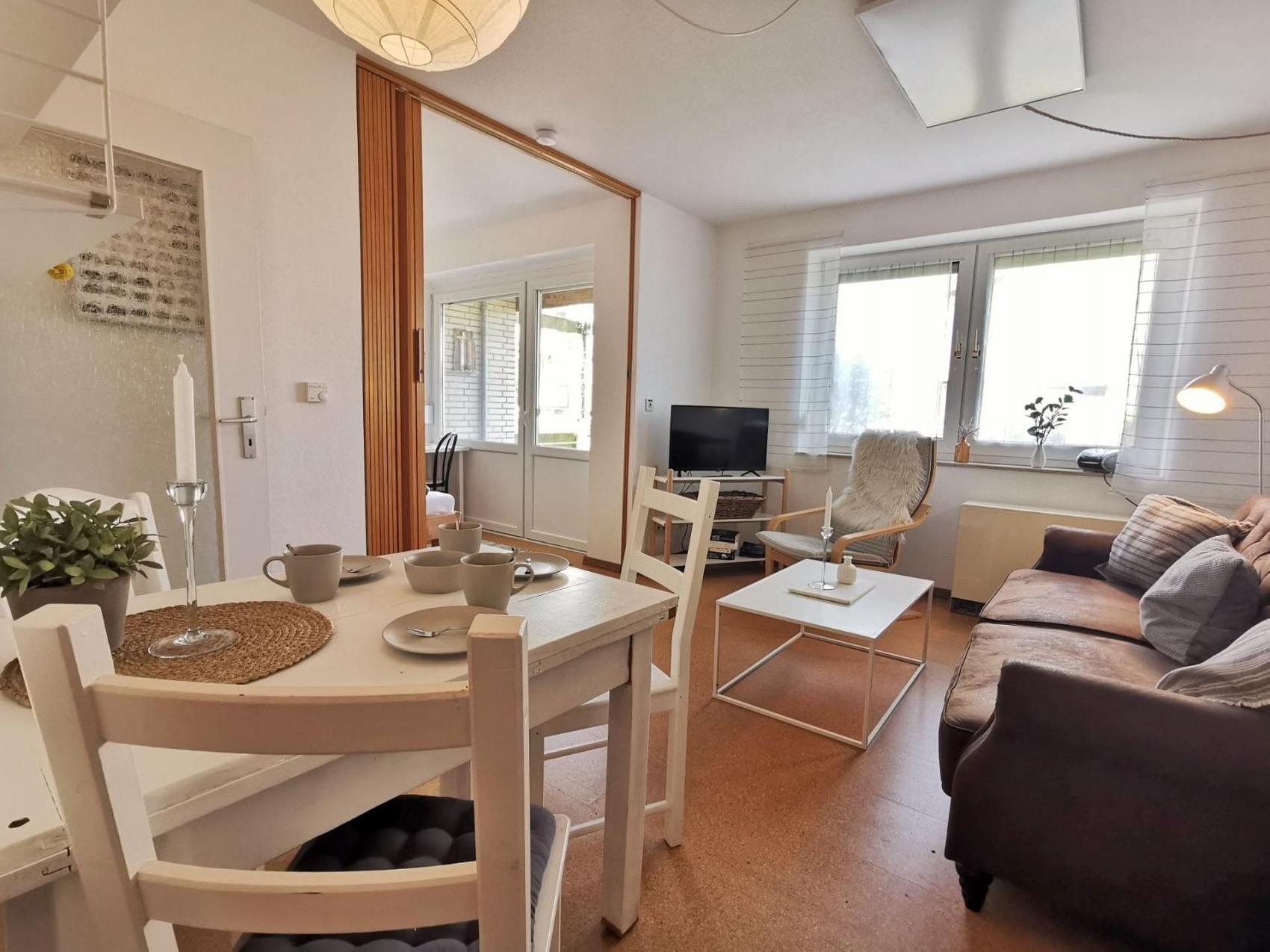 Ihr wollt lieber auf der Terrasse entspannen? Können wir gut verstehen. Die ist ja auch schön groß und die Sonnenliegen laden zum Dösen ein. Abgesehen davon bietet unsere Ferienwohnung gemütlichen Scandi-Stil auf ca. 40 qm ein Schlafzimmer mit Doppelbett und einen Wohnraum mit einem bequemen Ausziehsofa für 2 Personen. Ihr könnt es euch vor dem Smart-TV mit Zugang zu Netflix und Disney+ gemütlich machen; WLAN ist vorhanden. Dazu gibt es einen Schreibtisch mit Tageslichteinfall.Die praktische Küche ist ausgestattet mit Kühlschrank, Mikrowelle inkl. Backofen, Kaffeemaschine, Wasserkocher, Toaster und Geschirr für 4 Personen. Im Duschbad könnt ihr euch Sonnencreme und Nordseesalz abspülen.Zur Wohnung gehört ein Pkw-Stellplatz und das Haus hat einen Fahrradkeller.Unsere Ferienwohnung bietet:- ca. 40 m² Wohnfläche, Schlafplätze für bis zu 4 Personen- ca. 10 m² große, private Terrasse mit Sonnenliege[n?]- Schlafzimmer mit 1 Doppelbett - Wohnraum mit bequemen Schlafsofa für 2 Personen- Smart-TV mit Zugang zu Netflix und Disney+- WLAN- Küche ausgestattet mit Kühlschrank, Mikrowelle inkl. Backofen, Kaffeemaschine, Wasserkocher, Toaster und Geschirr für 4 Personen- ein Duschbad- Radio mit CD-Player- Bügeleisen- Rollläden- Parkplatz am Haus mit eigenem Stellplatz- Fahrradkeller- Ihr habt die Kleinen dabei? Auf Wunsch stellen wir Babybett und Hochstuhl bereit