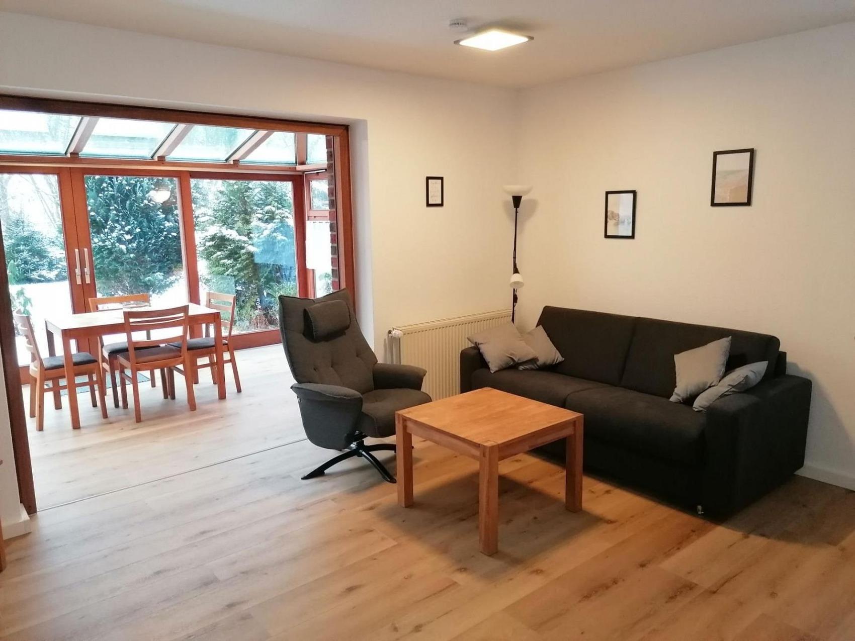Frisch renovierte, helle Erdgeschosswohnung in zentraler, ruhiger Lage mit 1 Schlafzimmer und Doppelschlafcouch im Wohnbereich, großer Wohnraum Sofaecke und großem Essplatz im Wintergarten mit Zugang zur Terrasse. Eine moderne Einbauküche mit Spülmaschine und Backofen ist verbaut worden. Der Flur mit Garderobe, ein Tageslichtduschbad mit WC und Waschbecken gehören zur Ausstattung. Ein PKW-Stellplatz am Haus und Waschmaschine und Trockner im Haus, kostenloses WLAN. Fahrräder/Kinderwagen können in der abschließbaren Garage abgestellt werden.