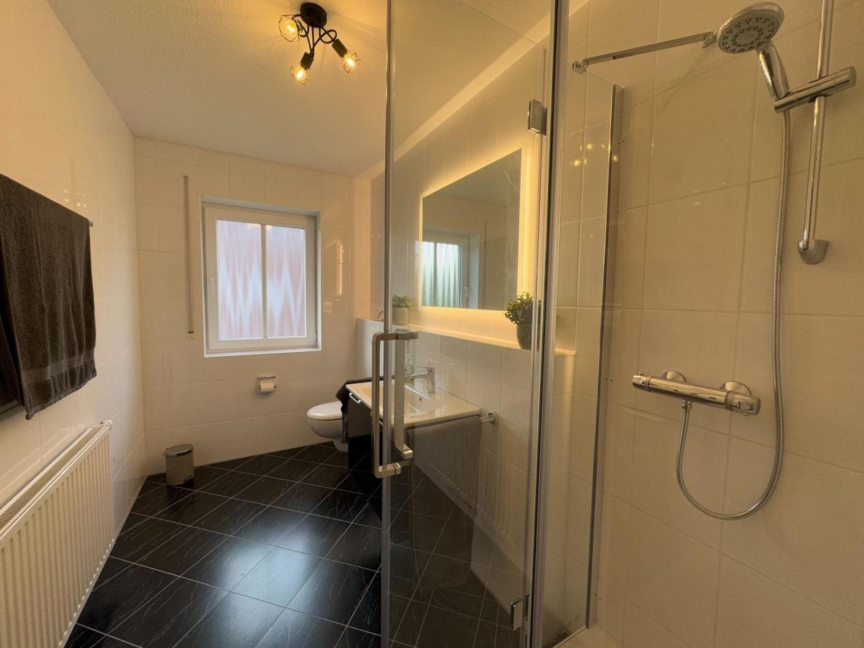Ein großzügiger Flur, ein Tageslichtbad mit Dusche und Föhn, zwei Schlafzimmer (das erste ausgestattet mit Doppelbett, Kleiderschrank und Fernseher, das zweite mit zwei Einzelbetten und Kleiderschrank), sowie ein großer offener Raum mit Küche, Essplatz für 4 Personen und einem Wohnbereich mit Fernseher, DVD-Player und Gesellschaftsspielen lassen keine Wünsche offen.Es stehen Ihnen Internet und Kabelfernsehen zur Verfügung.Die Wohnung ist durch die vielen vorhandenen Fenster schön hell, die Sonne lässt sich bei Bedarf jedoch auch durch die vorhandenen Jalousien jederzeit aussperren.Für die kleinsten Gäste sind ein Kinderreisebett und ein Hochstuhl vorhanden.Die Küche ist komfortabel ausgestattet und beinhaltet u.a. eine große Kühl-/Gefrierkombination, ein Herd mit Ceranfeld und Backofen, Mikrowelle, Toaster, Kaffeemaschine, Wasserkocher, Geschirrspülmaschine und noch vieles mehr, was man für die Zubereitung des Frühstücks oder Mittagessens benötigt.Die Sonne kann man auf dem großzügigen nach Süd-Westen ausgerichteten Balkon genießen, der mit Tisch und 4 Stühlen ausgestattet ist.Die Waschmaschine, Staubsauger, Bügeleisen und Bügelbrett sind in einem separaten Abstellraum untergebracht.Ein eigener PKW- Stellplatz und Fahrradabstellraum (abschließbar) befinden sich direkt am Haus.
