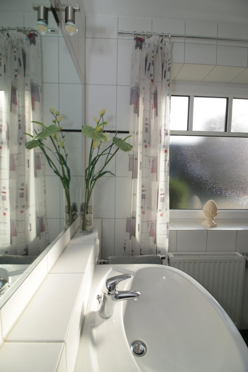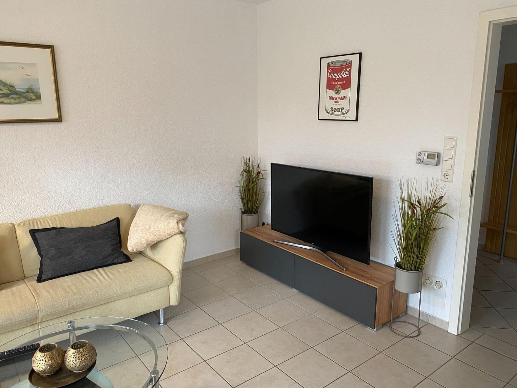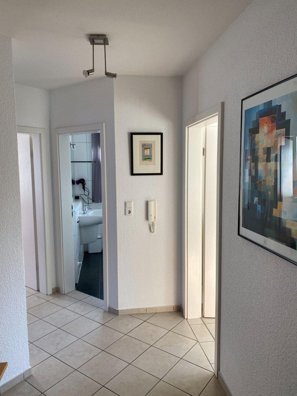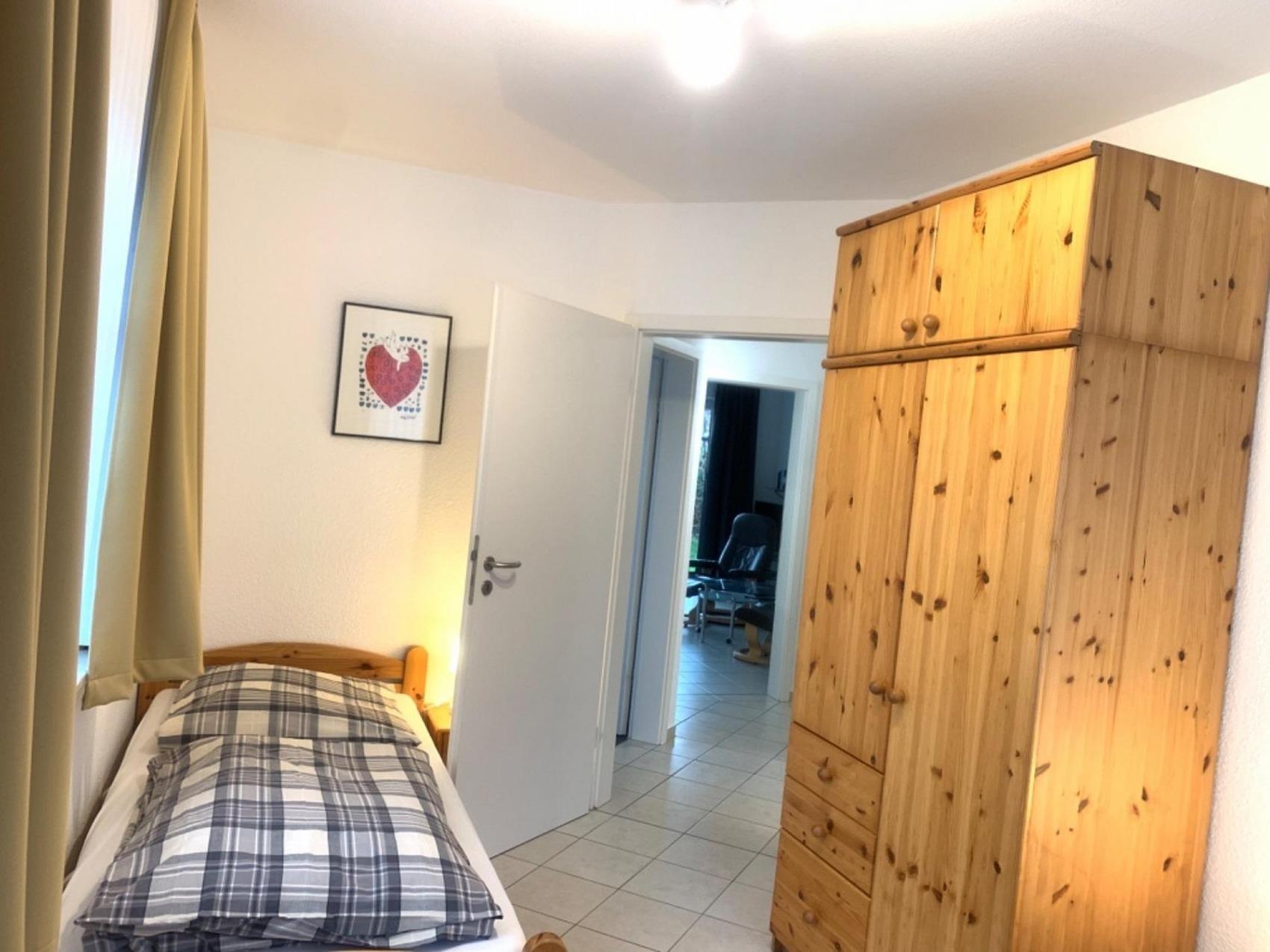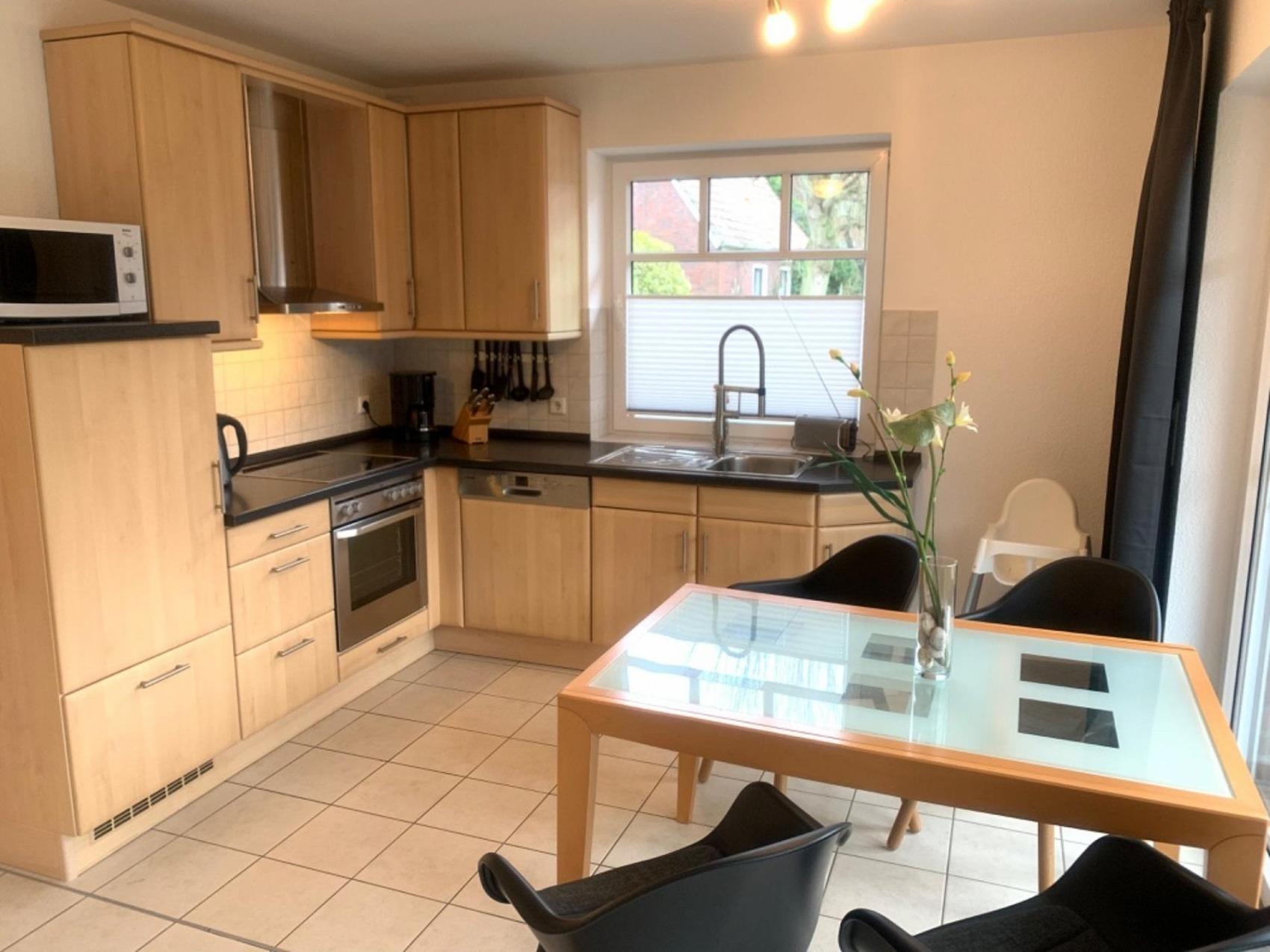Schöne moderne Ferienwohnung in einer Reihenhausanlage mit 2 getrennten Schlafzimmern - beide verdunkelbar. Ein großer Wohnraum mit moderner Einbauküche ( komplett ausgestattet mit Spülmaschine, Backofen, Mikrowelle ) und großzügigem Essplatz, mit Zugang zur Terrasse und Garten. Eine gemütliche Sofaecke mit Flachbildschirm. Ein Tageslichtbad mit Dusche, Waschbecken, WC und Waschmaschine sind vorhanden. Ein Flur mit Garderobe ist im Eingangsbereich vorhanden, kostenloses W-Lan ist selbstverständlich vorhanden. Ein PKW-Stellplatz und ein Fahrradabstellraum befinden sich direkt am Haus.