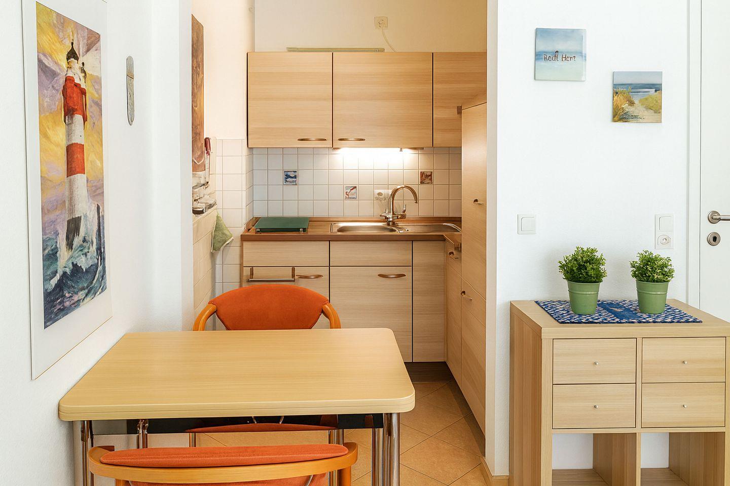 Die Ferienwohnung Westerheide bietet auf ca. 30 Quadratmetern Wohnfläche einen gemütlichen und gepflegten Rückzugsort für bis zu zwei, bei Bedarf auch drei Personen, und ist ideal für einen entspannten Erholungsurlaub an der Nordsee geeignet. Die Wohnung überzeugt durch ihre durchdachte Raumaufteilung und eine freundliche Ausstattung. Sämtliche Böden sind gefliest und verleihen den Räumen ein modernes und pflegeleichtes Ambiente. Die Pantryküche ist harmonisch an den Wohnbereich angegliedert und funktional ausgestattet. Sie verfügt über einen kleinen Grillofen, einen Kühlschrank mit Gefrierfach, einen Wasserkocher, einen Toaster sowie weitere praktische Küchenutensilien, sodass eine unkomplizierte Selbstversorgung problemlos möglich ist.