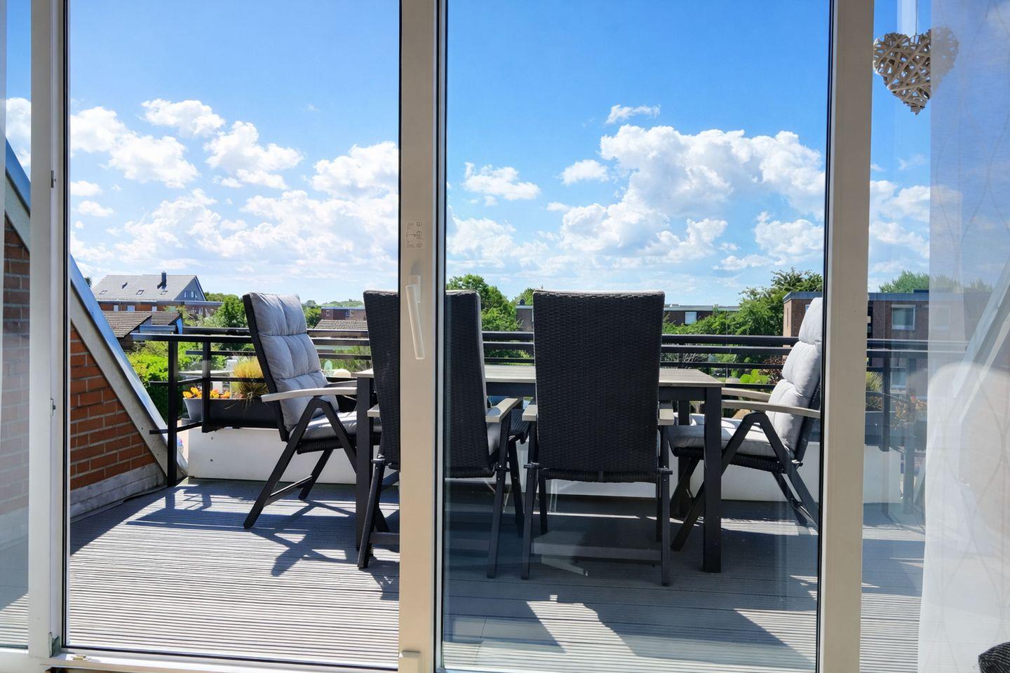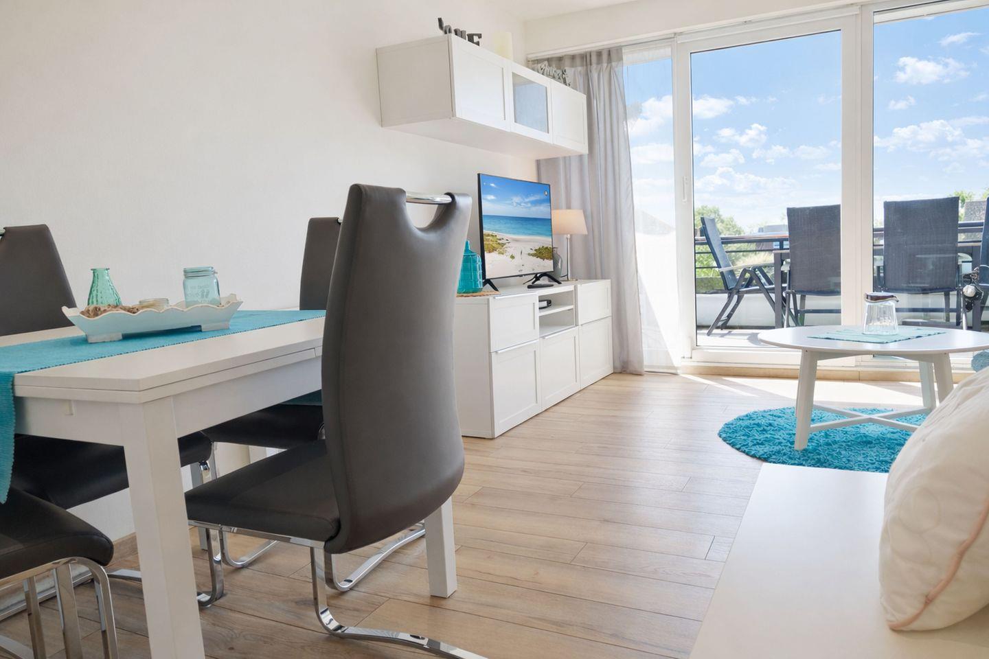 Der Wohnbereich lädt mit einem komfortablen Schlafsofa und Fernseher zu erholsamen Stunden ein und geht fließend in den sonnigen Balkon über, auf dem Sie die frische Nordseeluft genießen, den Tag ruhig beginnen oder entspannt ausklingen lassen können. Das separate Schlafzimmer ist mit einem bequemen Doppelbett ausgestattet und bietet beste Voraussetzungen für erholsame Nächte, während für die jüngsten Gäste bereits ein Kinderreisebett sowie ein Hochstuhl zur Verfügung stehen, sodass sich auch Familien von Anfang an willkommen fühlen. Das moderne Badezimmer mit Dusche und WC rundet das angenehme Wohngefühl ab und sorgt für einen komfortablen Start in den Tag. Dank der Außenrollos lassen sich alle Räume bequem verdunkeln, sodass Ruhe und Erholung jederzeit garantiert sind.
