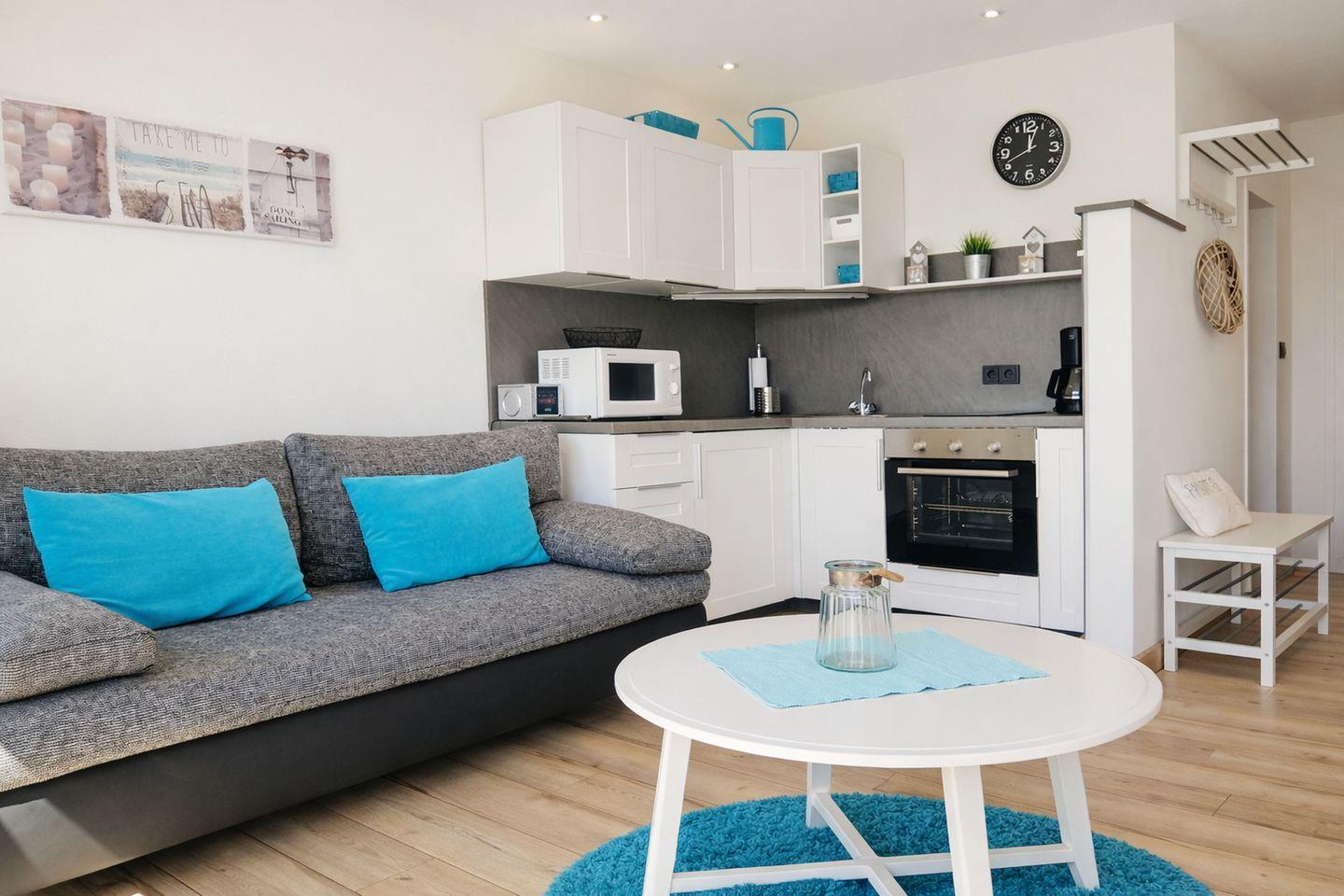 Die mit viel Liebe zum Detail gestaltete Ferienwohnung Ankerplatz heißt Sie in der zweiten Etage im beliebten Ortsteil Friesenhörn in Horumersiel herzlich willkommen und bietet bis zu vier Personen ein behagliches Zuhause auf Zeit für einen rundum gelungenen Nordseeurlaub. Schon beim Betreten spüren Sie die helle, freundliche Atmosphäre dieser geschmackvoll eingerichteten Wohnung, die Ruhe, Komfort und nordisches Lebensgefühl harmonisch miteinander verbindet. Der großzügige Wohnraum überzeugt mit einem einladenden Essplatz für vier Personen und einer offenen, voll ausgestatteten Küche, die keine Wünsche offenlässt. Backofen, zweiflammiges Kochfeld, Mikrowelle, Kühlschrank mit Gefrierfach sowie Filter-Kaffeemaschine, Senseo-Pad-Maschine, Toaster und Wasserkocher stehen bereit, damit Sie Ihre Urlaubstage ganz entspannt genießen und sich kulinarisch verwöhnen können, sei es beim gemeinsamen Frühstück oder bei einem gemütlichen Abendessen.
