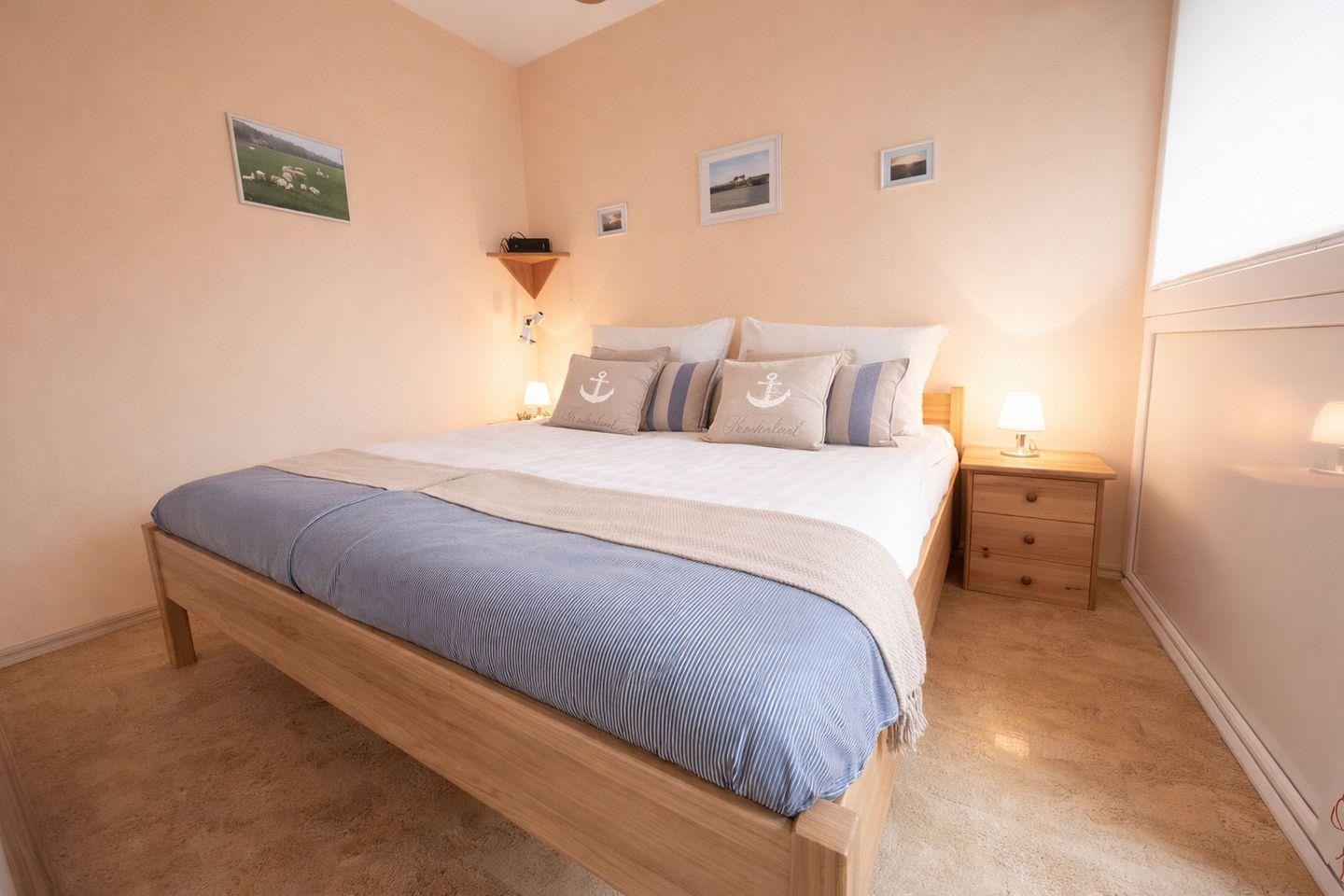 Das separate Schlafzimmer mit angenehm warmem Korkfußboden ist mit einem Doppelbett von 1,80 m Länge ausgestattet und bietet dank direktem Zugang zur Terrasse ein besonderes Plus an Komfort und Urlaubsgefühl. Außenrollos ermöglichen eine vollständige Verdunkelung, während eine Schiebetür eine flexible Trennung vom Wohnbereich erlaubt. Das moderne Badezimmer mit Dusche und WC rundet das gepflegte Gesamtbild der Wohnung ab. Im Wohnbereich sorgt ein Laminatfußboden für eine helle, freundliche Ausstrahlung, und ein eigener Parkplatz direkt am Haus garantiert eine bequeme An- und Abreise.