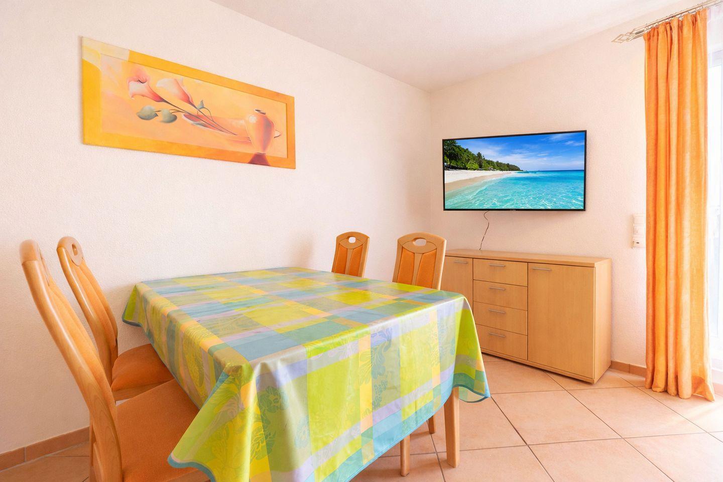 Die rund 56 Quadratmeter große Wohnung ist ideal für bis zu vier Personen und überzeugt durch eine durchdachte Raumaufteilung sowie eine hochwertige Ausstattung. Der offene Wohn-, Ess- und Kochbereich bildet das Herzstück der Unterkunft und schafft mit seiner gemütlichen Polstersitzgruppe, Fernseher und Radio mit CD-Player eine angenehme Wohlfühlatmosphäre. Die Essgruppe lädt zu gemeinsamen Mahlzeiten ein, während die vollständig ausgestattete Einbauküche mit Herd, Backofen, Mikrowelle, Kühlschrank mit kleinem Gefrierschrank, Geschirrspülmaschine, Kaffeemaschine, Toaster und weiterem Zubehör keine Wünsche offenlässt. Vom Wohn- und Essbereich aus gelangen Sie direkt auf die Terrasse, auf der ansprechende Gartenmöbel zum Entspannen, Lesen oder Genießen lauer Sommerabende einladen.