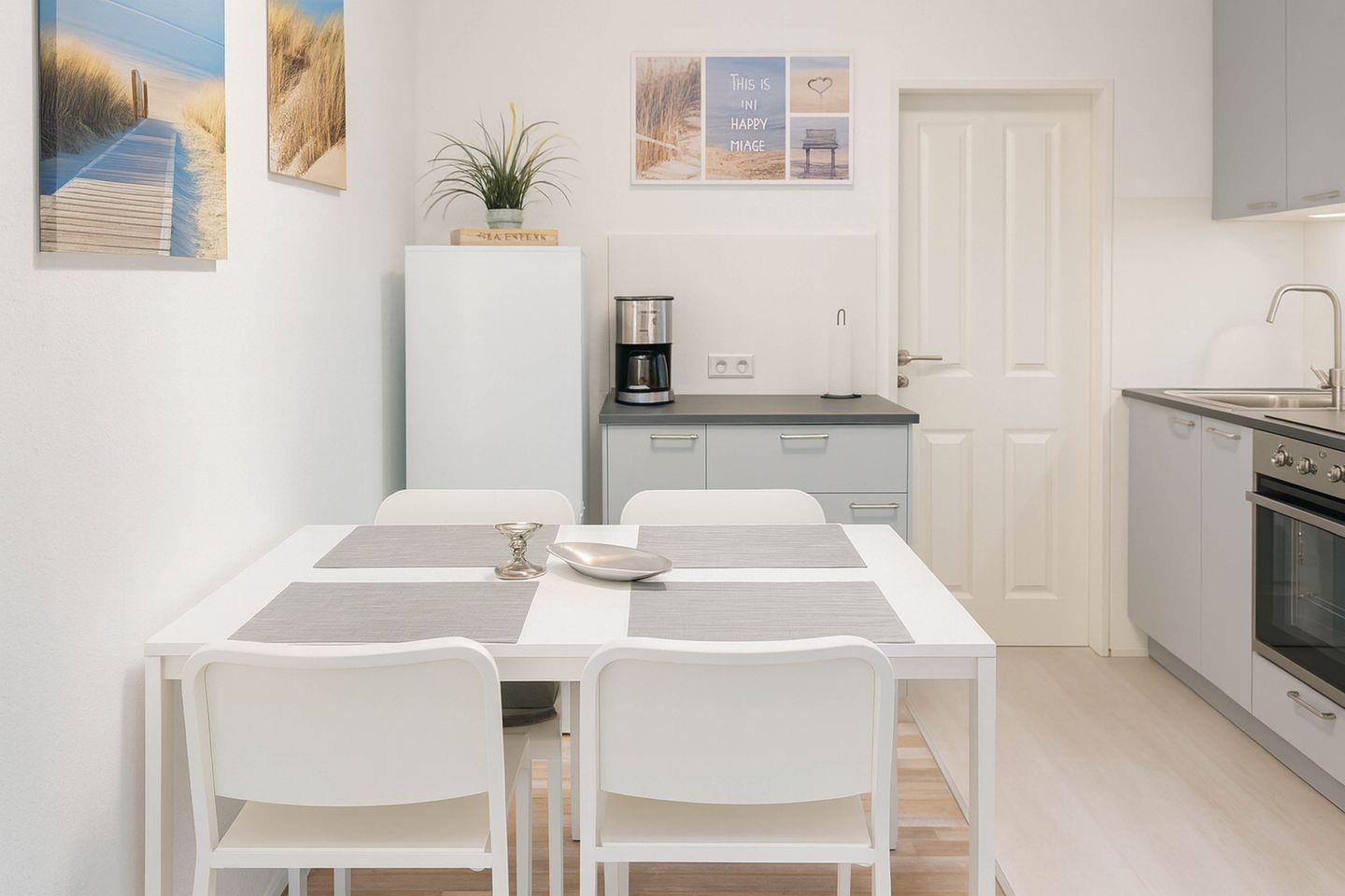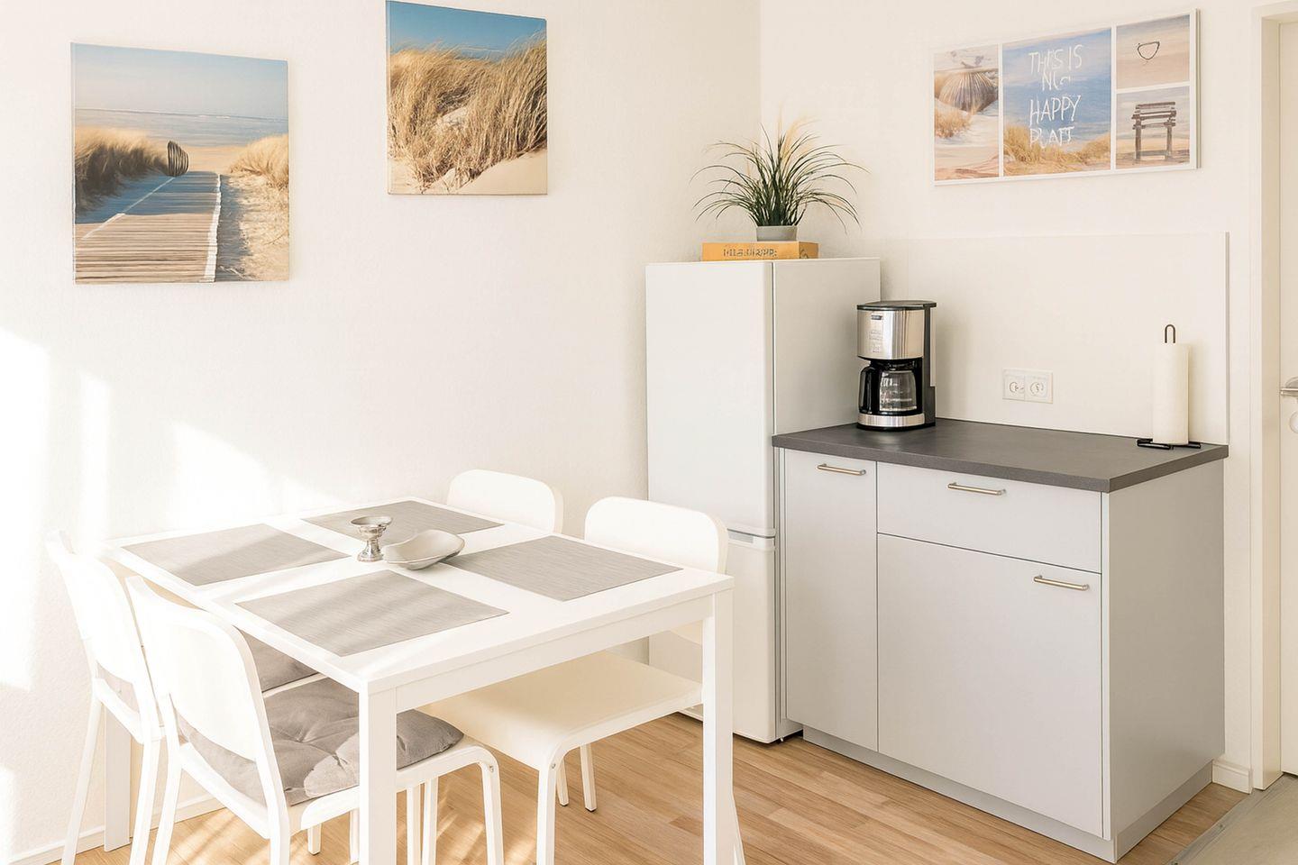 Die zweckmäßig ausgestattete Küchenzeile verfügt über einen Backofen mit vier Kochfeldern, einen Kühlschrank sowie eine Kaffeemaschine, einen Wasserkocher und einen Toaster. Direkt angrenzend befindet sich ein Essplatz für bis zu vier Personen, der zu gemeinsamen Mahlzeiten in entspannter Runde einlädt.