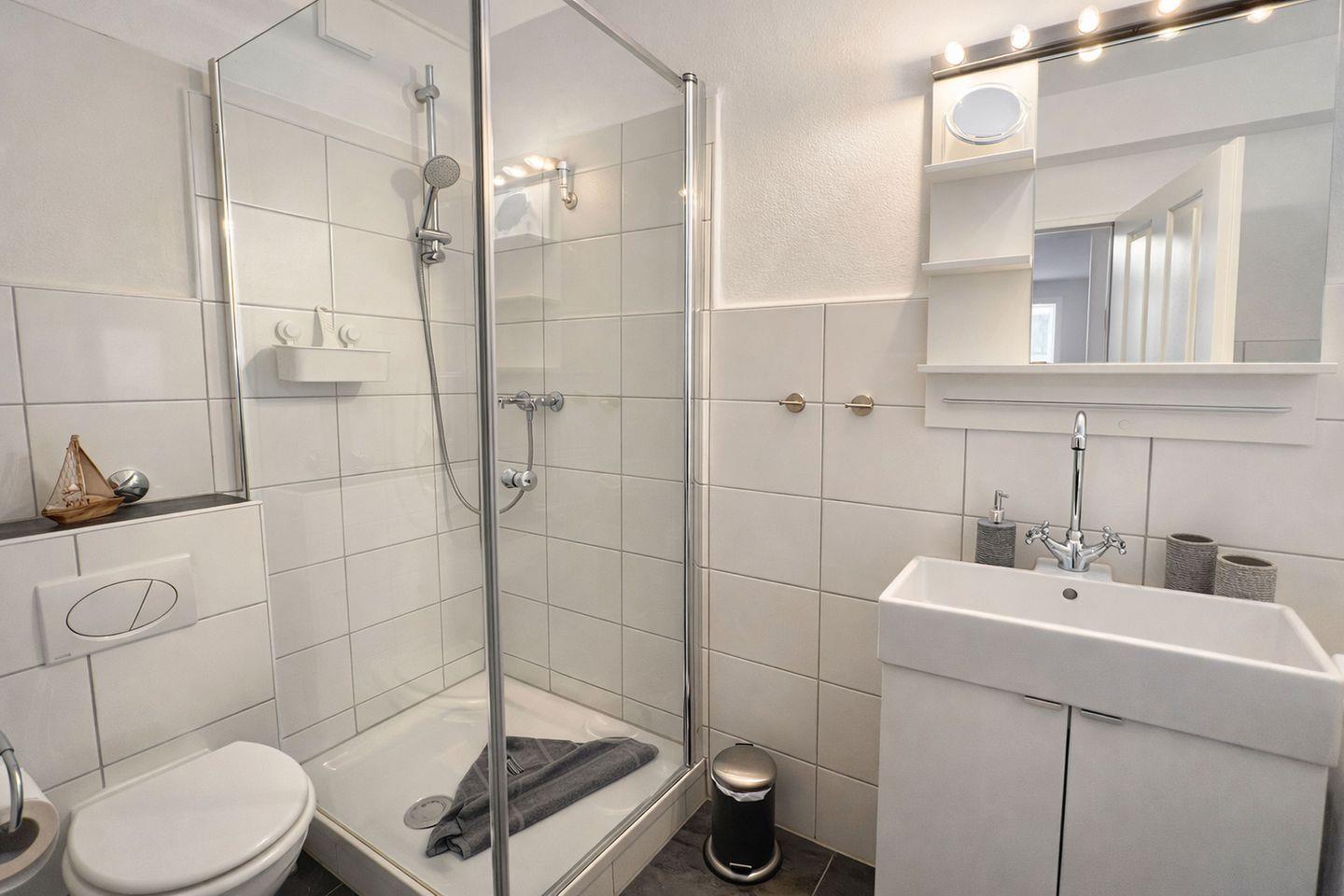 Das Badezimmer ist funktional und gepflegt gestaltet und verfügt über eine Dusche, ein WC sowie eine Waschmaschine, die Ihnen auch bei längeren Aufenthalten zusätzlichen Komfort bietet. An die Wohnung schließt sich eine sonnige Terrasse in Südrichtung an, die an warmen Tagen zu einem entspannten Frühstück im Freien oder zu erholsamen Stunden an der frischen Nordseeluft einlädt.