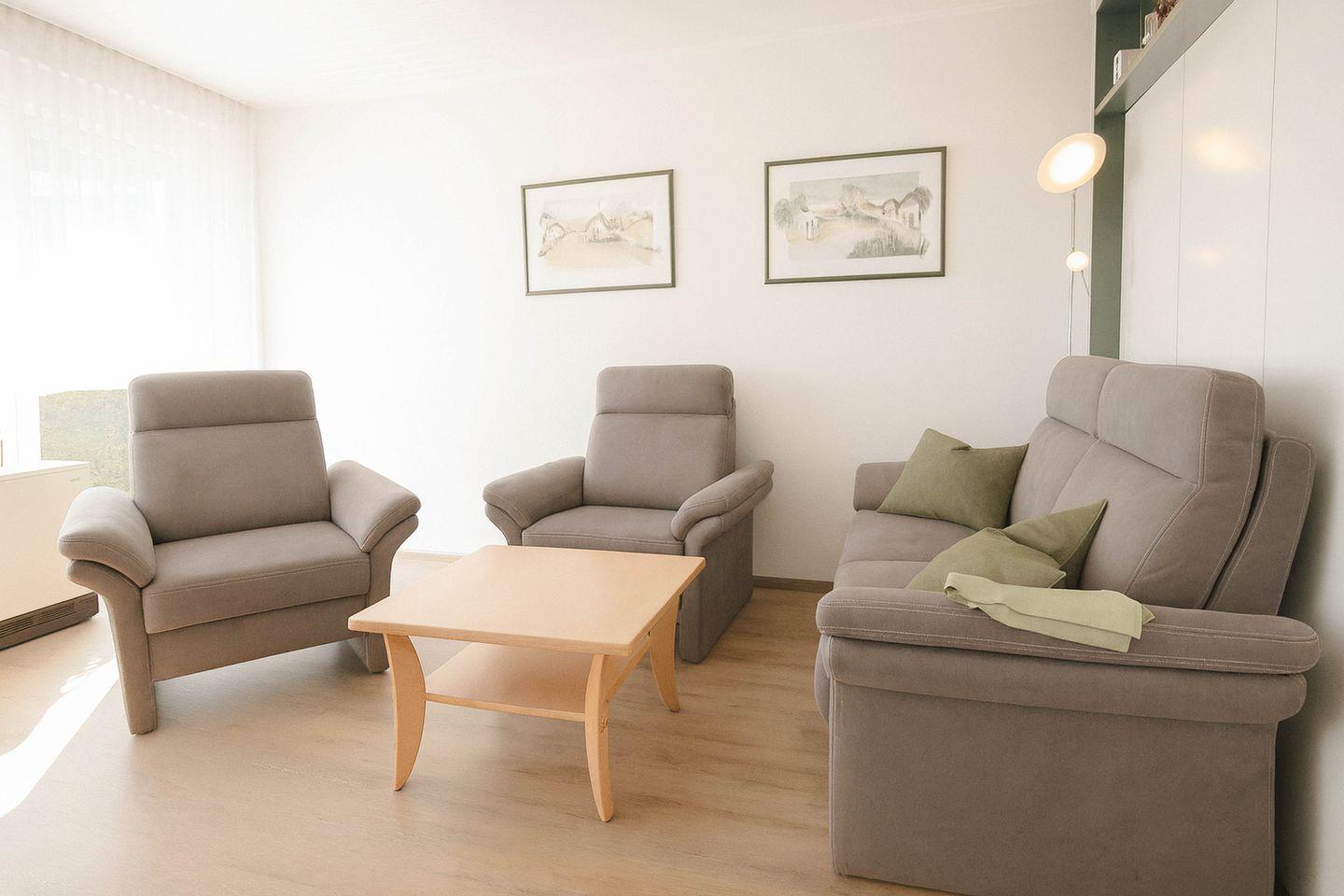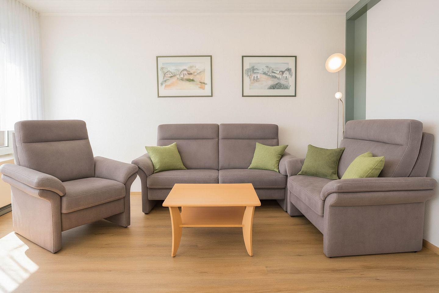 Das gemütliche Wohnzimmer ist lichtdurchflutet, geschmackvoll eingerichtet und lädt mit Flat-TV und Essecke zum Verweilen ein. Von hier aus gelangen Sie direkt auf den Balkon, von dem aus Sie einen wunderbaren Blick auf den Deich genießen können – perfekt für entspannte Stunden an der frischen Nordseeluft.