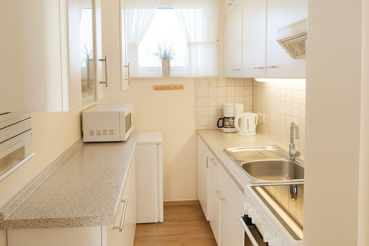 Der integrierte Essbereich bietet Platz für zwei Personen und schafft einen harmonischen Übergang zwischen Wohnen und Genießen. Das Schlafzimmer verfügt über zwei komfortable Einzelbetten, die am Fußende offen gestaltet sind und somit ein angenehmes Raumgefühl vermitteln. Für Selbstversorger steht eine separate, voll ausgestattete Küche zur Verfügung, in der Sie alles finden, was Sie für die Zubereitung Ihrer Lieblingsgerichte benötigen, darunter ein Backofen mit Cerankochfeld, Geschirrspülmaschine, Mikrowelle, Kühlschrank sowie Toaster, Wasserkocher und Kaffeemaschine.