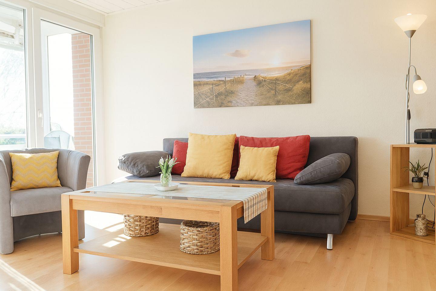 Auf rund 40 Quadratmetern Wohnfläche erwartet Sie eine geschmackvoll eingerichtete Unterkunft, die ideal für Nordseeliebhaber ist. Das helle Wohnzimmer lädt mit gemütlicher Atmosphäre zum Verweilen ein und ist mit einem Flachbildfernseher, DVD-Player und Radio ausgestattet. Von hier aus gelangen Sie direkt auf den Balkon, der besonders an sonnigen Tagen zum entspannten Frühstück oder zu einem Glas Wein am Abend einlädt.