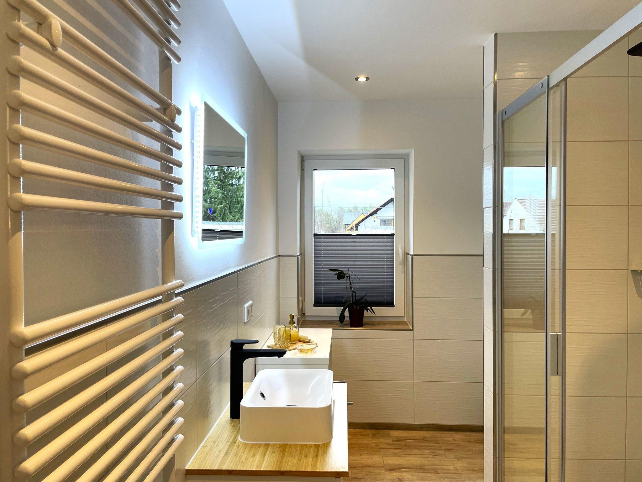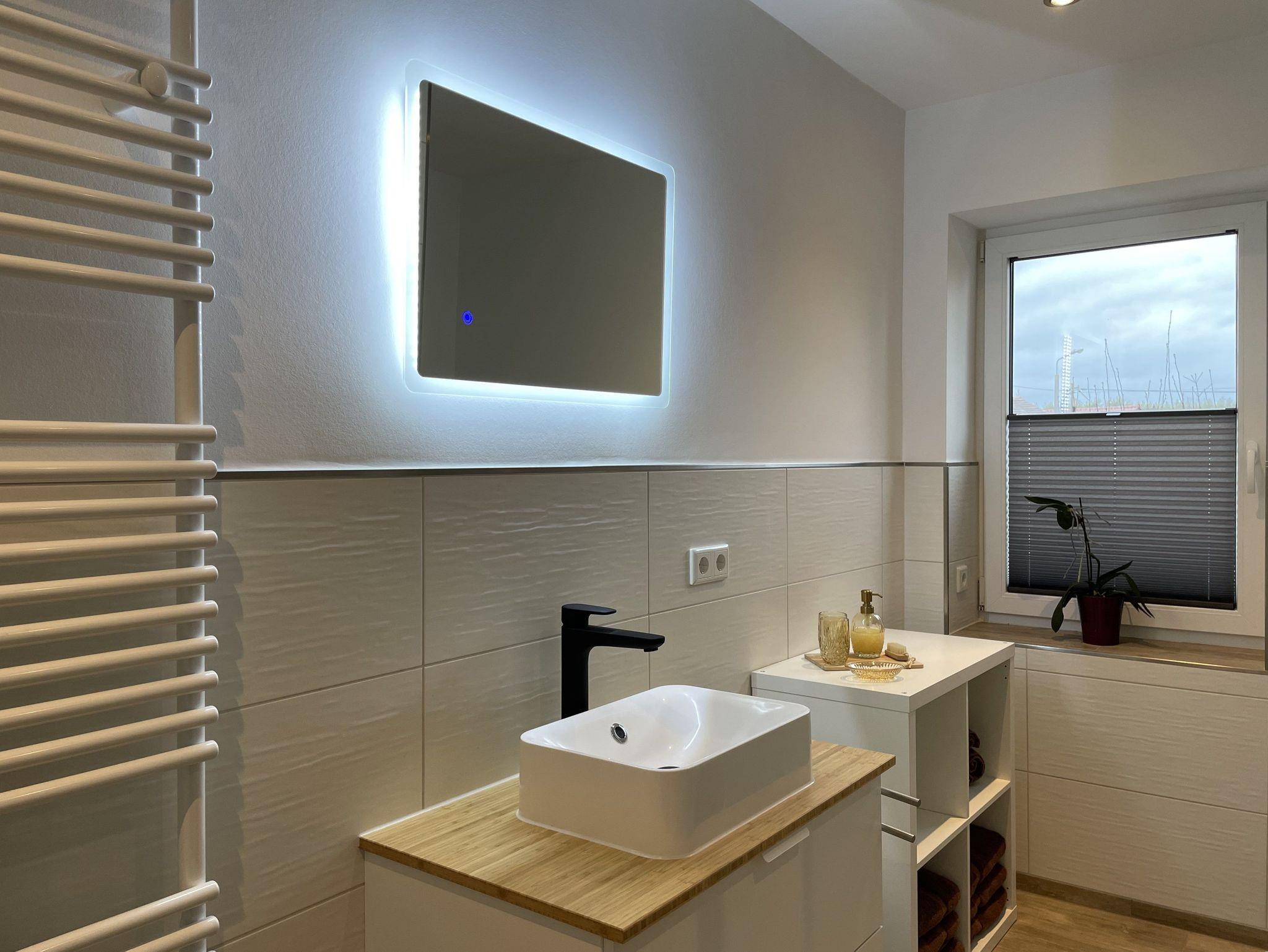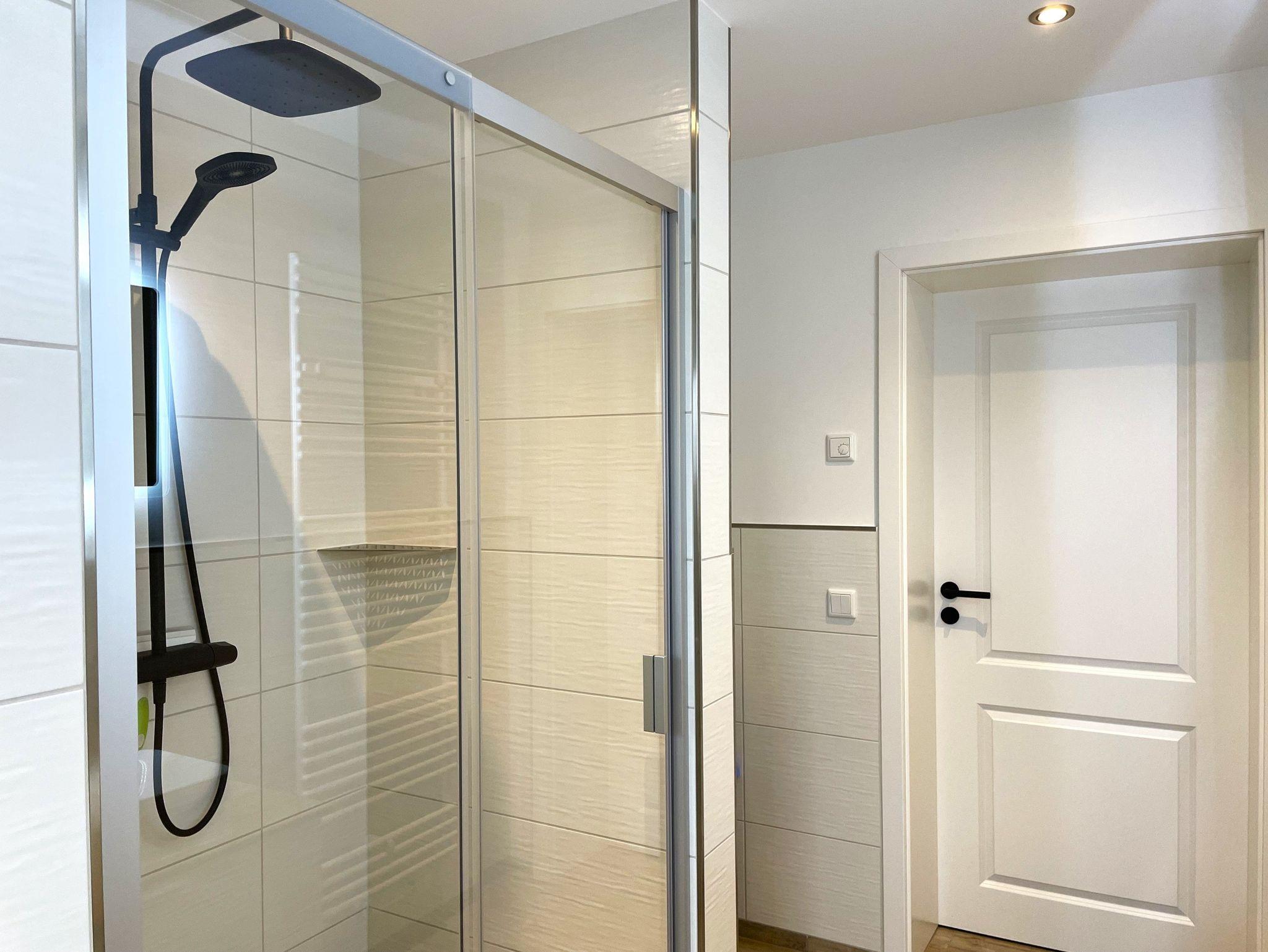 Das Badezimmer ist mit einer ebenerdigen Dusche, einem Waschtisch, einem WC und einer Waschmaschine ausgestattet. Auf Anfrage kann für Kleinkinder bis zu zwei Jahren ein Kinderbett zur Verfügung gestellt werden.