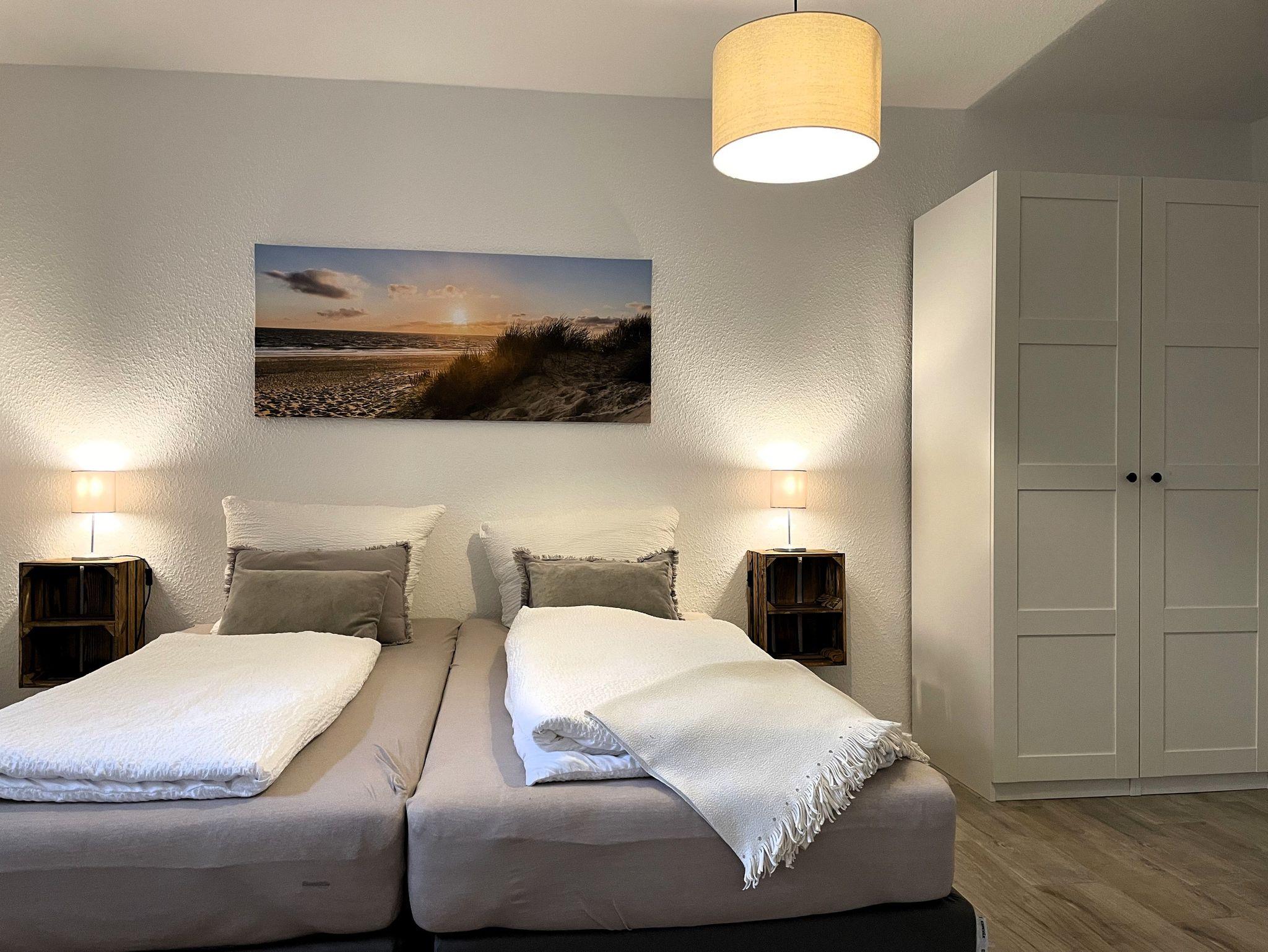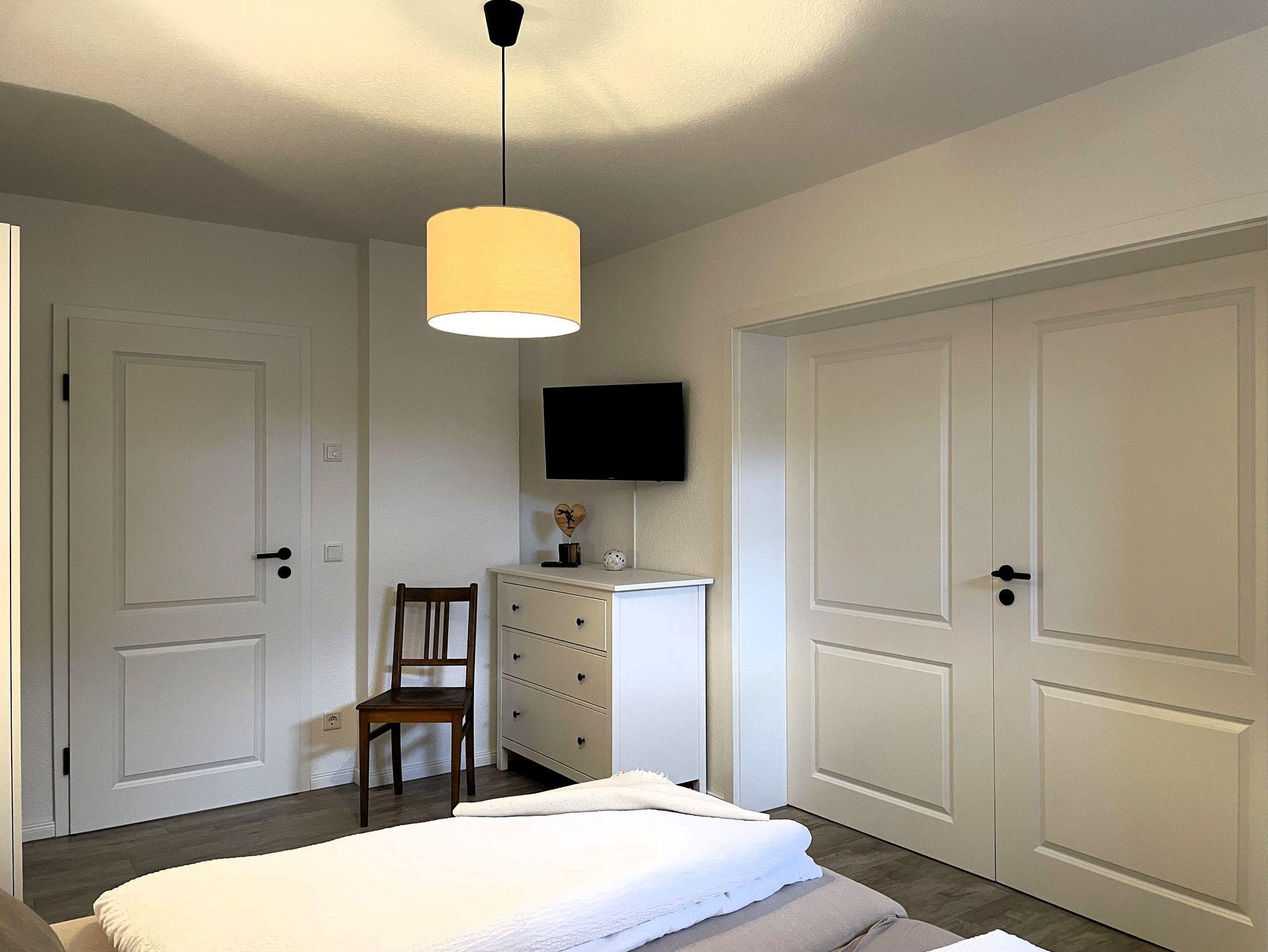 Die Wohnung verfügt über einen kombinierten Wohn- und Schlafbereich mit einem Schlafsofa sowie zwei weitere Schlafzimmer, die jeweils mit einem komfortablen Doppelbett und Schränken ausgestattet sind. Für Unterhaltung sorgt ein Flachbildfernseher.