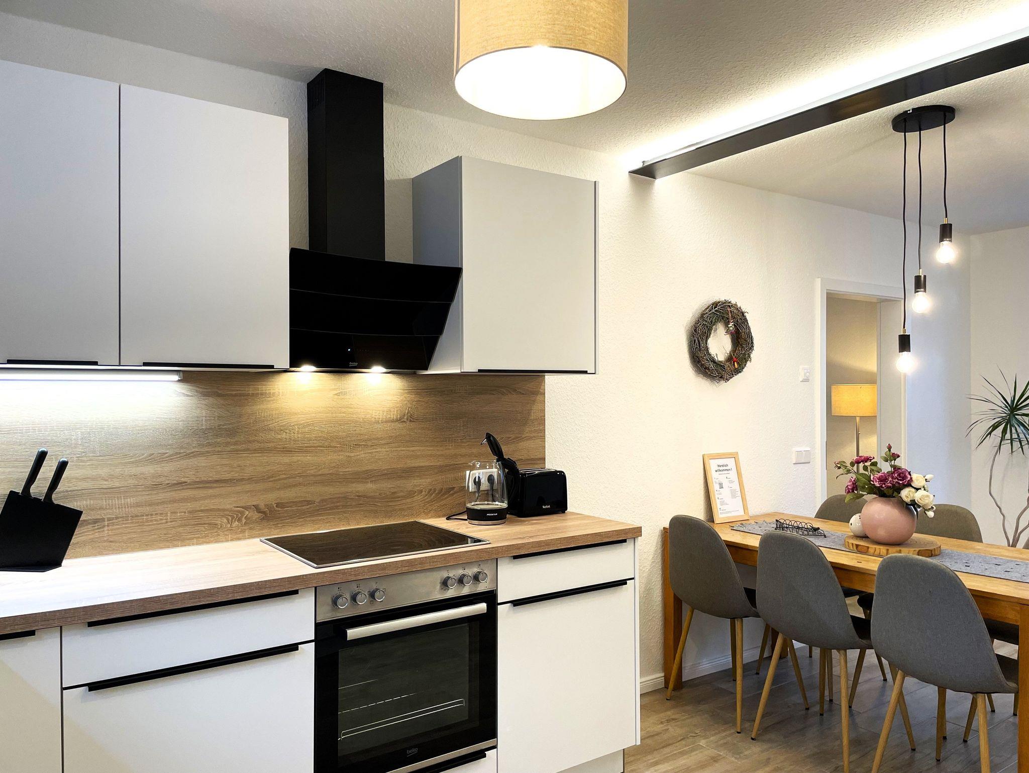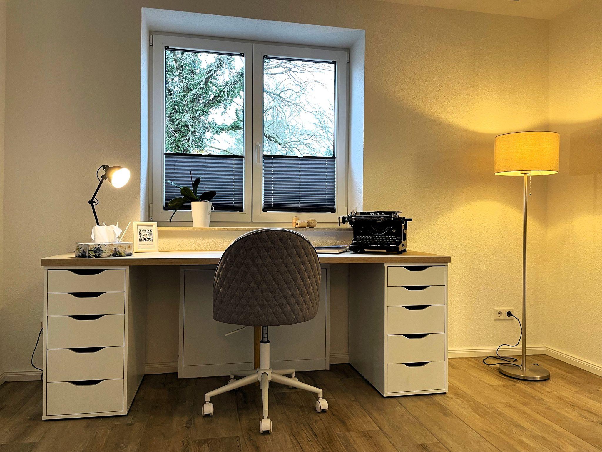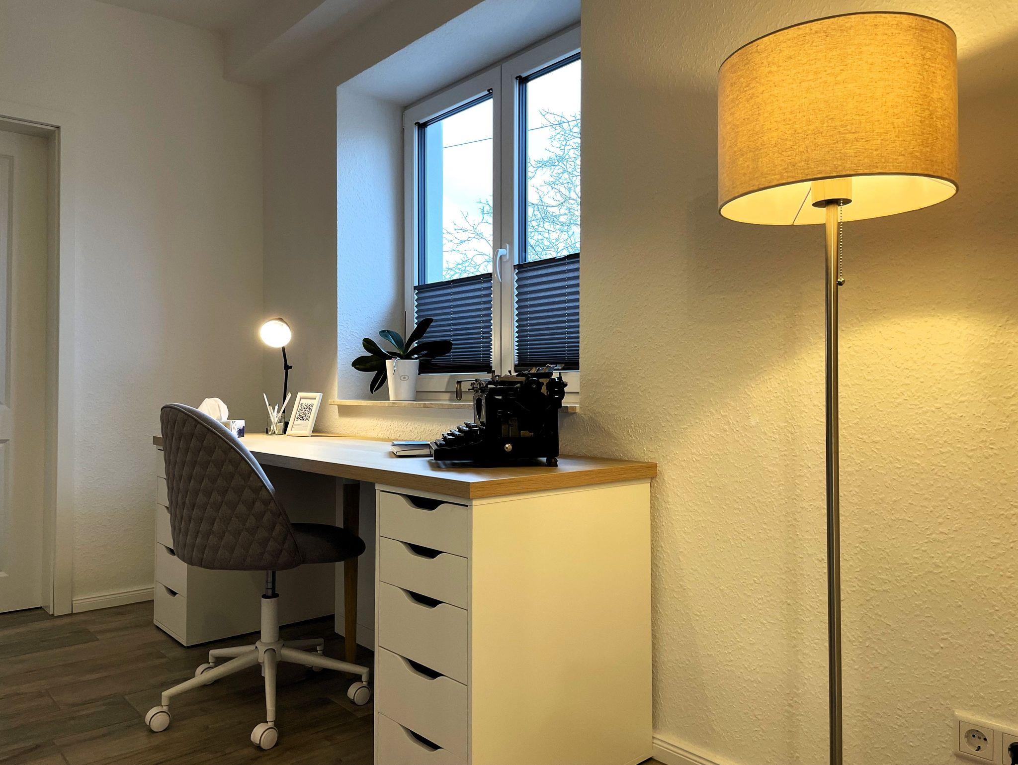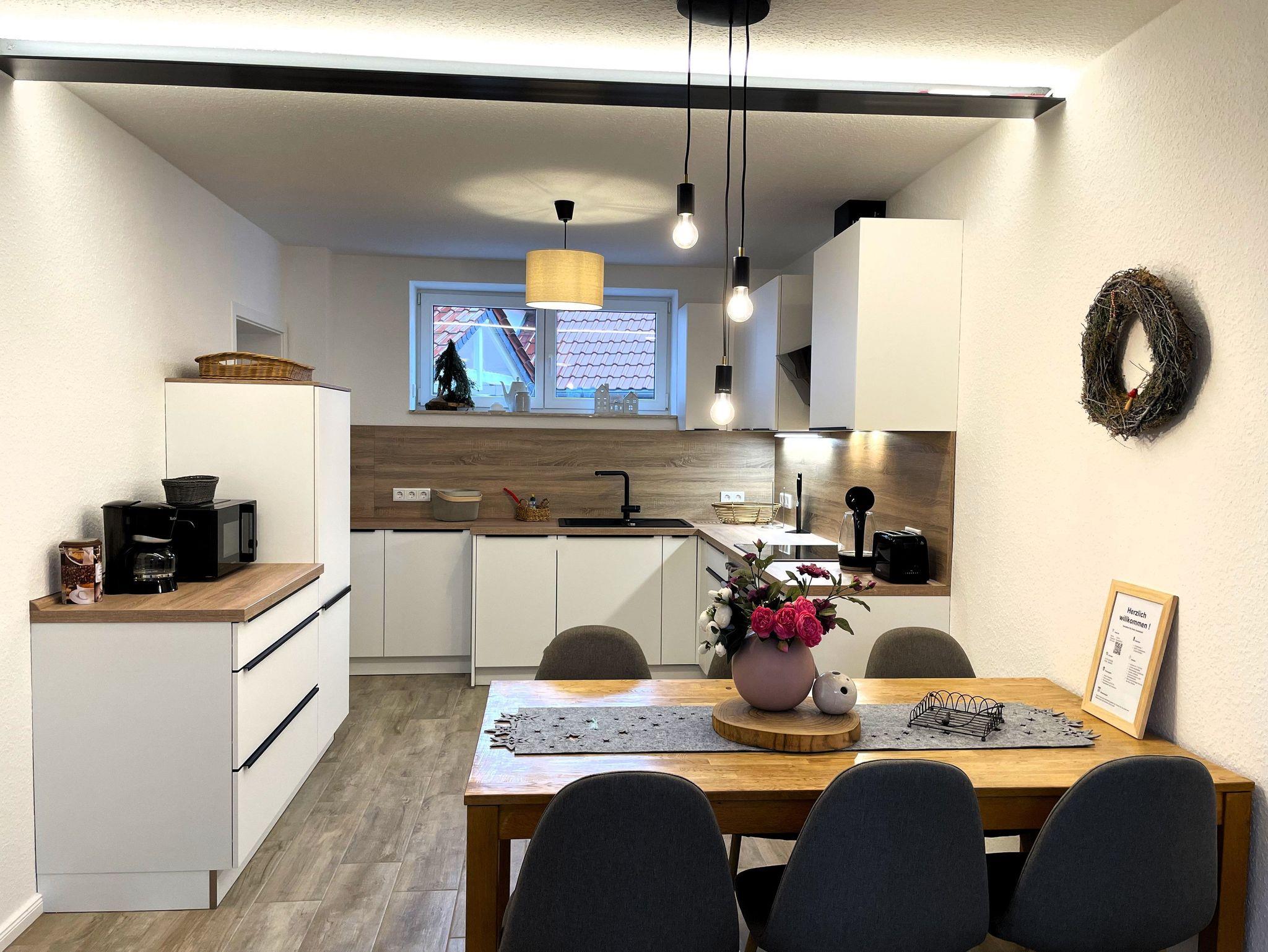 Die geräumige Küche bietet nicht nur genügend Platz zum gemeinsamen Kochen, sondern auch für gesellige Spieleabende und den Austausch über die Erlebnisse des Tages. Sie ist mit einem Kühlschrank inklusive Gefrierfach, einer Spülmaschine, einem Backofen, einer Mikrowelle und vielen weiteren Annehmlichkeiten ausgestattet. Zudem gibt es ein kleines Arbeitszimmer mit einem Schreibtisch.