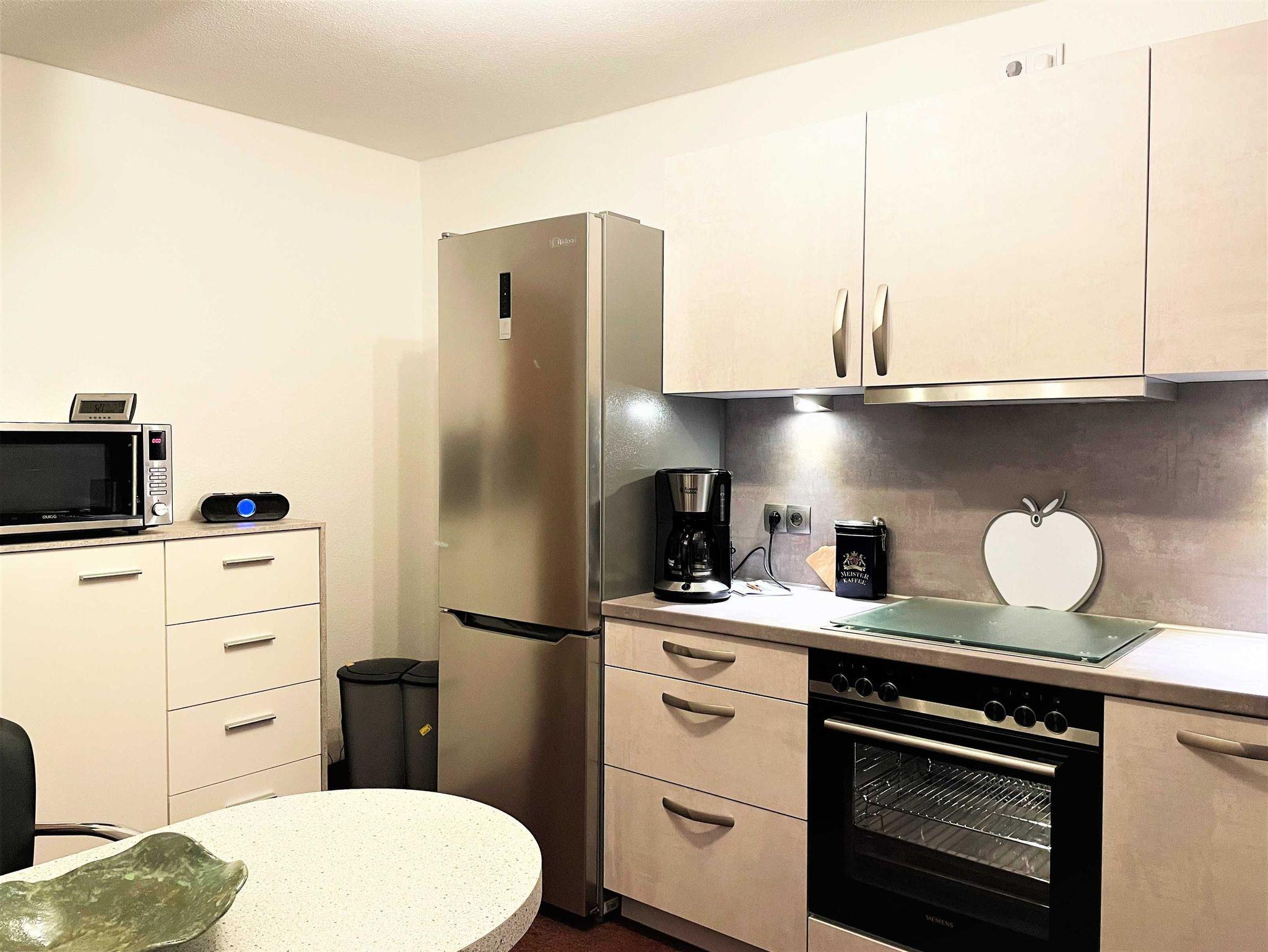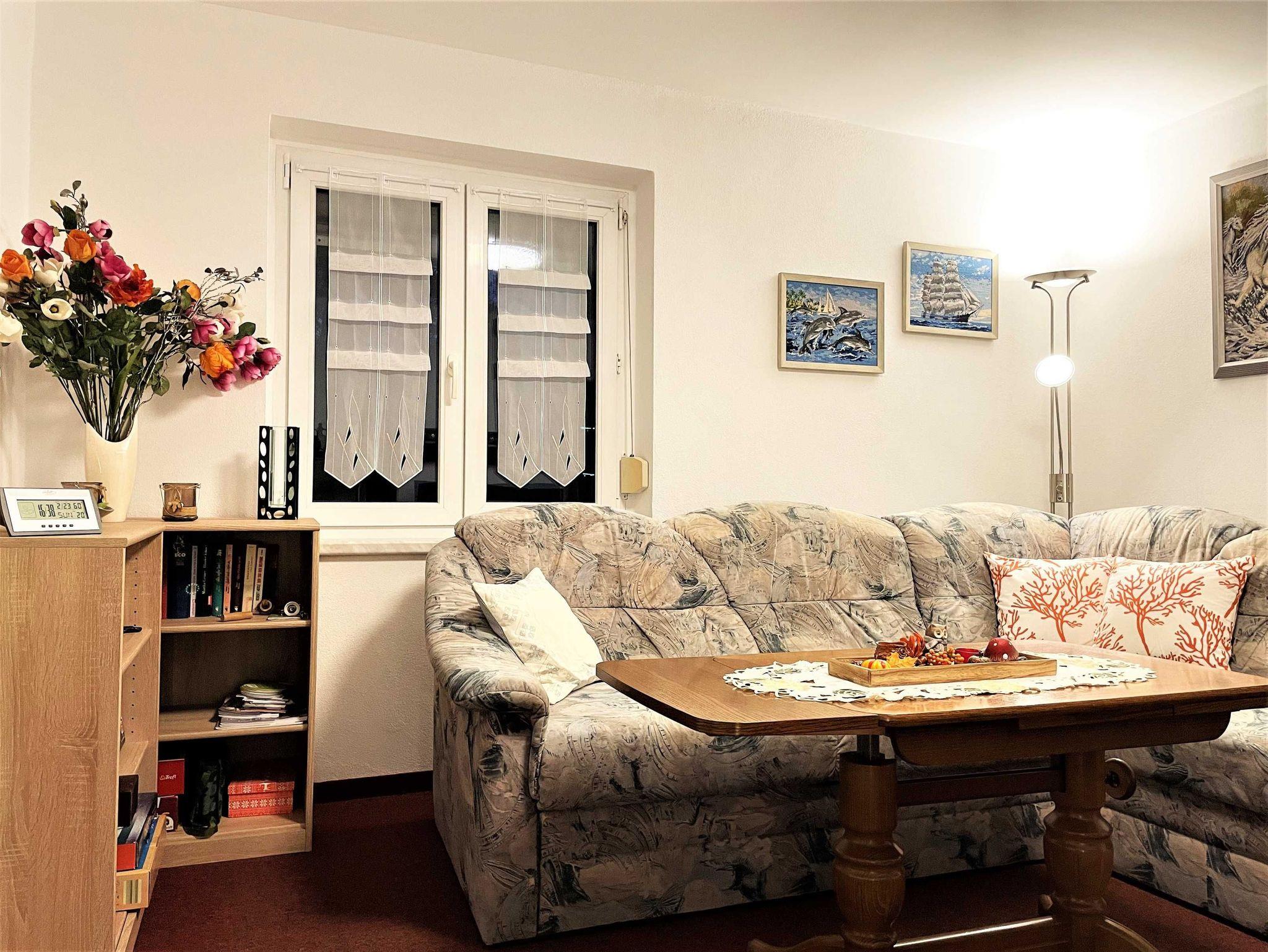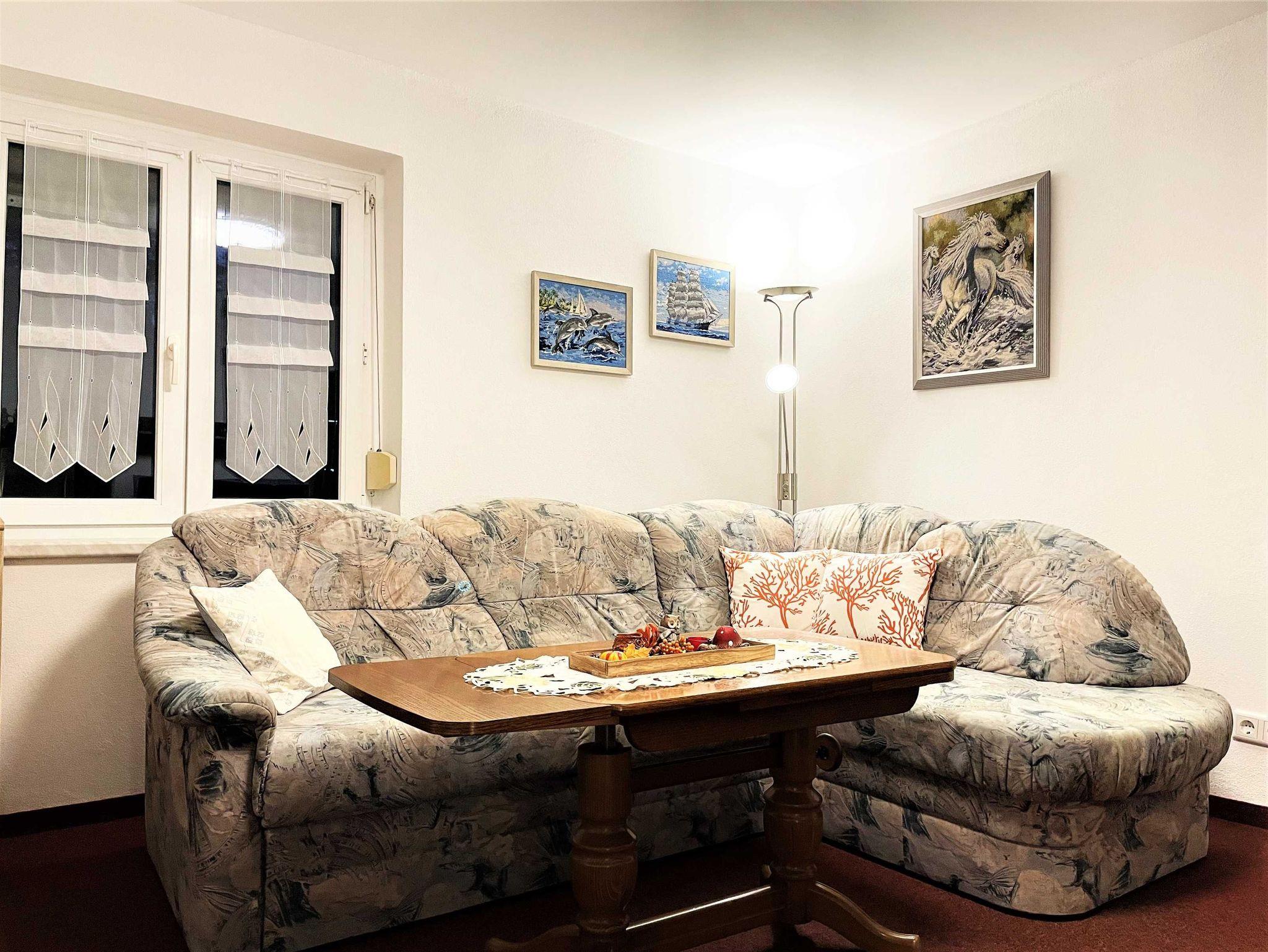 Die 43 m² große Nichtraucher Ferienwohnung ist für 2 Personen ideal geeignet und befindet sich in der 1. Etage. Sie verfügt über ein Wohnzimmer, Schlafzimmer, eine separate Küche und ein Bad. Für gemütliche Stunden sorgen ein Ecksofa mit Schlaffunktion sowie ein großer TV-Flachbildschirm. Das Schlafzimmer verfügt über ein Doppelbett, einen großen Kleiderschrank und 2 Sessel. Auf Wunsch können die Betten auch einzeln sowie ein Kinderbett für ein Kind bis zu zwei Jahren gestellt werden. In der komplett eingerichteten Küche können Gäste ihre Mahlzeiten einnehmen und finden viele Annehmlichkeiten wie zum Beispiel einen Geschirrspüler, Backofen, Mikrowelle und vieles mehr. Das kleine Bad ist mit einer Dusche und WC ausgerüstet. Für weitere entspannte Stunden sorgt die hauseigene Sauna, die auch den Gästen zur Verfügung steht.