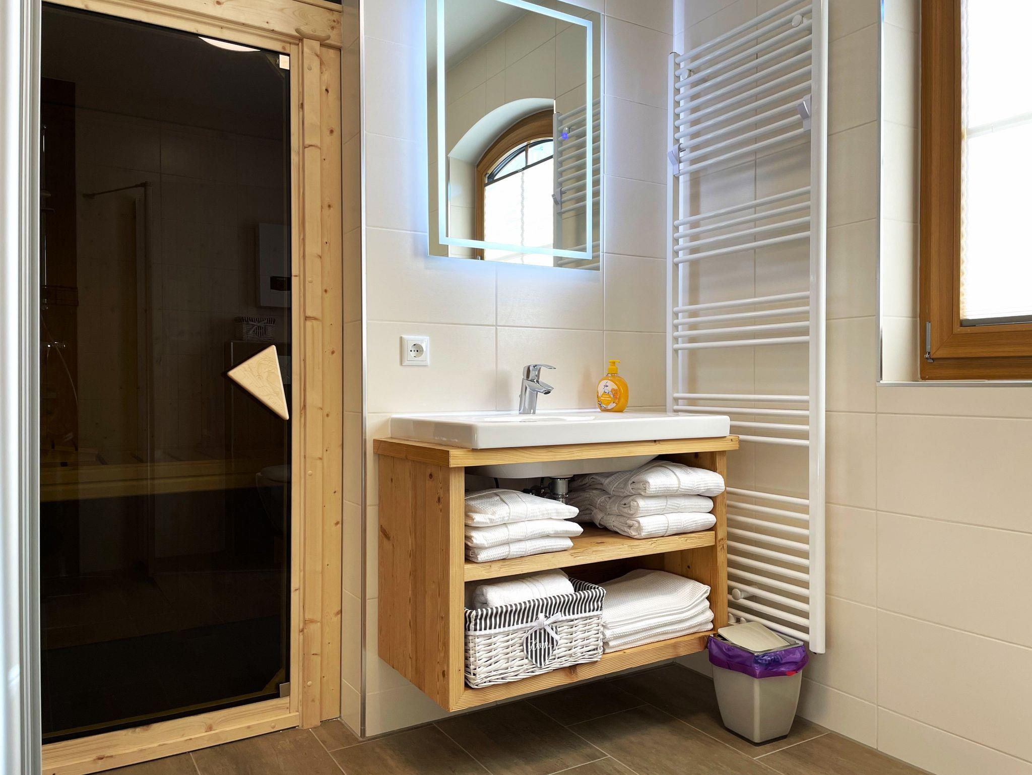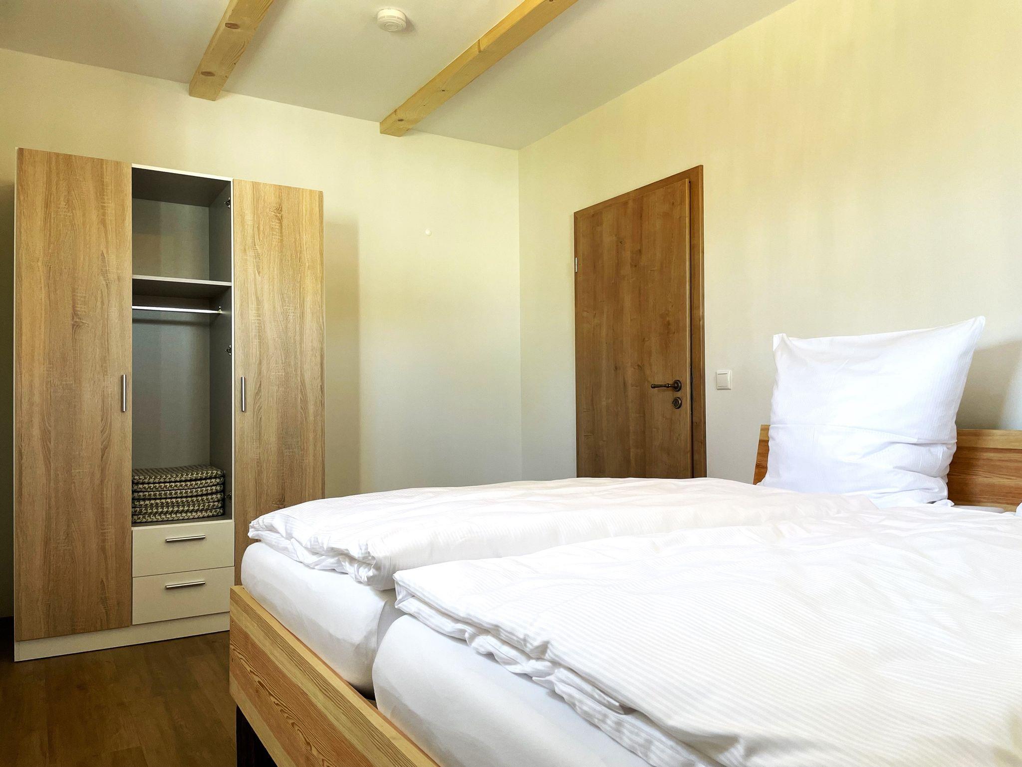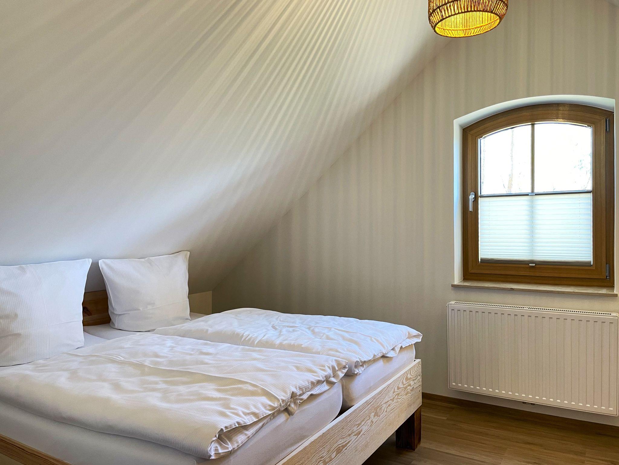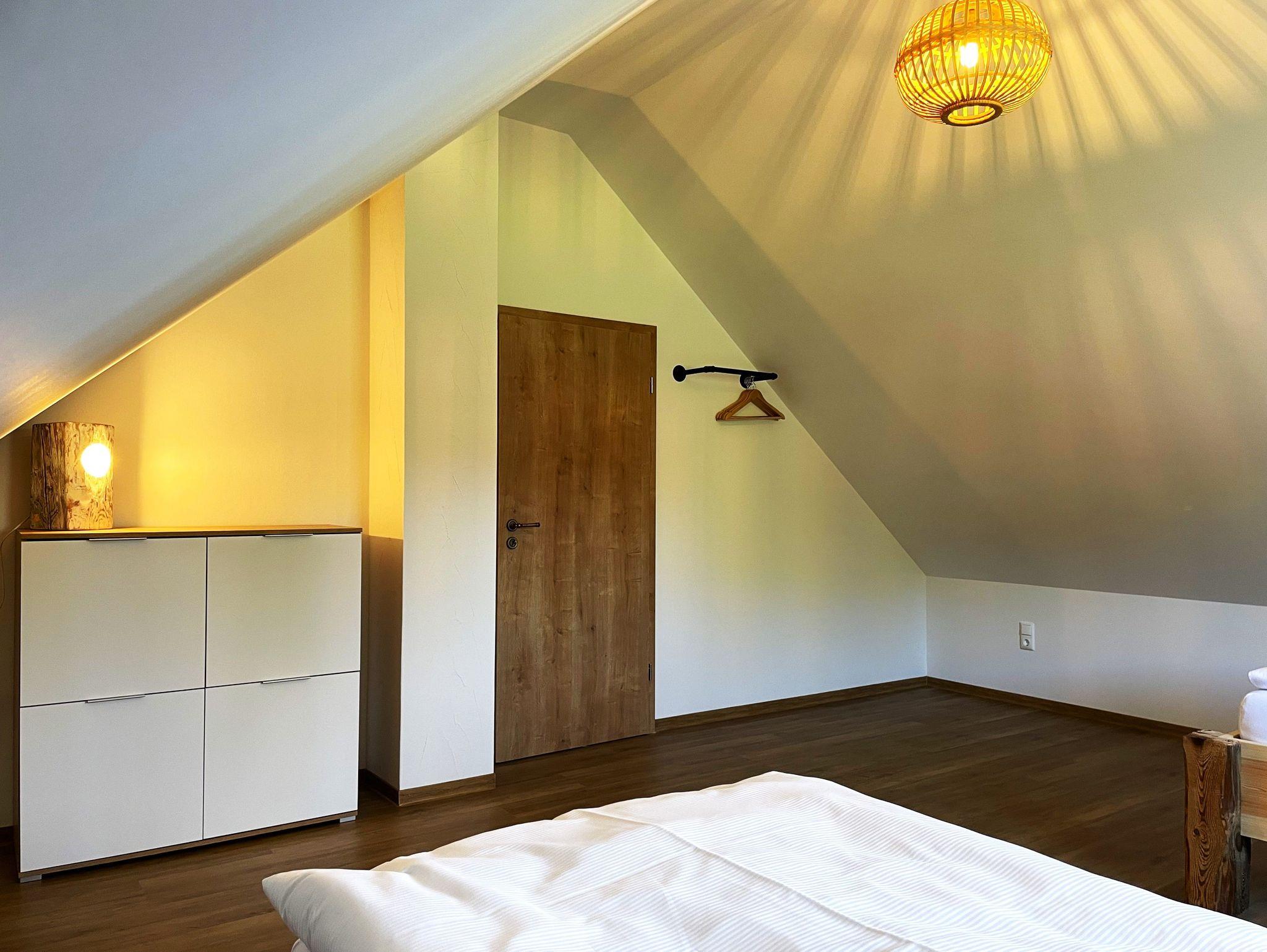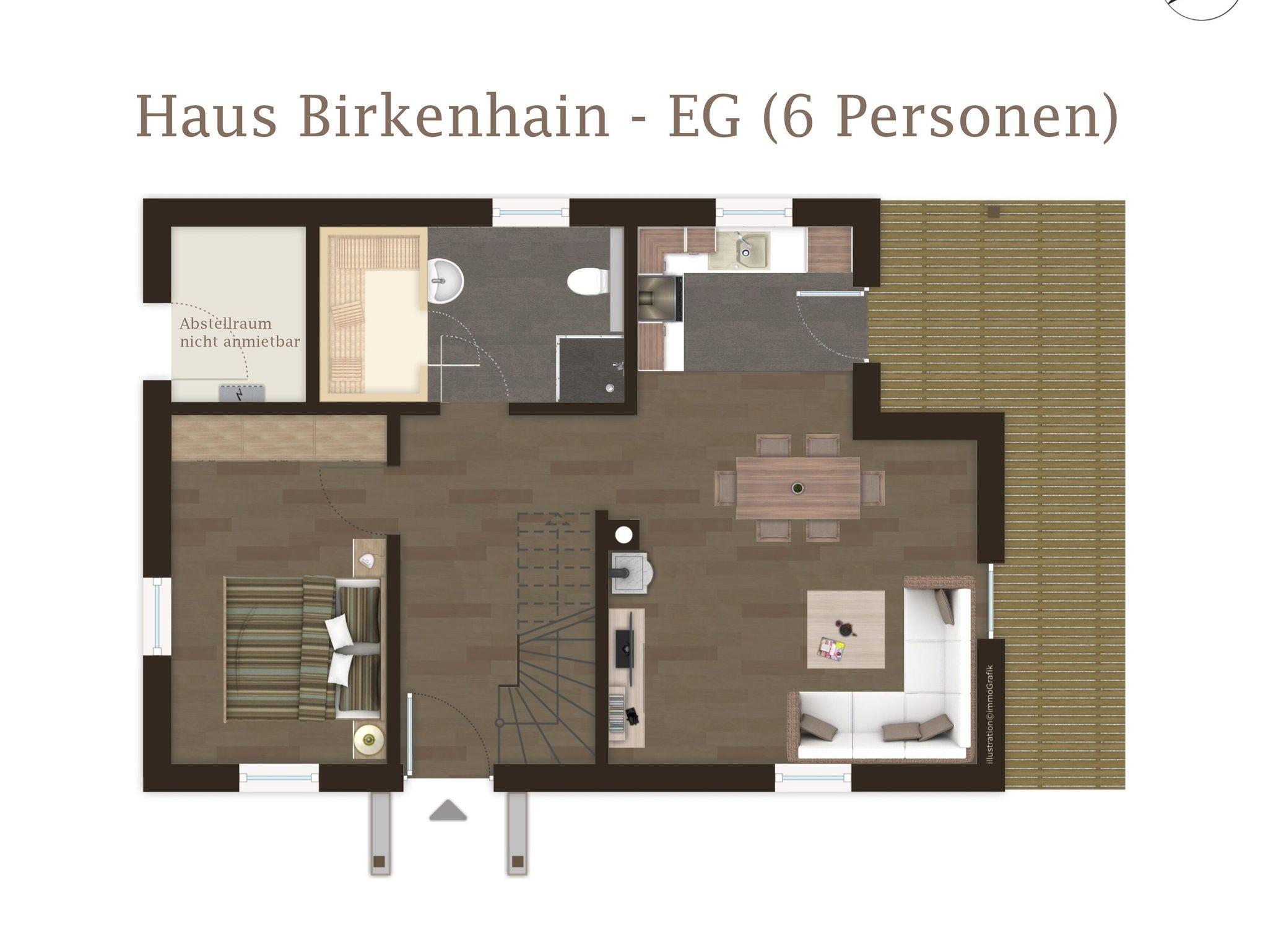 Ein besonderes Highlight ist der Kamin, der zu jeder Jahreszeit für Gemütlichkeit und wohlige Wärme sorgt. Im Erdgeschoss befindet sich außerdem ein Schlafzimmer, das mit einem Doppelbett und einem Kleiderschrank ausgestattet ist. Ebenfalls im Erdgeschoss befindet sich ein Badezimmer mit ebenerdiger Dusche, Waschtisch und WC. Eine integrierte Sauna sorgt für zusätzlichen Komfort. Über eine Treppe gelangt man in die obere Etage, wo sich zwei weitere Schlafzimmer befinden. Hier kann man wählen, ob man in zwei getrennten Betten schlafen möchte oder ein Doppelbett bevorzugt. Eine kleine Gästetoilette mit Waschbecken und WC befindet sich ebenfalls im Obergeschoss. Von der Terrasse gelangt man direkt ins Freie. Die gemütlichen Terrassenmöbel laden zum Verweilen ein - sei es, um die frische Luft zu genießen, zum Essen oder einfach nur zum Entspannen. Die Terrasse ist ein idealer Ort, um die ländliche Ruhe zu erleben und die Schönheit der Natur zu spüren. Im Ferienhaus “Birkenhain” lassen Sie den hektischen Alltag für eine Weile zu Hause und genießen einfach die Natur.