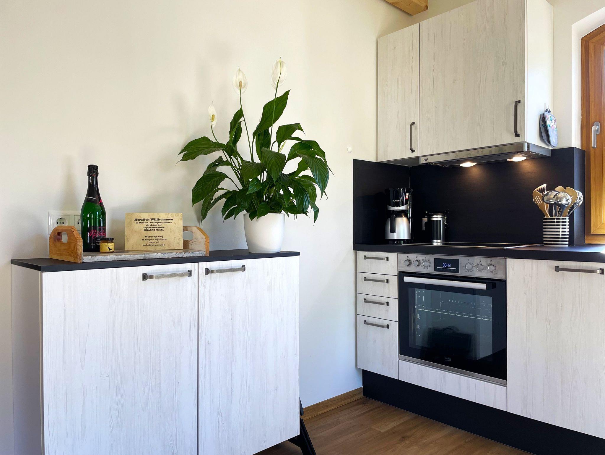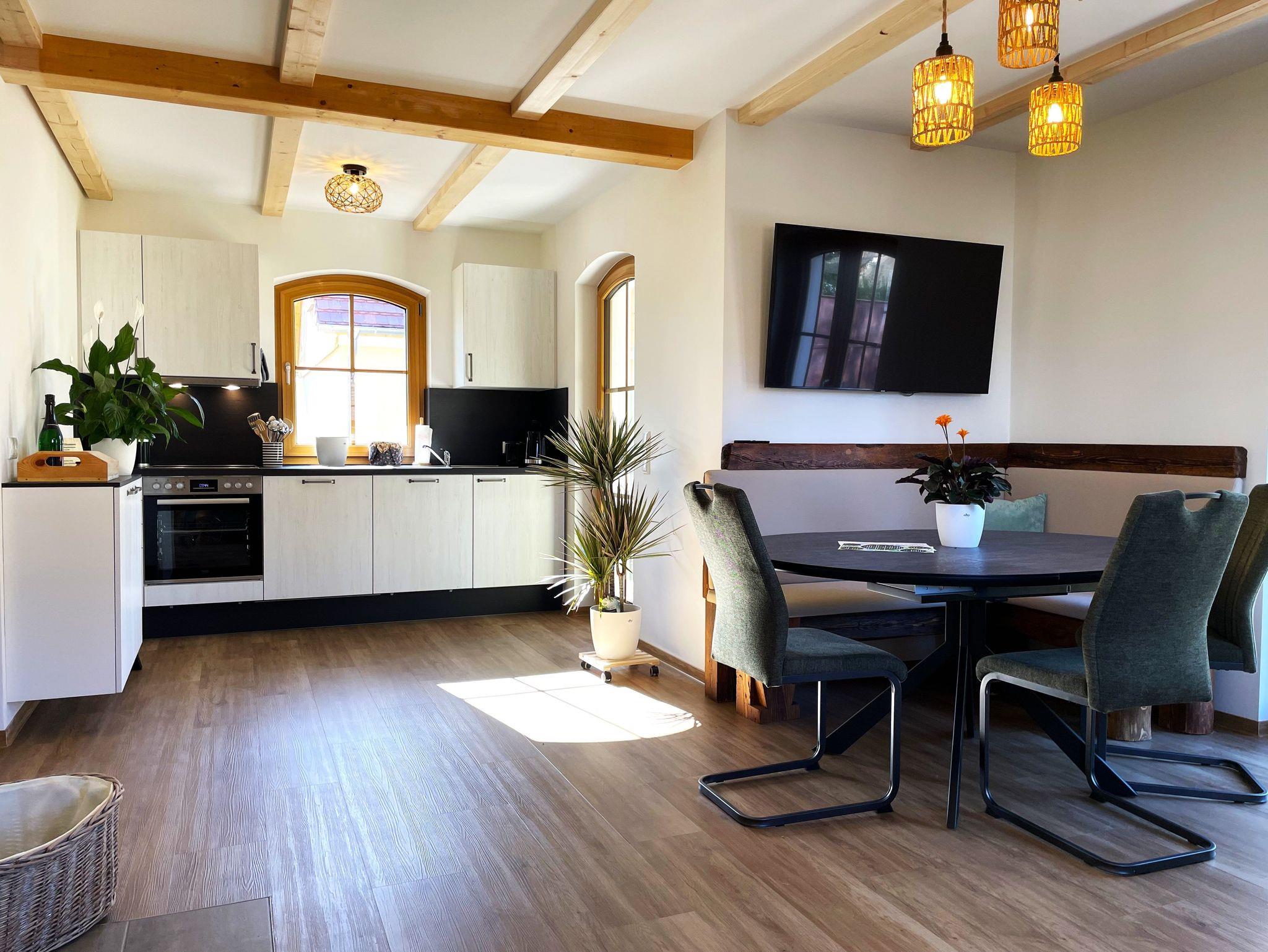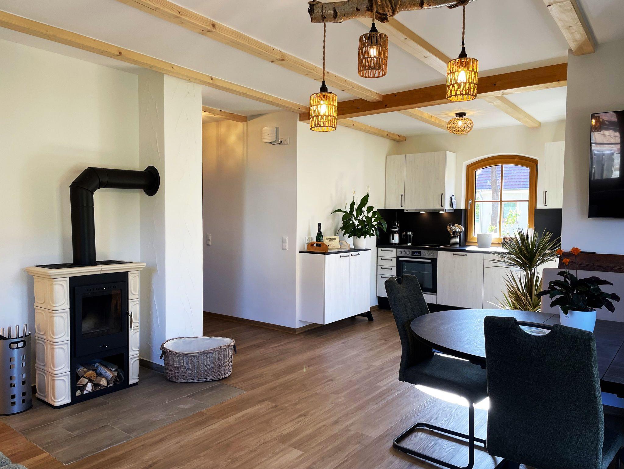 Herzstück des Ferienhauses ist der großzügige Wohnbereich mit offener Küche. Die in hellen Farben gehaltene Einbauküche und die modernen Geräte - Backofen, Kühlschrank mit Gefrierfach, Geschirrspüler, Kaffeemaschine, Toaster und Wasserkocher - laden zum gemeinsamen Kochen, Spielen und Fernsehen ein. Ein gemütliches Sofa und eine Essecke ermöglichen es den Gästen, die Mahlzeiten in harmonischer Atmosphäre zu genießen.