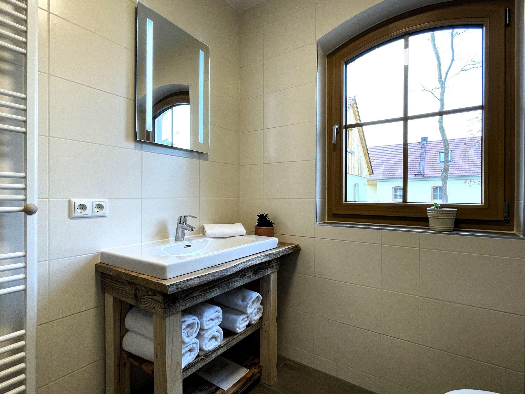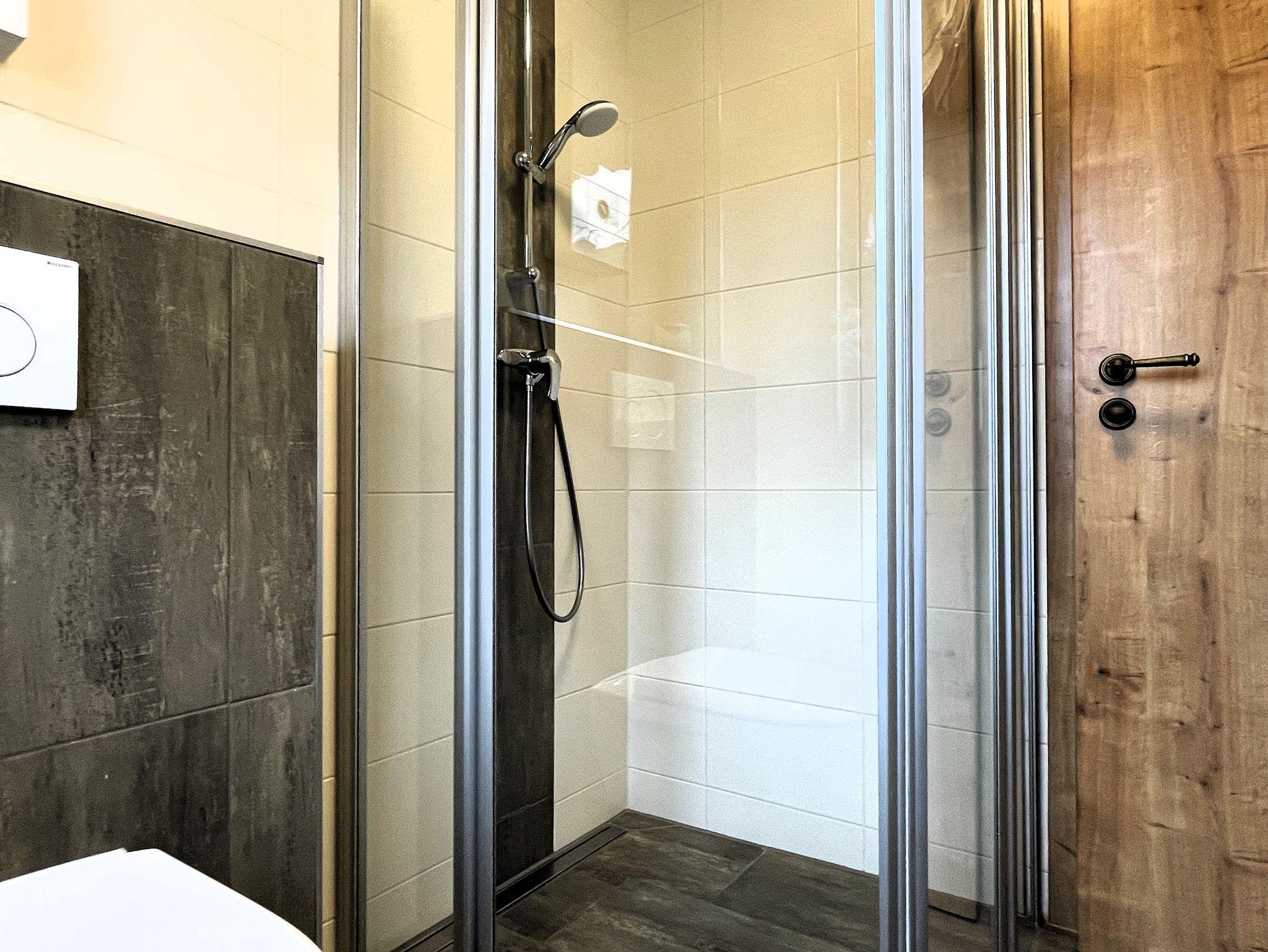Das Badezimmer ist modern eingerichtet und verfügt über eine ebenerdige Dusche, einen Waschtisch mit Spiegel sowie Handtuchwärmer und WC. Hier können Sie sich nach einem erlebnisreichen Tag erfrischen.