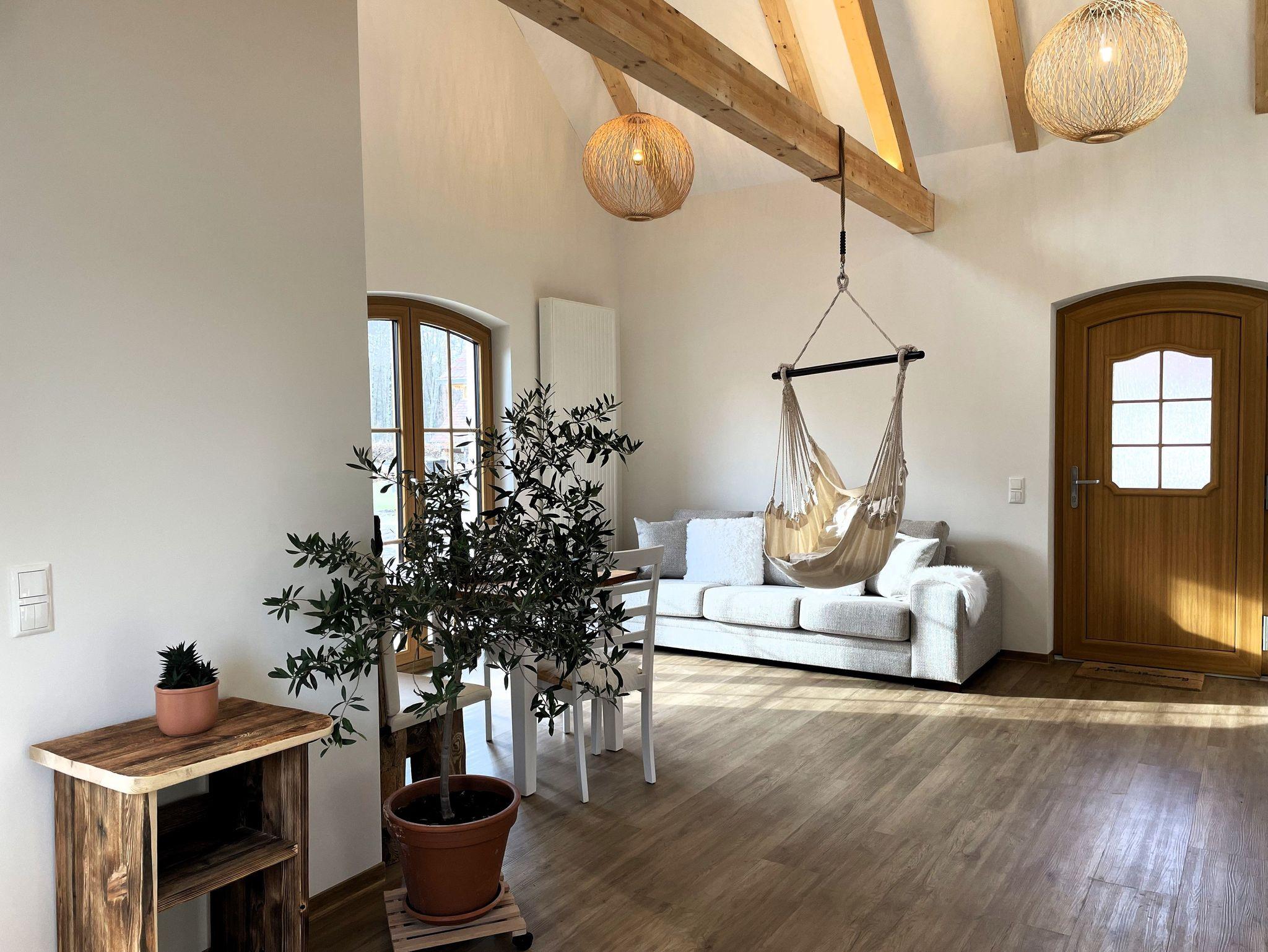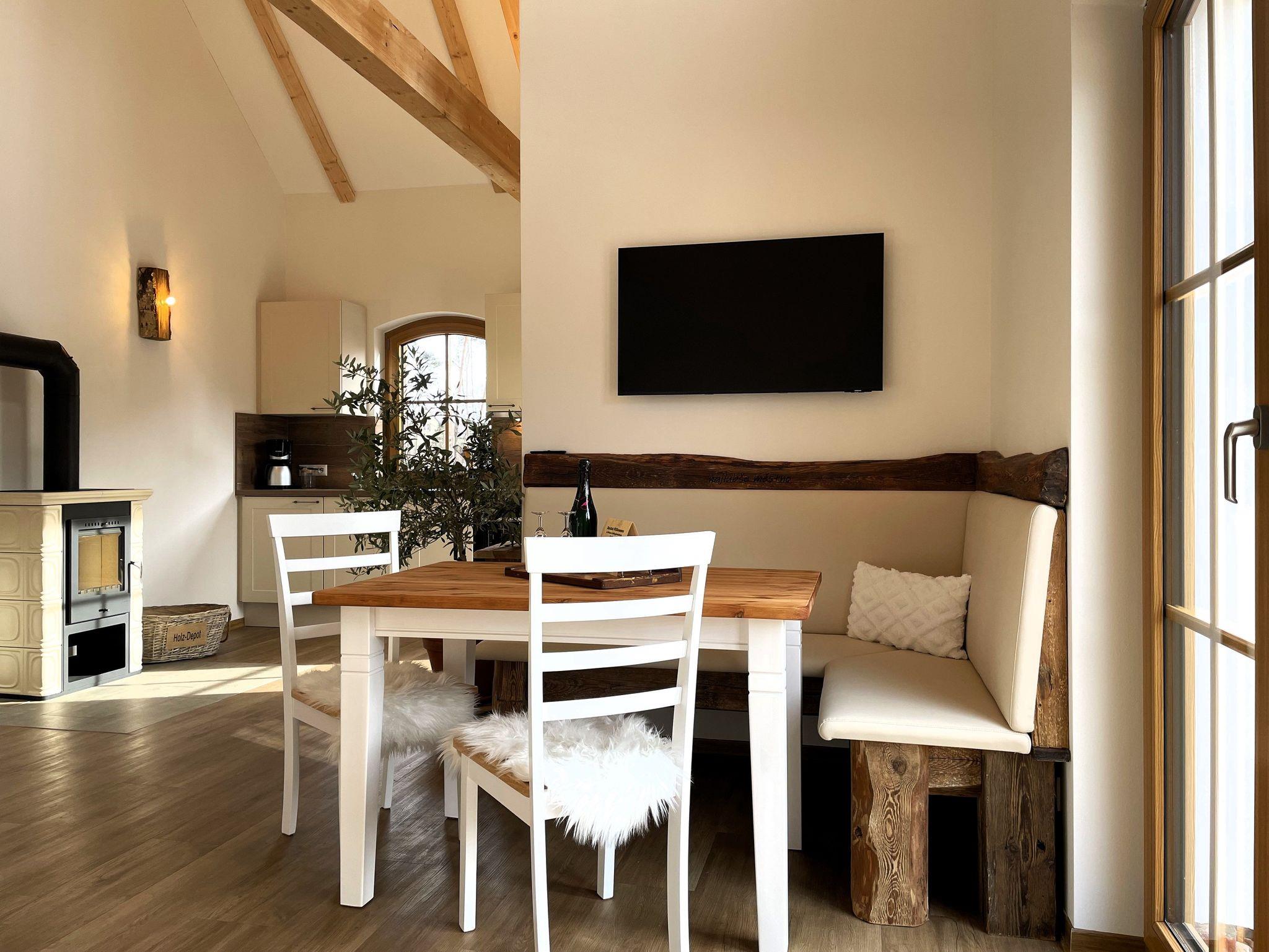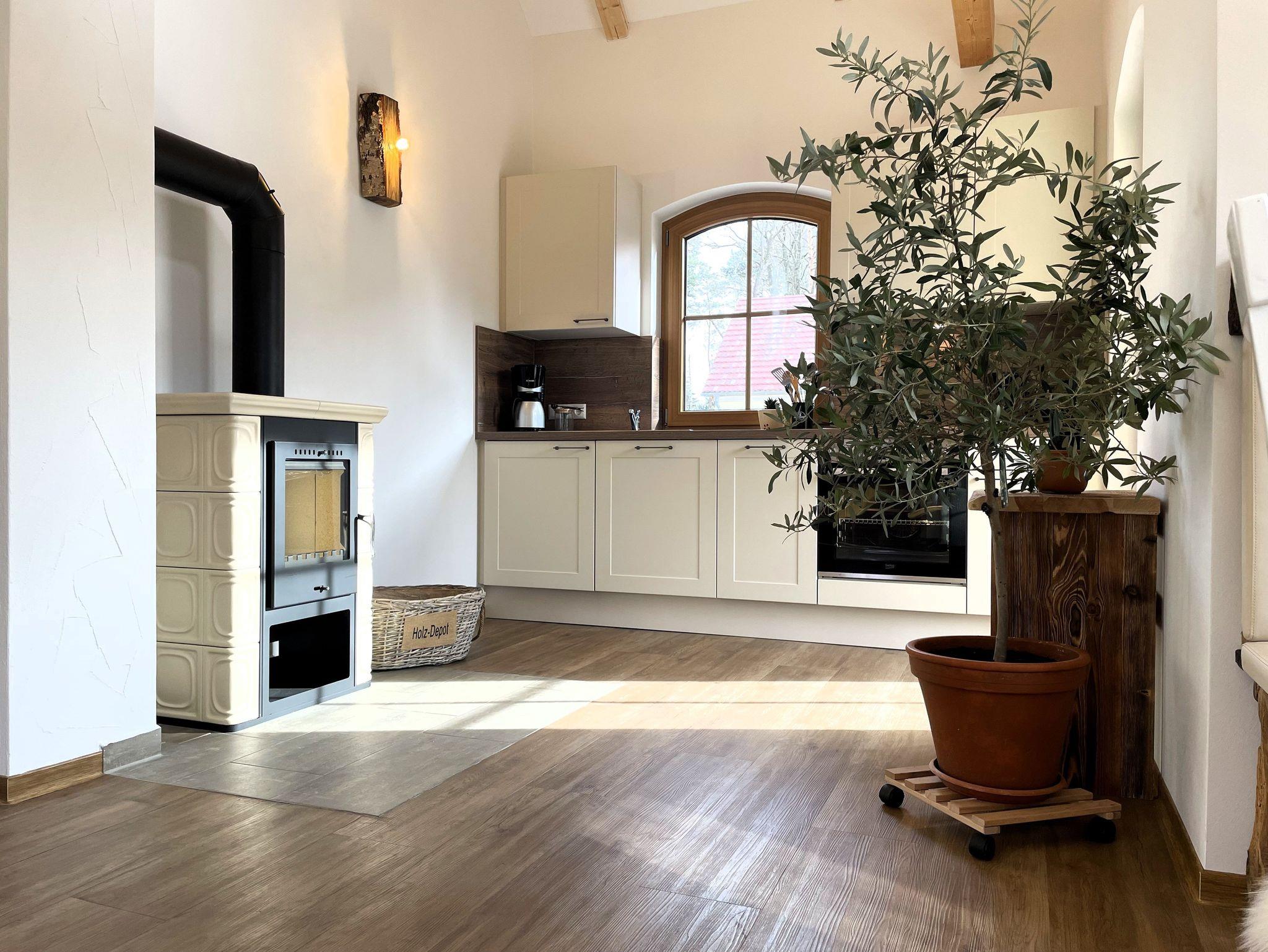 Das Ferienhaus besticht durch seinen offenen Dachstuhl, der der Unterkunft optisch Größe verleiht. Die verarbeiteten Holzbalken im Dachstuhl schaffen eine natürliche, rustikale und stilvolle Atmosphäre, die zum Wohlfühlen einlädt. Ein besonderes Highlight ist der Kamin, der zu jeder Jahreszeit für eine gemütliche Atmosphäre und wohlige Wärme sorgt.