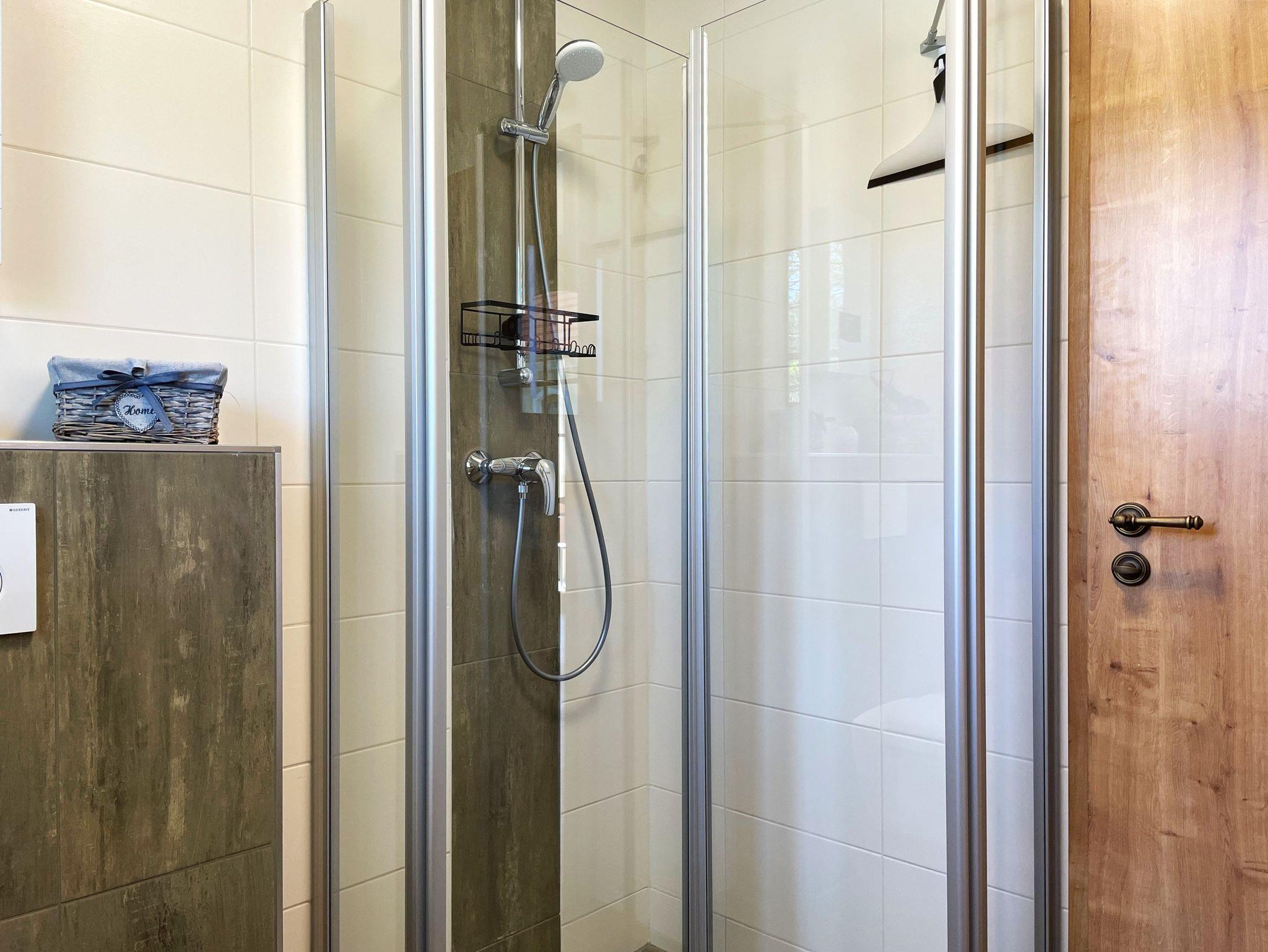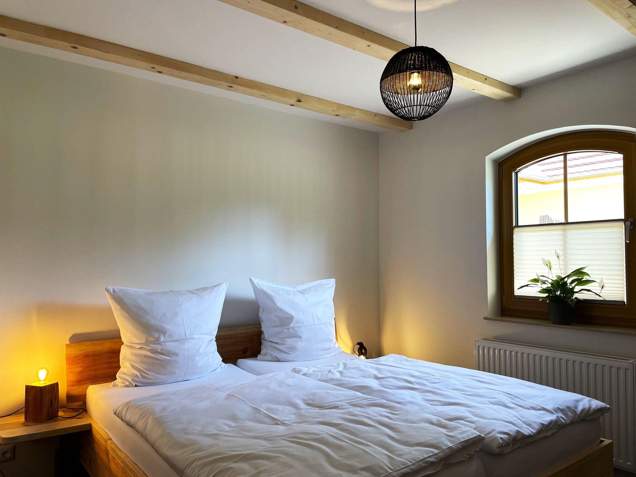 Die zwei Schlafzimmer sind mit handgefertigten Doppelbetten oder getrennt stehenden Einzelbetten ausgestattet. Die Betten sind bereits bezogen und versprechen erholsamen Schlaf. Das moderne Badezimmer bietet eine ebenerdige Dusche, einen Waschtisch mit Spiegel, einen Handtuchwärmer und ein WC.